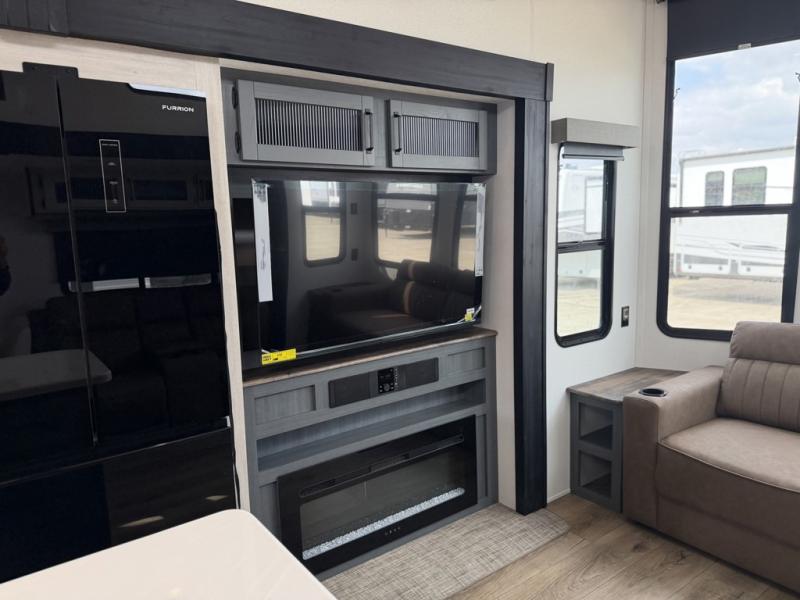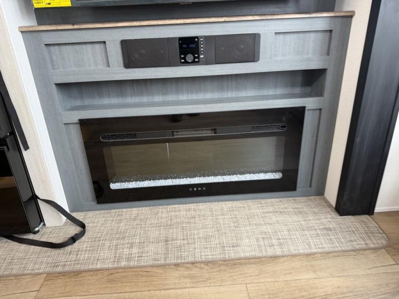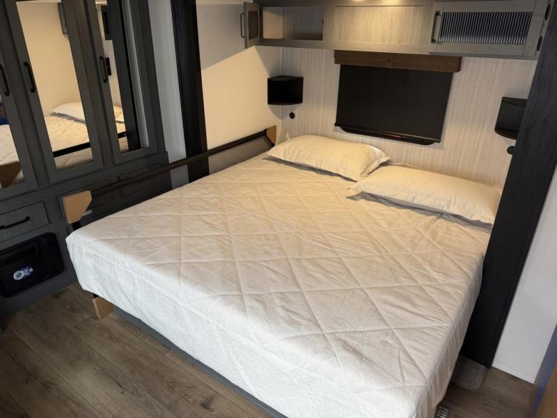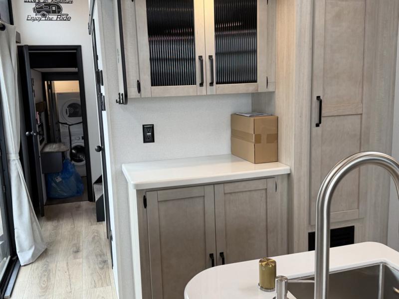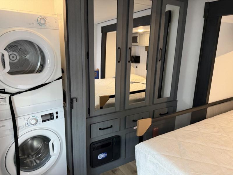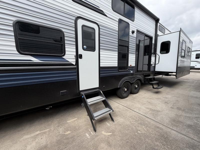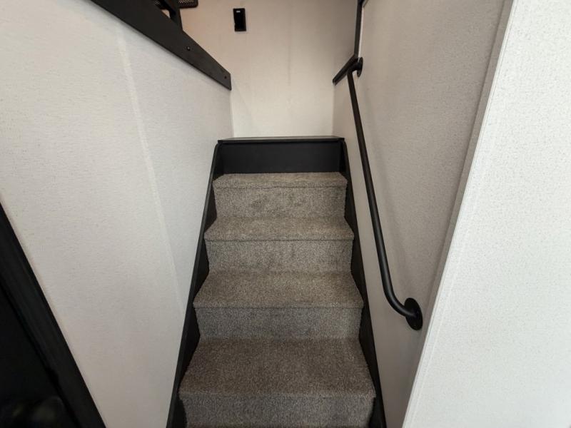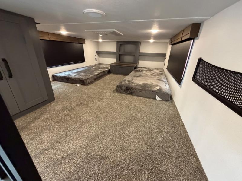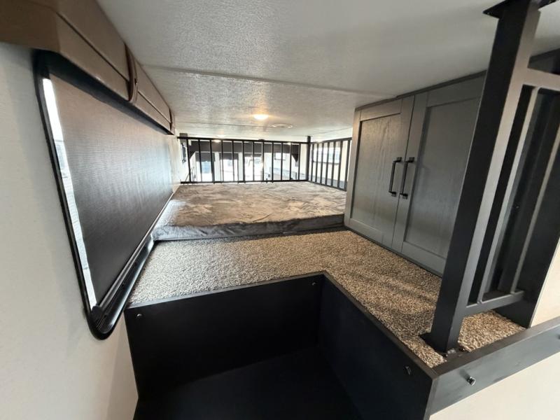 Wherever your destination may be, you can be sure to enjoy it to the fullest with this trailer in tow! With two entry doors, you can enter in through the rear private bedroom or the main living area. The bedroom includes a king bed slide out, a wardrobe/closet to keep your clothes organized, plus a closet with washer and dryer prep. Just outside this room are steps that lead to the large loft area with a 58" x 58" bunk mat and a cabinet on one side, plus two 32" x 69" bunk mats on the other. There is also a cabinet and a wardrobe/closet for plenty of storage space. Once you've headed back downstairs, you can relax on the theater seating, front sofa, or table and chairs with a bench seating. And the chef of your group will love the kitchen with its residential style refrigerator and pantry, kitchen island, and four burner cooktop!