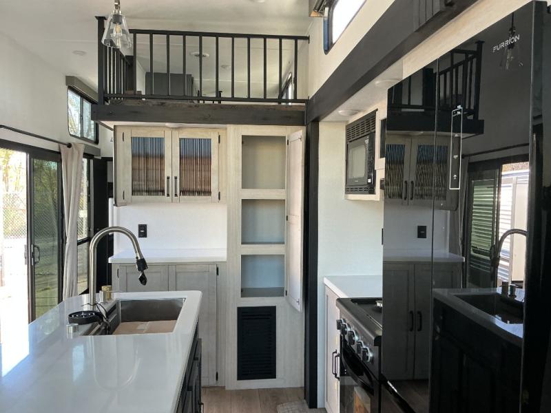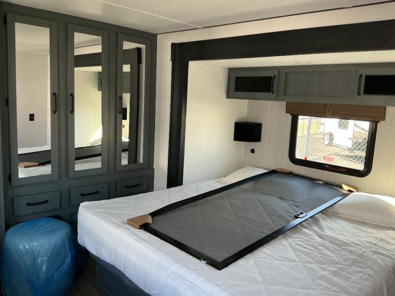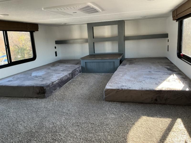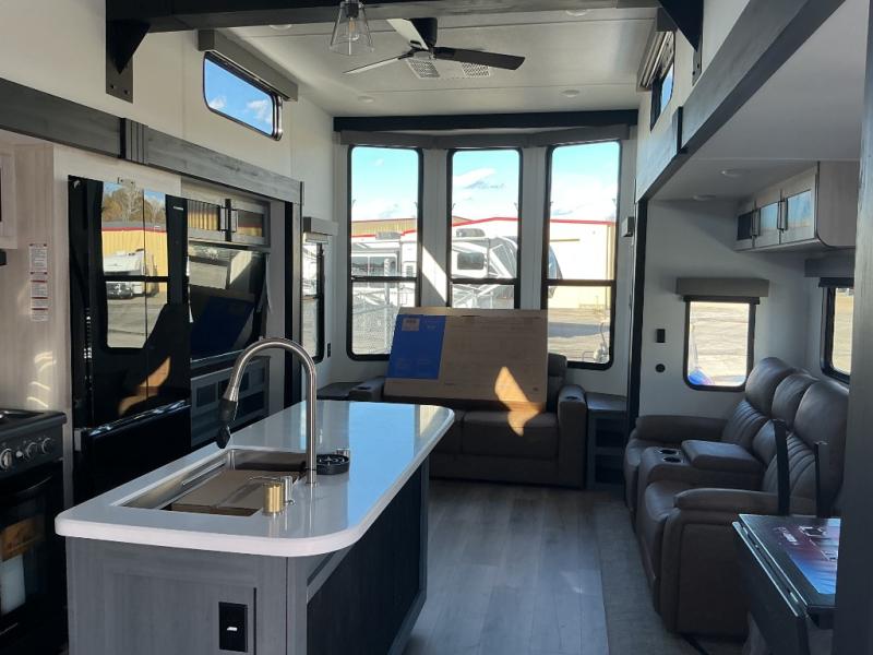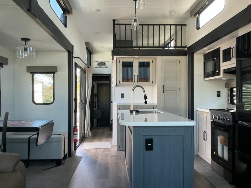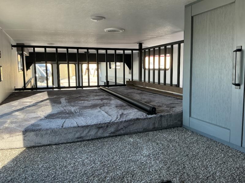 Wherever your destination may be, you can be sure to enjoy it to the fullest with this trailer in tow! With two entry doors, you can enter in through the rear private bedroom or the main living area. The bedroom includes a king bed slide out, a wardrobe/closet to keep your clothes organized, plus a closet with washer and dryer prep. Just outside this room are steps that lead to the large loft area with a 58" x 58" bunk mat and a cabinet on one side, plus two 32" x 69" bunk mats on the other. There is also a cabinet and a wardrobe/closet for plenty of storage space. Once you've headed back downstairs, you can relax on the theater seating, front sofa, or table and chairs with a bench seating. And the chef of your group will love the kitchen with its residential style refrigerator and pantry, kitchen island, and four burner cooktop!