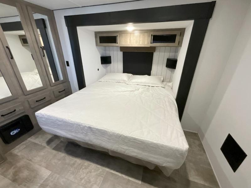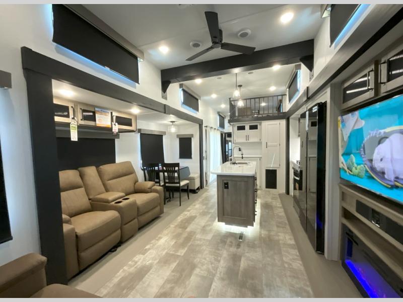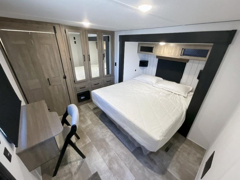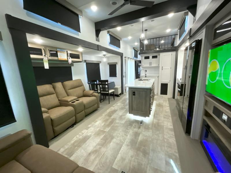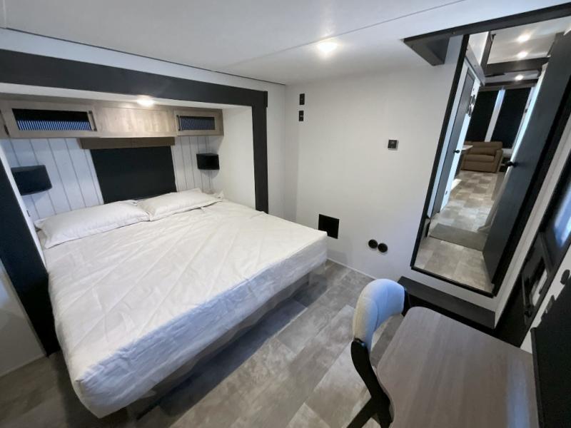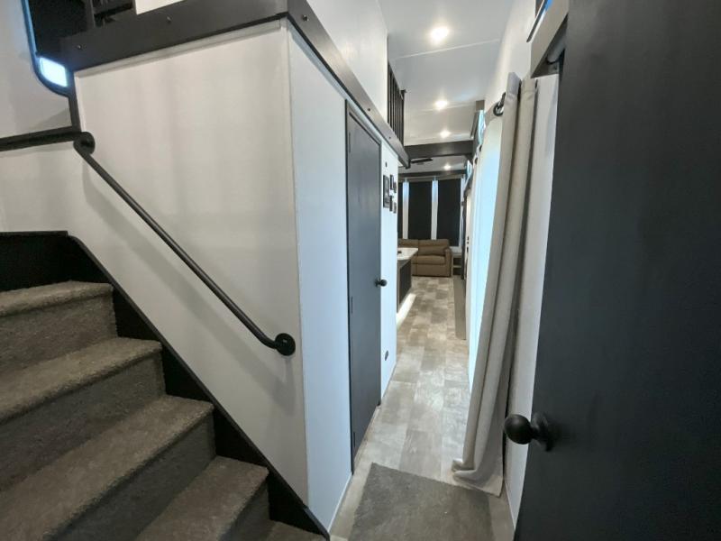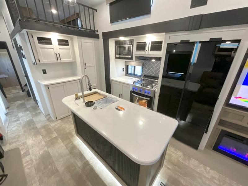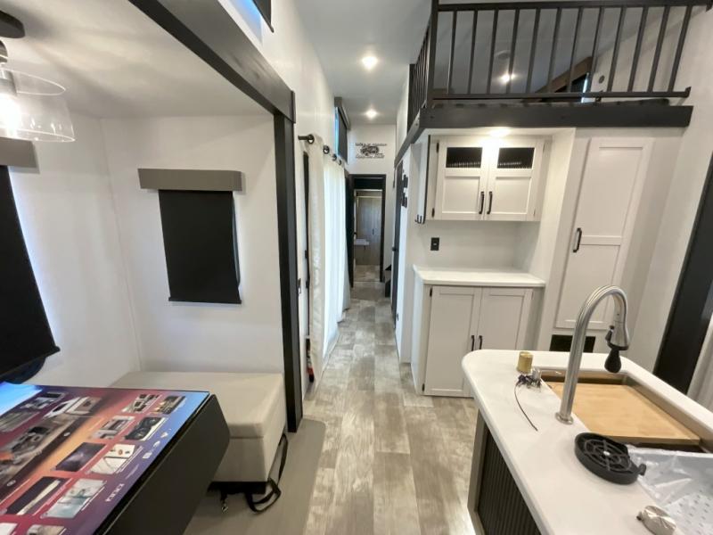 Wherever your destination may be, you can be sure to enjoy it to the fullest with this trailer in tow! With two entry doors, you can enter in through the rear private bedroom or the main living area. The bedroom includes a king bed slide out, a wardrobe/closet to keep your clothes organized, plus a closet with the option to add washer and dryer prep. Just outside this room are steps that lead to the large loft area with a 58" x 58" bunk mat and a cabinet on one side, plus two 32" x 69" bunk mats on the other. There is also a cabinet and a wardrobe/closet for plenty of storage space. Once you've headed back downstairs, you can relax on the dual recliners, front sofa, or free-standing table with a bench and two seats. And the chef of your group will love the kitchen with its residential style refrigerator and pantry, kitchen island, and four burner cooktop!