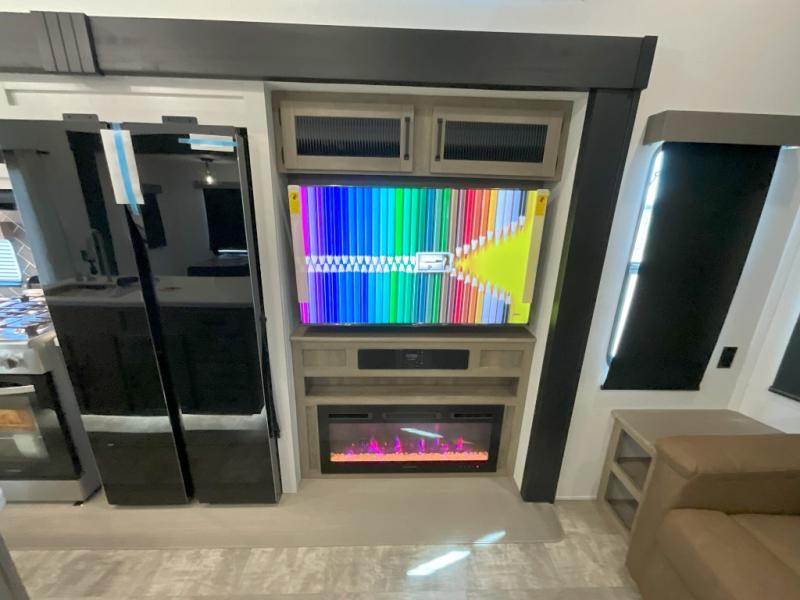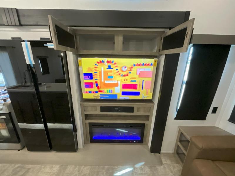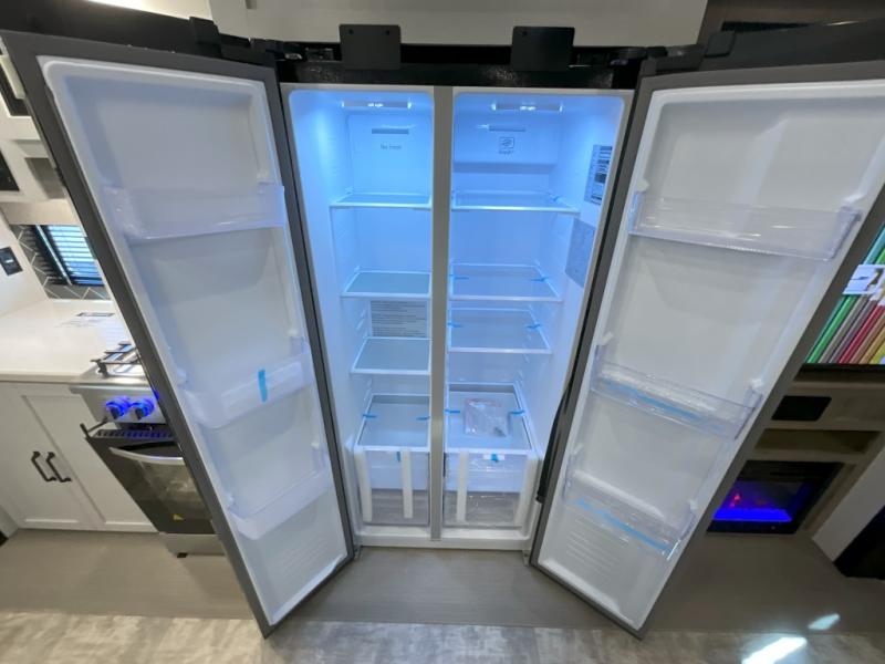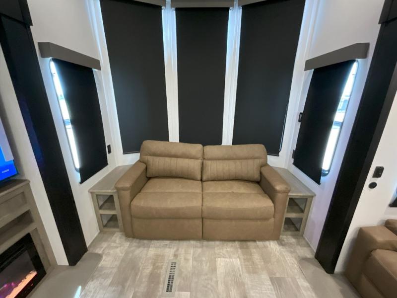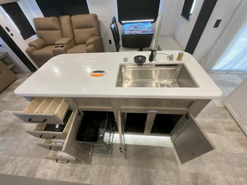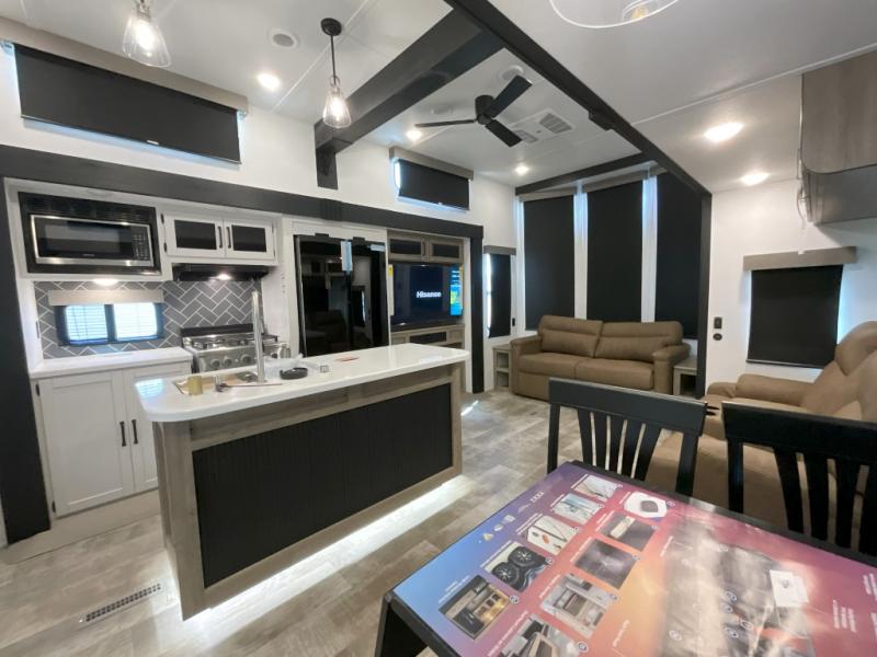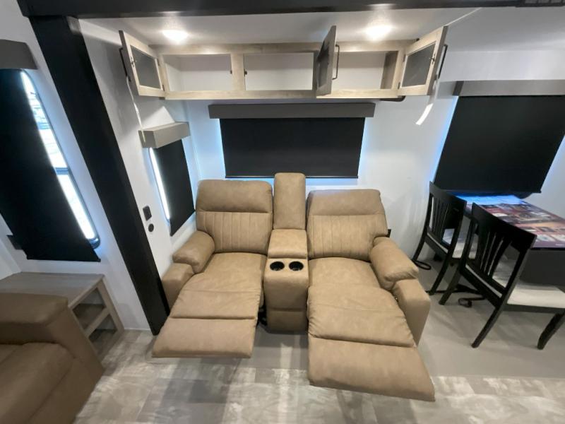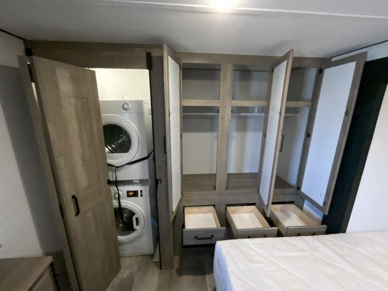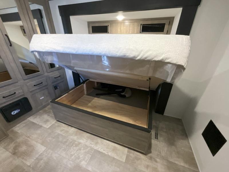 Wherever your destination may be, you can be sure to enjoy it to the fullest with this trailer in tow! With two entry doors, you can enter in through the rear private bedroom or the main living area. The bedroom includes a king bed slide out, a wardrobe/closet to keep your clothes organized, plus a closet with the option to add washer and dryer prep. Just outside this room are steps that lead to the large loft area with a 58" x 58" bunk mat and a cabinet on one side, plus two 32" x 69" bunk mats on the other. There is also a cabinet and a wardrobe/closet for plenty of storage space. Once you've headed back downstairs, you can relax on the dual recliners, front sofa, or free-standing table with a bench and two seats. And the chef of your group will love the kitchen with its residential style refrigerator and pantry, kitchen island, and four burner cooktop!