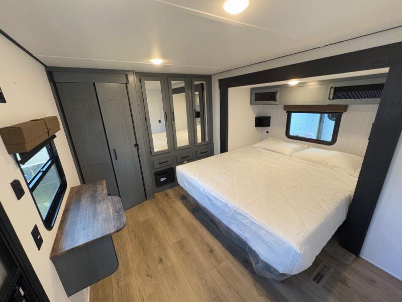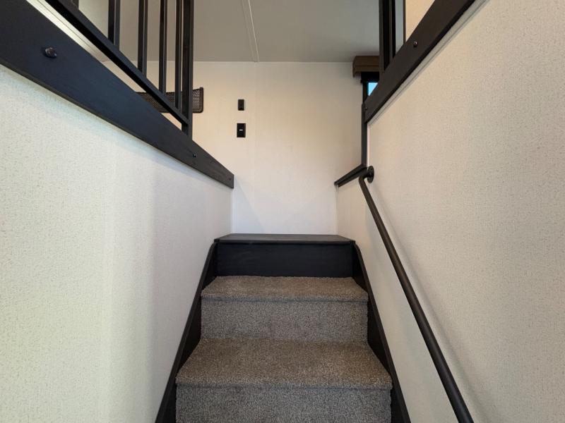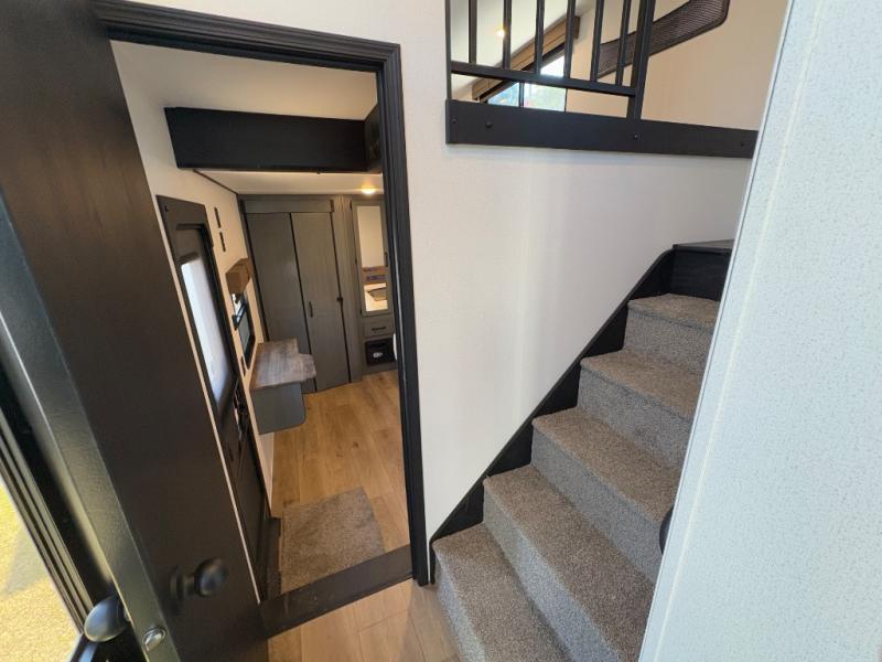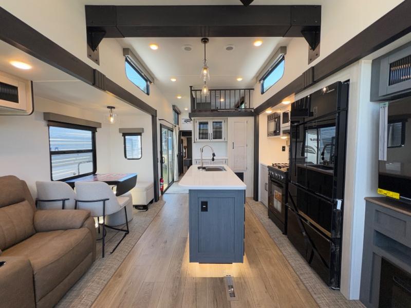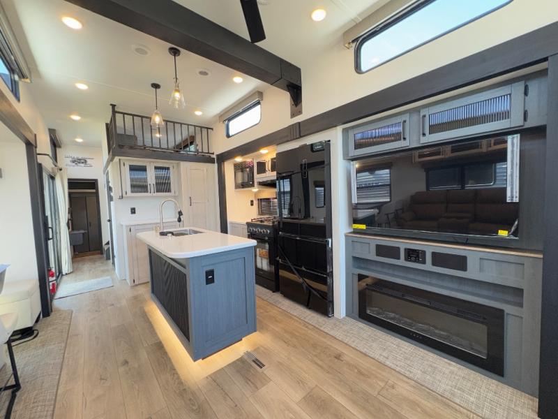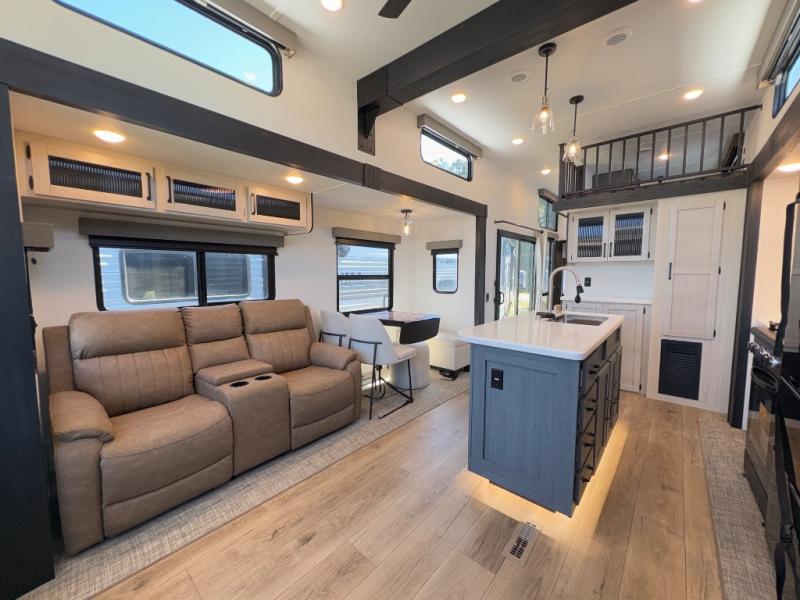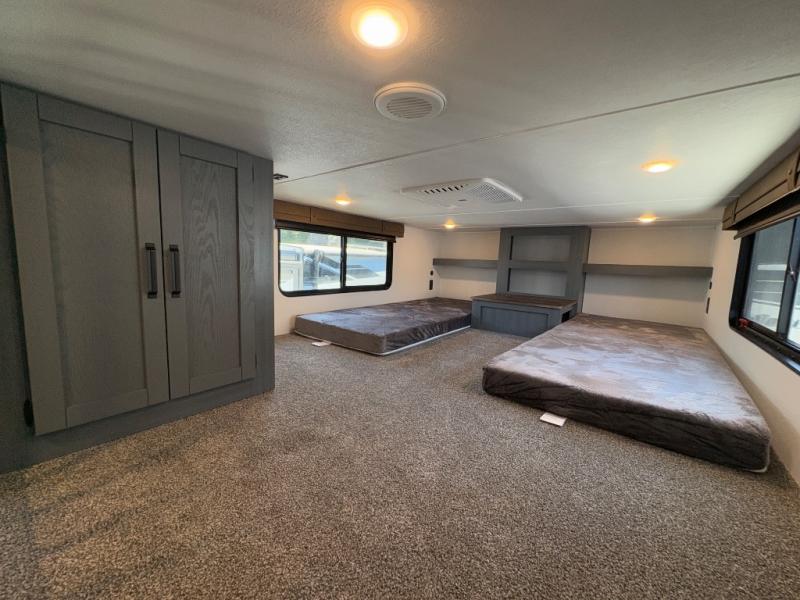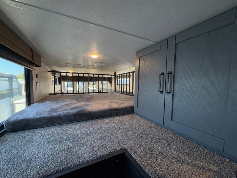 Wherever your destination may be, you can be sure to enjoy it to the fullest with this trailer in tow! With two entry doors, you can enter in through the rear private bedroom or the main living area. The bedroom includes a king bed slide out, a wardrobe/closet to keep your clothes organized, plus a closet with the option to add washer and dryer prep. Just outside this room are steps that lead to the large loft area with a 58" x 58" bunk mat and a cabinet on one side, plus two 32" x 69" bunk mats on the other. There is also a cabinet and a wardrobe/closet for plenty of storage space. Once you've headed back downstairs, you can relax on the dual recliners, front sofa, or free-standing table with a bench and two seats. And the chef of your group will love the kitchen with its residential style refrigerator and pantry, kitchen island, and four burner cooktop!
