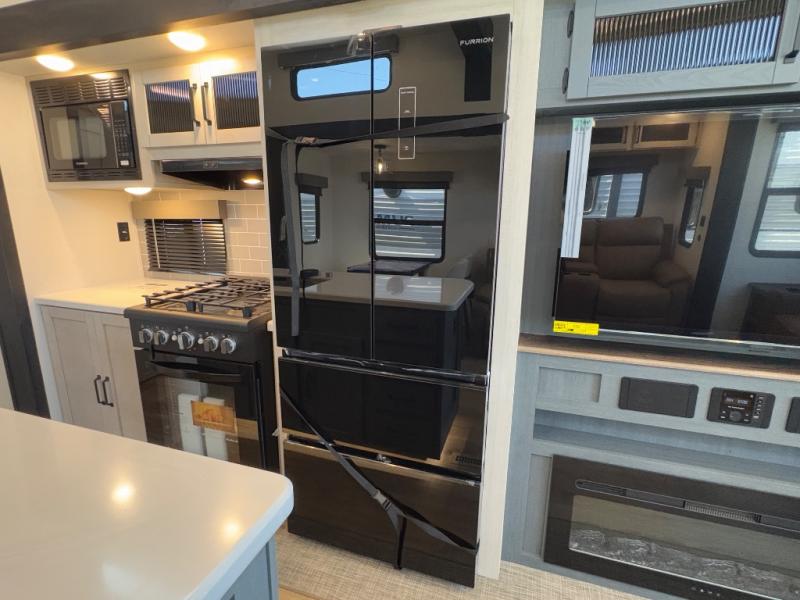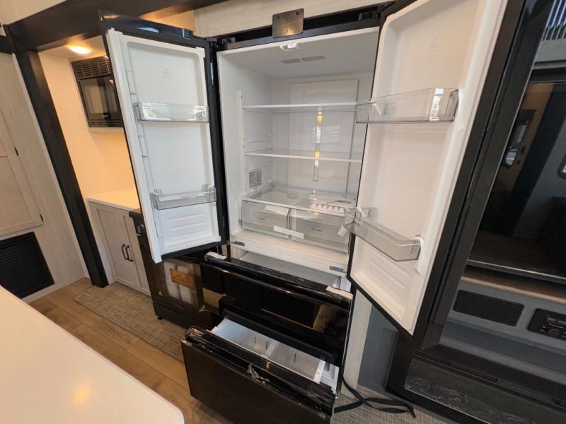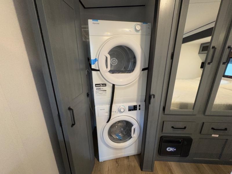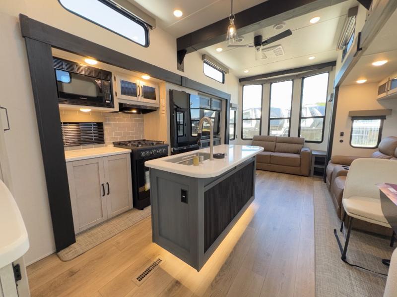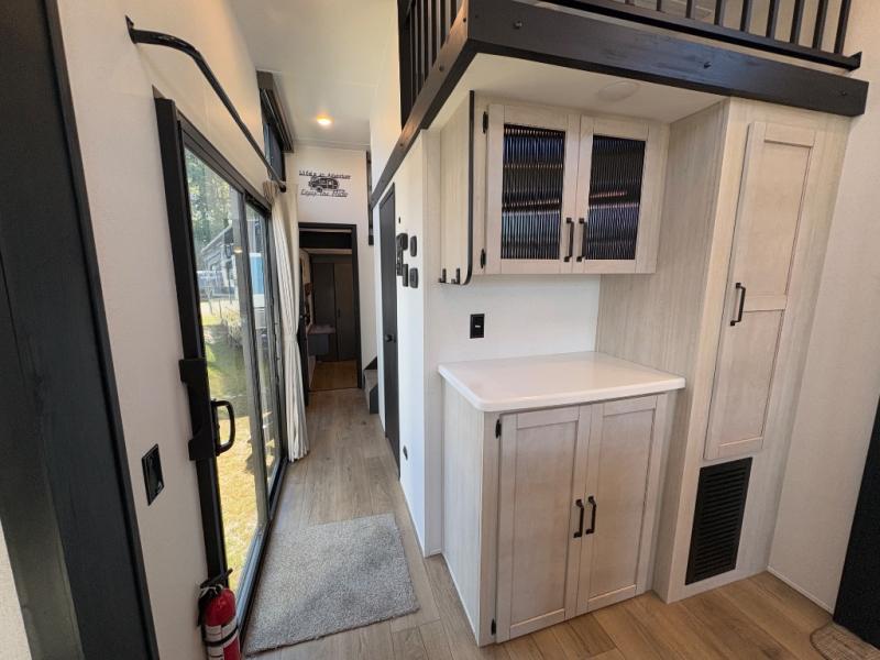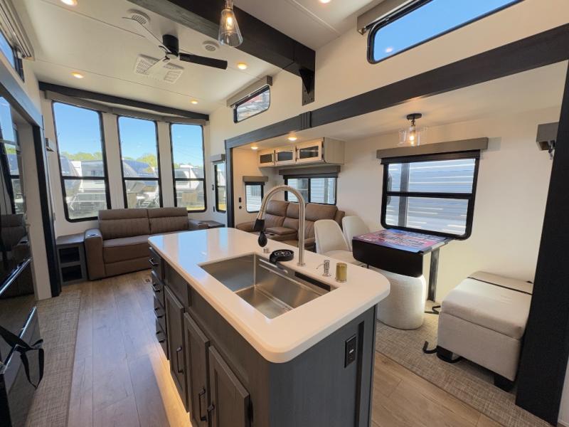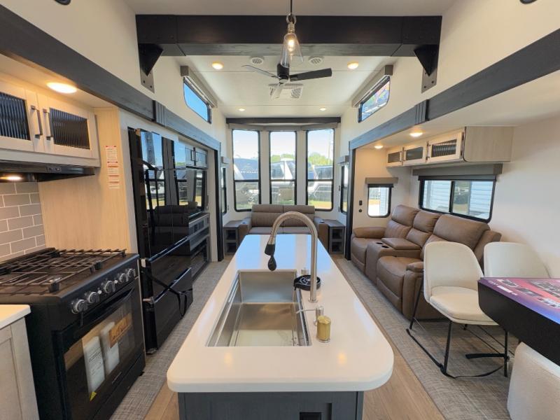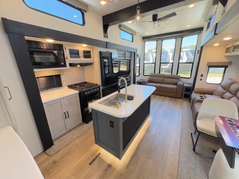 Wherever your destination may be, you can be sure to enjoy it to the fullest with this trailer in tow! With two entry doors, you can enter in through the rear private bedroom or the main living area. The bedroom includes a king bed slide out, a wardrobe/closet to keep your clothes organized, plus a closet with the option to add washer and dryer prep. Just outside this room are steps that lead to the large loft area with a 58" x 58" bunk mat and a cabinet on one side, plus two 32" x 69" bunk mats on the other. There is also a cabinet and a wardrobe/closet for plenty of storage space. Once you've headed back downstairs, you can relax on the dual recliners, front sofa, or free-standing table with a bench and two seats. And the chef of your group will love the kitchen with its residential style refrigerator and pantry, kitchen island, and four burner cooktop!