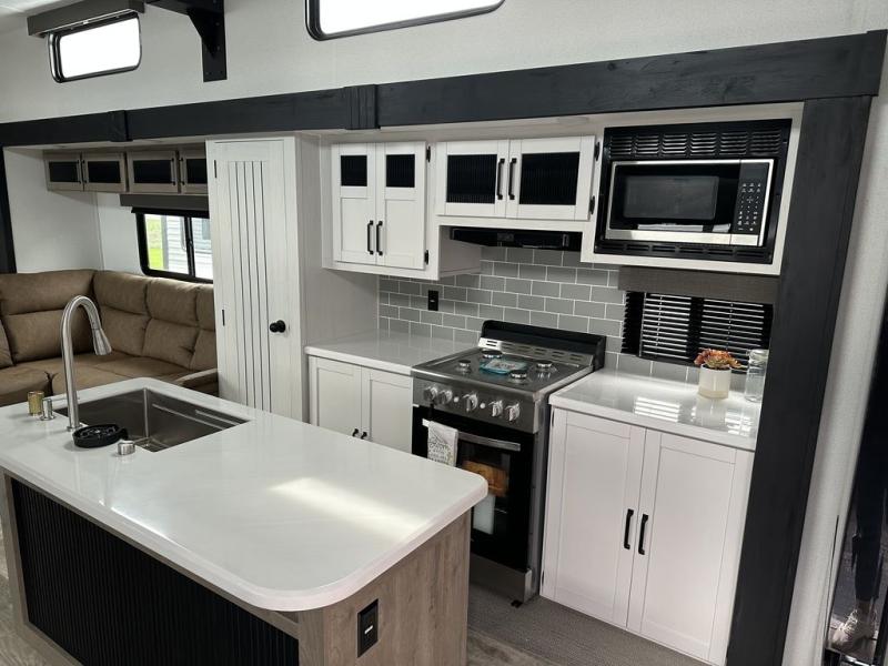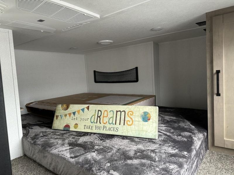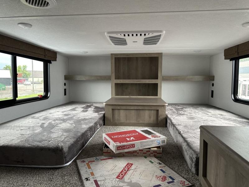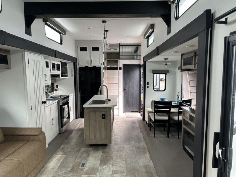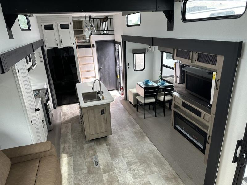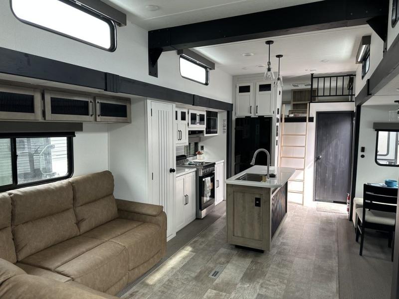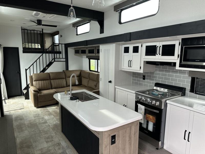 Wherever your destination may be, you can be sure to enjoy it to the fullest with this trailer in tow! With two entry doors, you can enter in through the rear private bedroom or the main living area. The bedroom includes a king bed slide out, a wardrobe/closet to keep your clothes organized, plus a closet with the option to add washer and dryer prep. Just outside this room are steps that lead to the large loft area with a 58" x 58" bunk mat and a cabinet on one side, plus two 32" x 69" bunk mats on the other. There is also a cabinet and a wardrobe/closet for plenty of storage space. Once you've headed back downstairs, you can relax on the dual recliners, front sofa, or free-standing table with a bench and two seats. And the chef of your group will love the kitchen with its residential style refrigerator and pantry, kitchen island, and four burner cooktop!