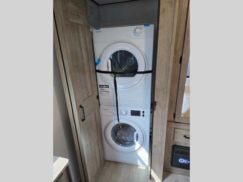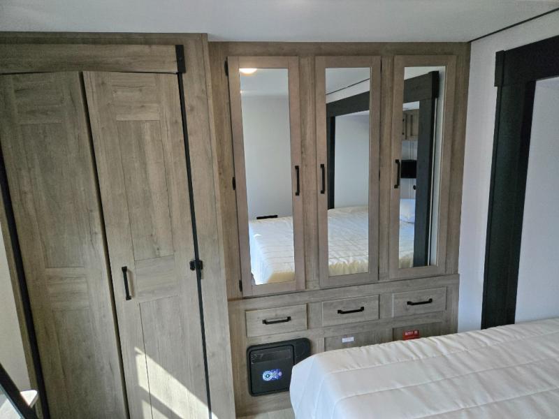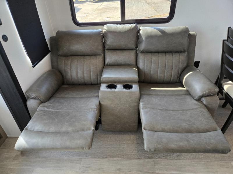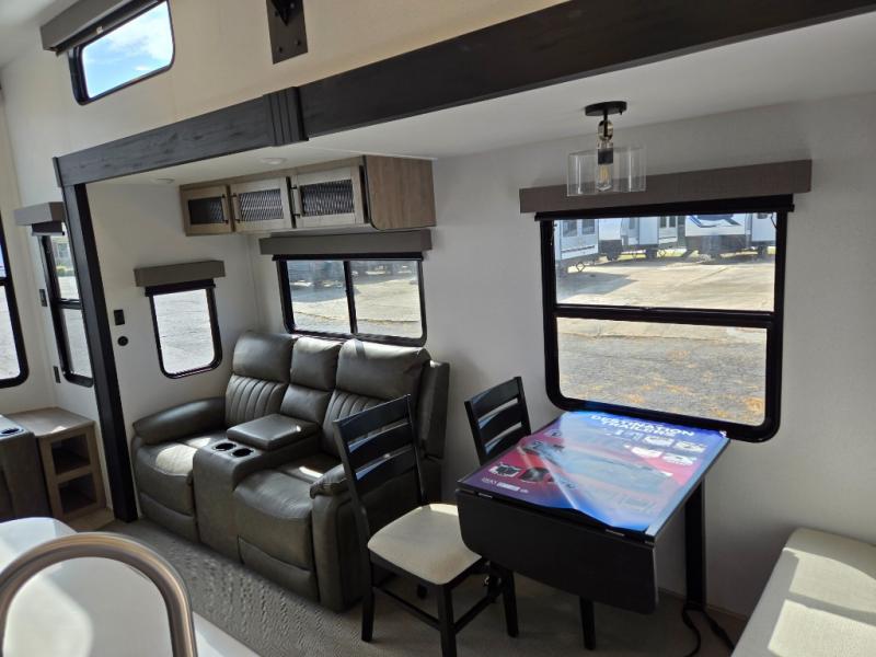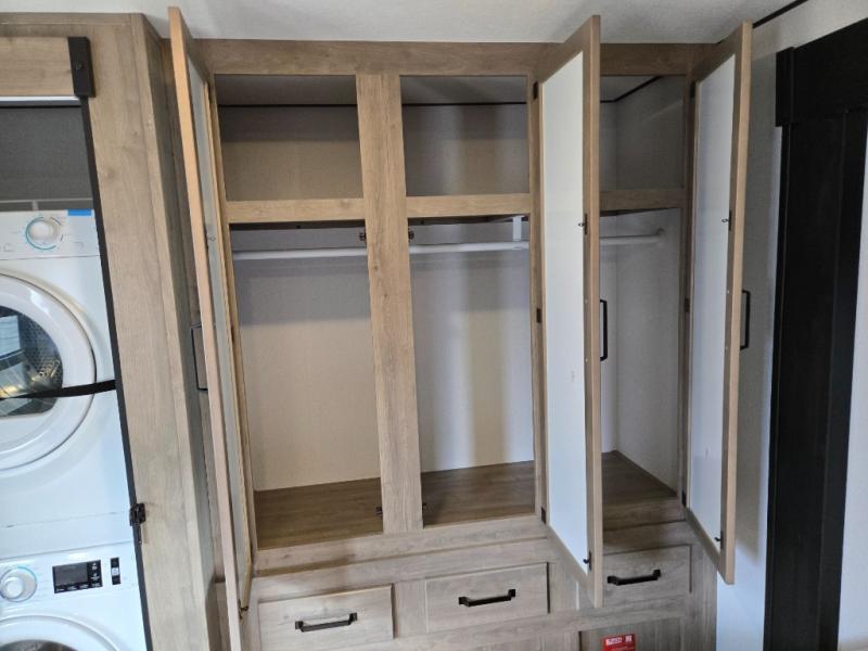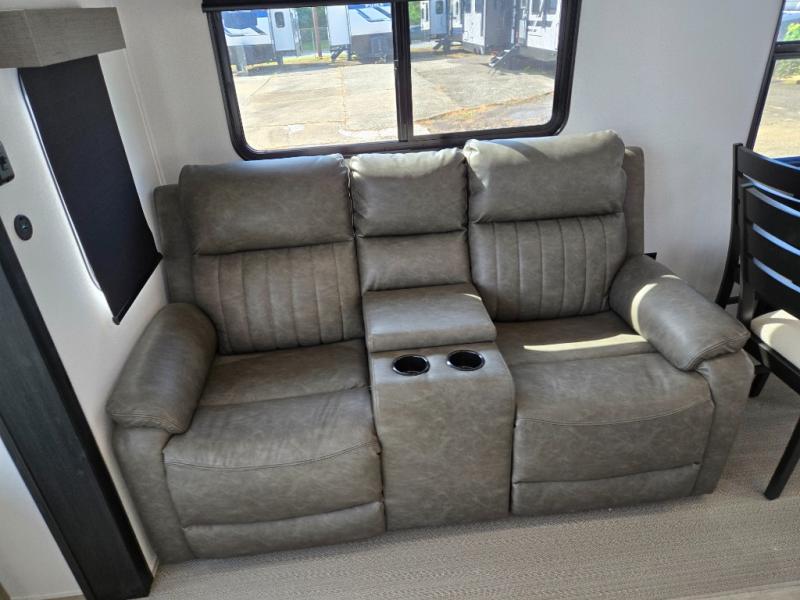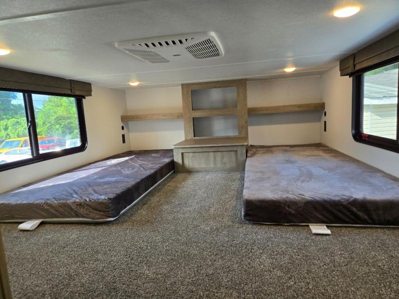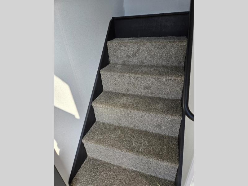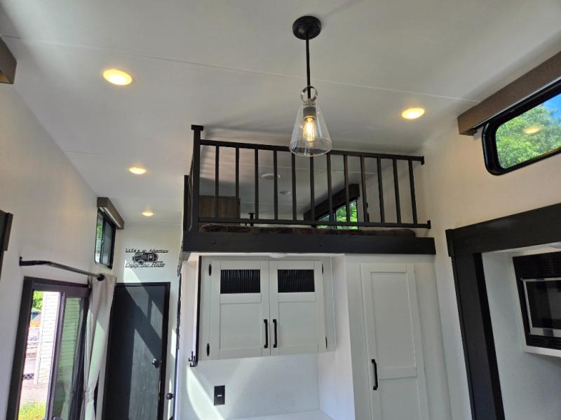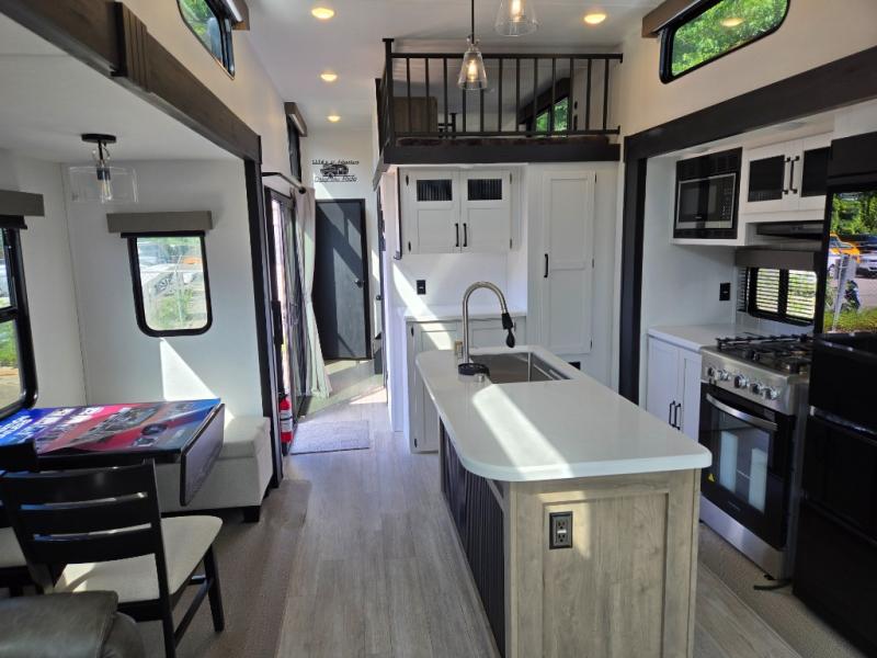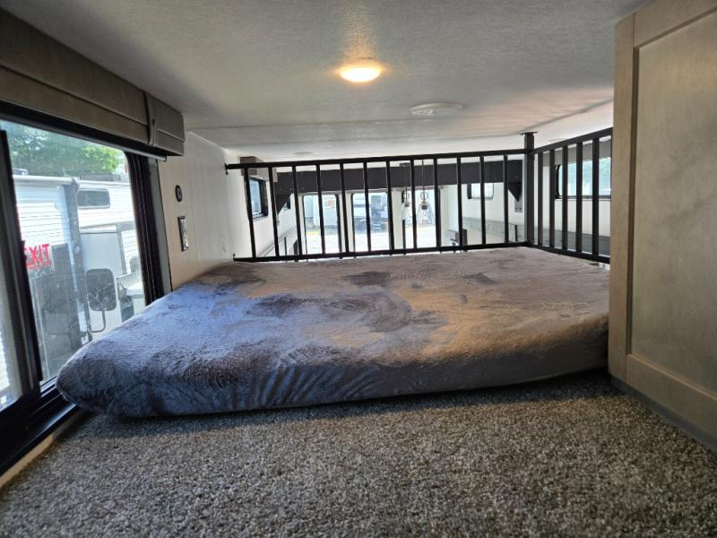 Wherever your destination may be, you can be sure to enjoy it to the fullest with this trailer in tow! With two entry doors, you can enter in through the rear private bedroom or the main living area. The bedroom includes a king bed slide out, a wardrobe/closet to keep your clothes organized, plus a closet with the option to add washer and dryer prep. Just outside this room are steps that lead to the large loft area with a 58" x 58" bunk mat and a cabinet on one side, plus two 32" x 69" bunk mats on the other. There is also a cabinet and a wardrobe/closet for plenty of storage space. Once you've headed back downstairs, you can relax on the dual recliners, front sofa, or free-standing table with a bench and two seats. And the chef of your group will love the kitchen with its residential style refrigerator and pantry, kitchen island, and four burner cooktop!
