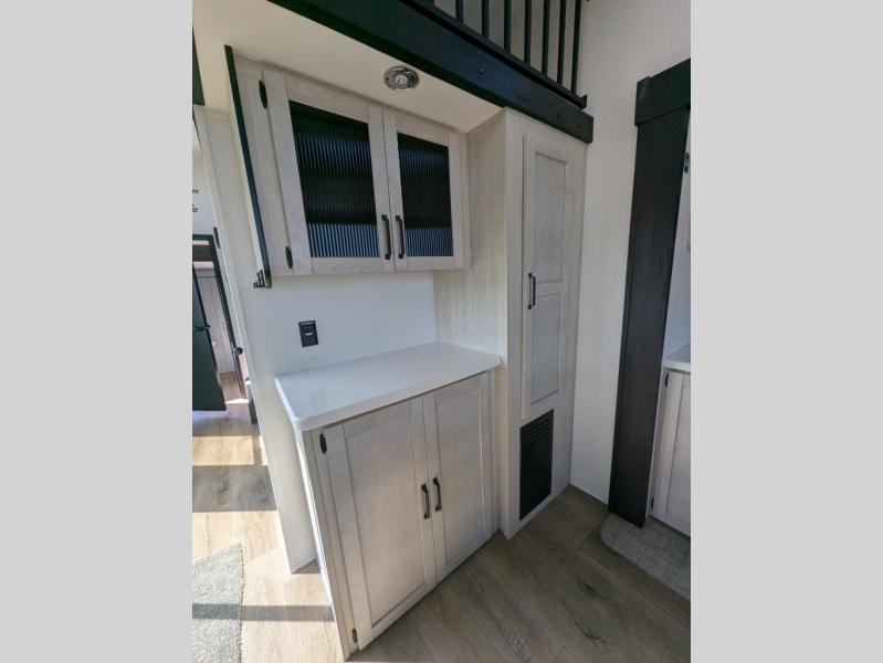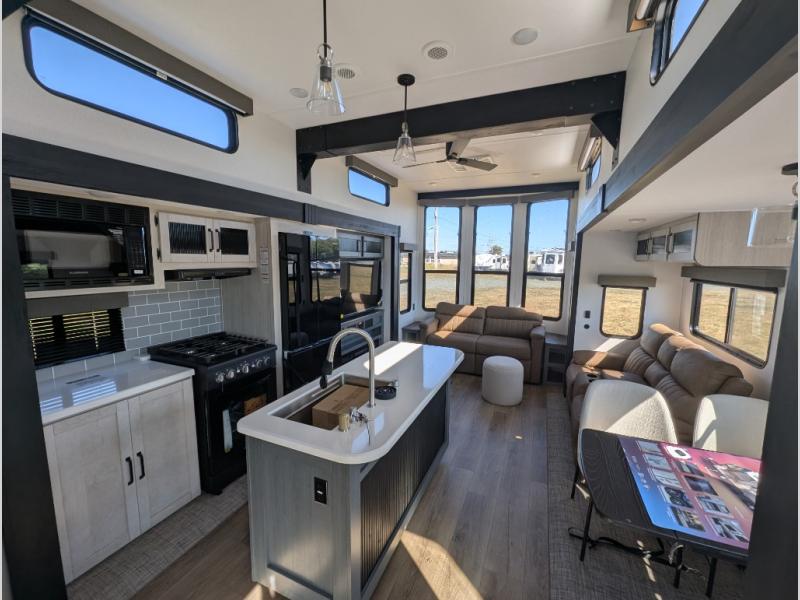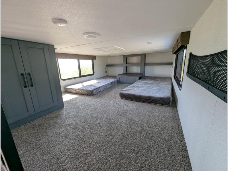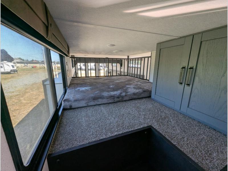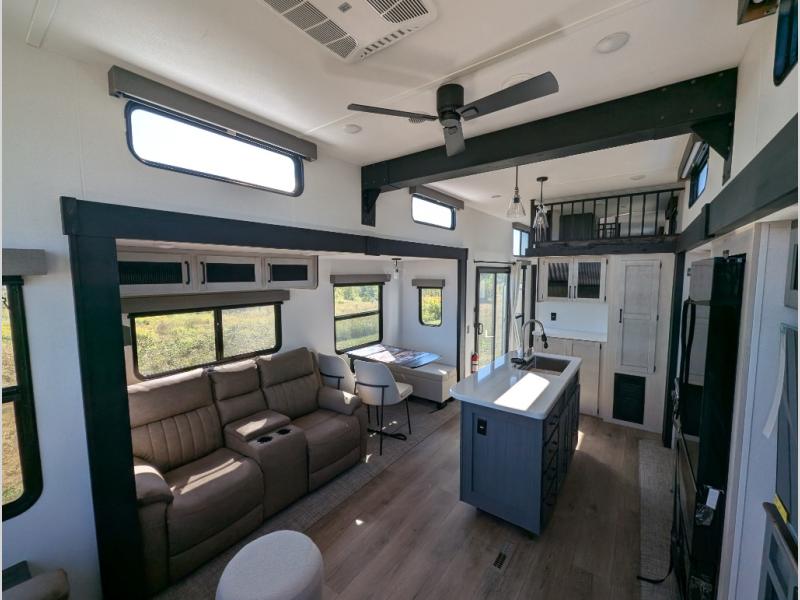 Wherever your destination may be, you can be sure to enjoy it to the fullest with this trailer in tow! With two entry doors, you can enter in through the rear private bedroom or the main living area. The bedroom includes a king bed slide out, a wardrobe/closet to keep your clothes organized, plus a closet with the option to add washer and dryer prep. Just outside this room are steps that lead to the large loft area with a 58" x 58" bunk mat and a cabinet on one side, plus two 32" x 69" bunk mats on the other. There is also a cabinet and a wardrobe/closet for plenty of storage space. Once you've headed back downstairs, you can relax on the dual recliners, front sofa, or free-standing table with a bench and two seats. And the chef of your group will love the kitchen with its residential style refrigerator and pantry, kitchen island, and four burner cooktop!