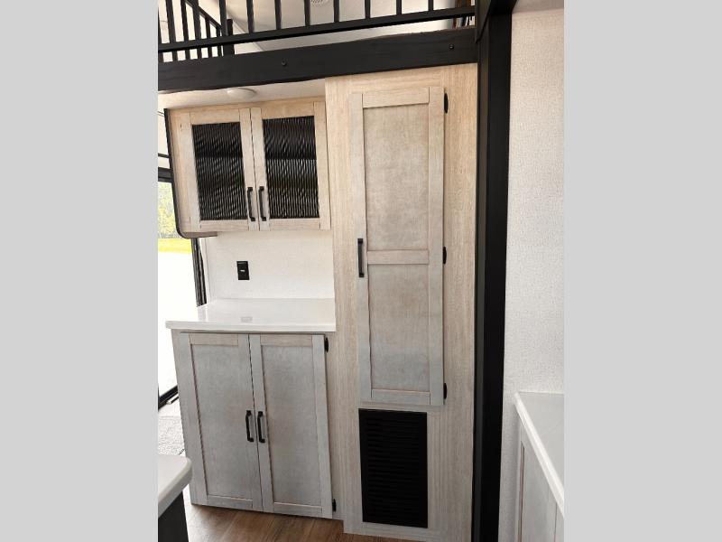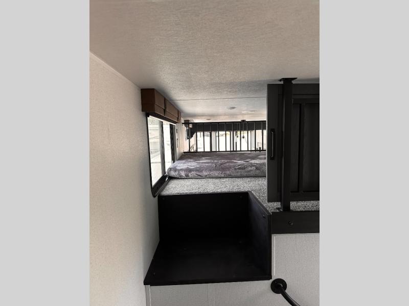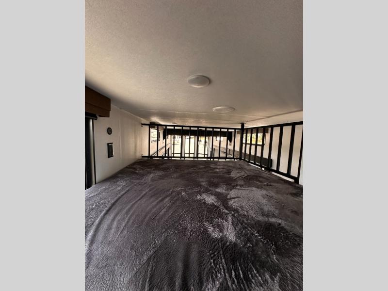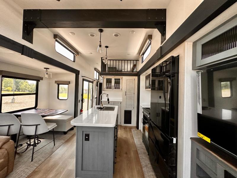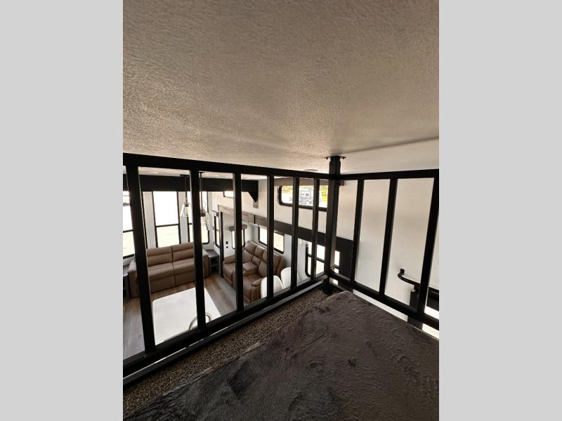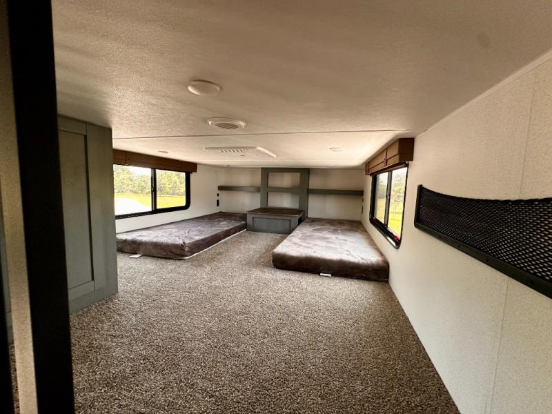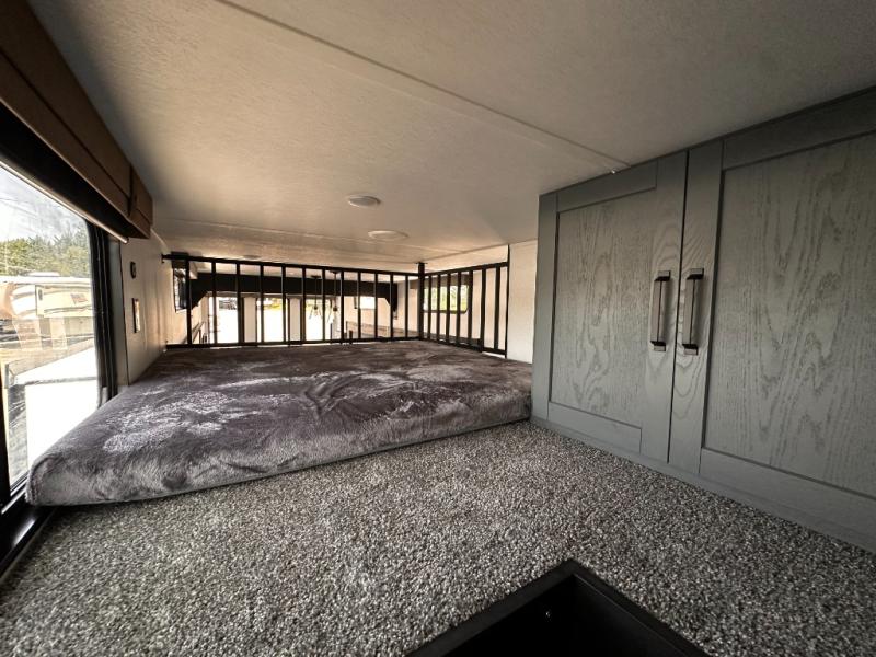 Wherever your destination may be, you can be sure to enjoy it to the fullest with this trailer in tow! With two entry doors, you can enter in through the rear private bedroom or the main living area. The bedroom includes a king bed slide out, a wardrobe/closet to keep your clothes organized, plus a closet with the option to add washer and dryer prep. Just outside this room are steps that lead to the large loft area with a 58" x 58" bunk mat and a cabinet on one side, plus two 32" x 69" bunk mats on the other. There is also a cabinet and a wardrobe/closet for plenty of storage space. Once you've headed back downstairs, you can relax on the dual recliners, front sofa, or free-standing table with a bench and two seats. And the chef of your group will love the kitchen with its residential style refrigerator and pantry, kitchen island, and four burner cooktop!