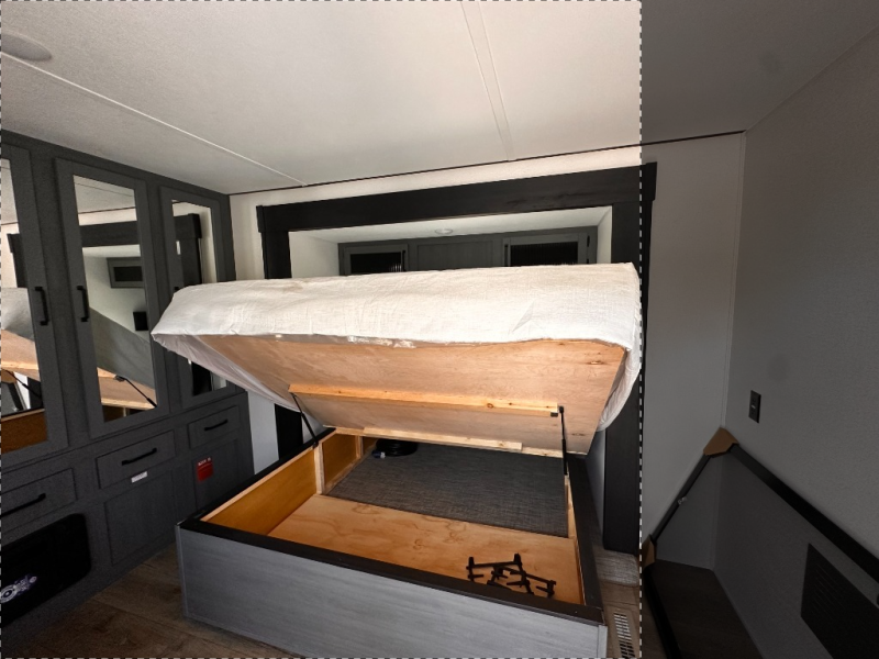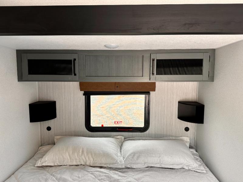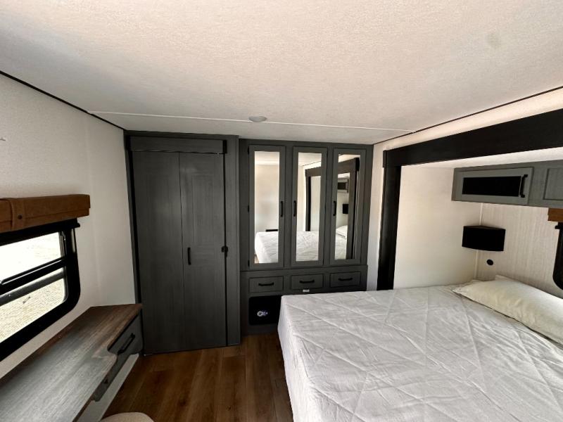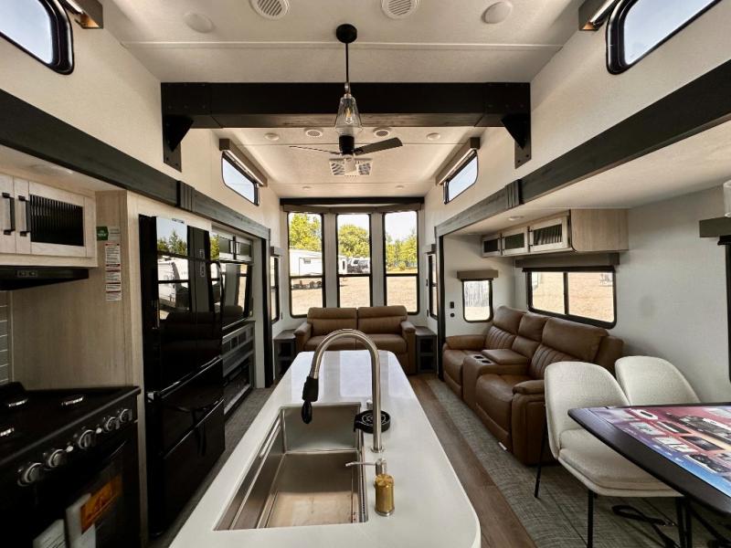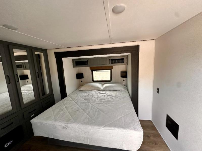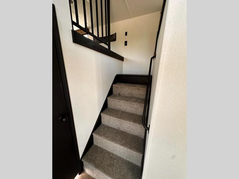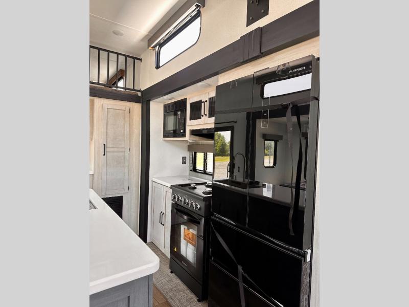 Wherever your destination may be, you can be sure to enjoy it to the fullest with this trailer in tow! With two entry doors, you can enter in through the rear private bedroom or the main living area. The bedroom includes a king bed slide out, a wardrobe/closet to keep your clothes organized, plus a closet with the option to add washer and dryer prep. Just outside this room are steps that lead to the large loft area with a 58" x 58" bunk mat and a cabinet on one side, plus two 32" x 69" bunk mats on the other. There is also a cabinet and a wardrobe/closet for plenty of storage space. Once you've headed back downstairs, you can relax on the dual recliners, front sofa, or free-standing table with a bench and two seats. And the chef of your group will love the kitchen with its residential style refrigerator and pantry, kitchen island, and four burner cooktop!
