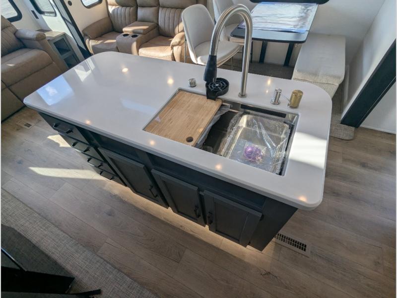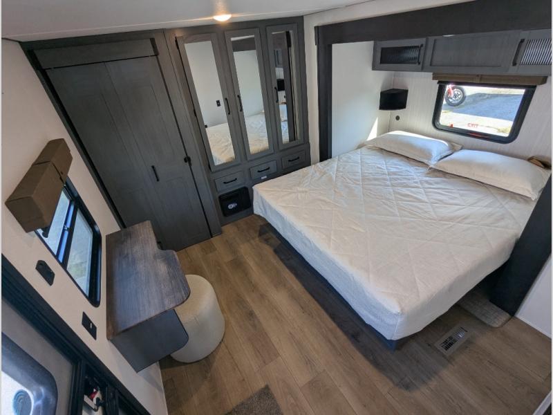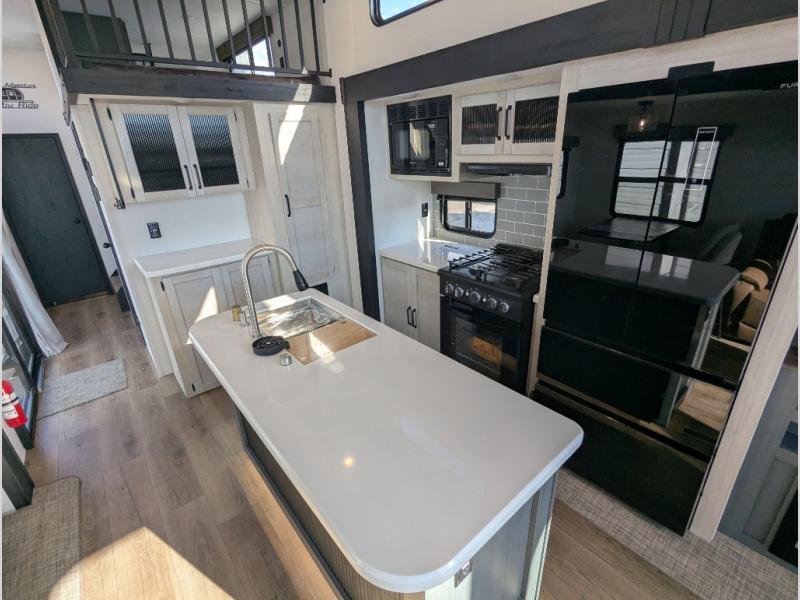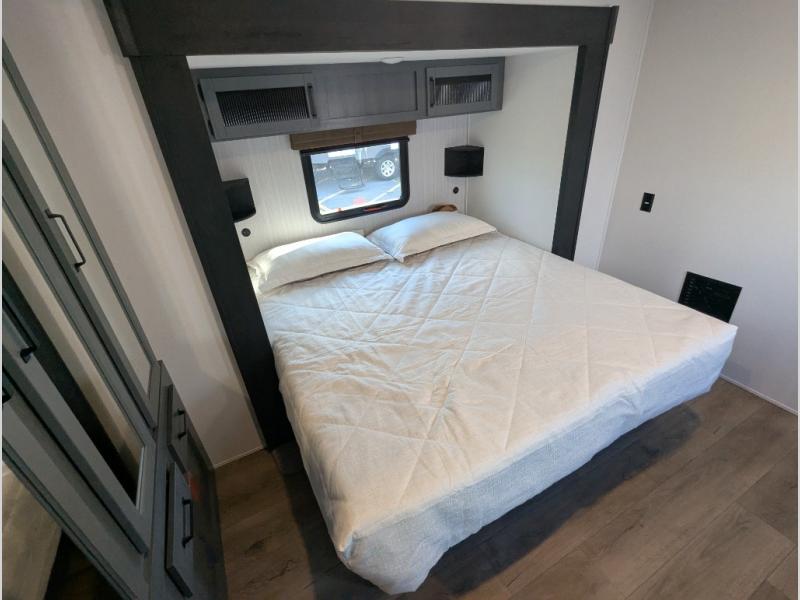 Wherever your destination may be, you can be sure to enjoy it to the fullest with this trailer in tow! With two entry doors, you can enter in through the rear private bedroom or the main living area. The bedroom includes a king bed slide out, a wardrobe/closet to keep your clothes organized, plus a closet with the option to add washer and dryer prep. Just outside this room are steps that lead to the large loft area with a 58" x 58" bunk mat and a cabinet on one side, plus two 32" x 69" bunk mats on the other. There is also a cabinet and a wardrobe/closet for plenty of storage space. Once you've headed back downstairs, you can relax on the dual recliners, front sofa, or free-standing table with a bench and two seats. And the chef of your group will love the kitchen with its residential style refrigerator and pantry, kitchen island, and four burner cooktop!