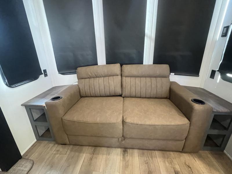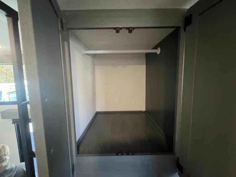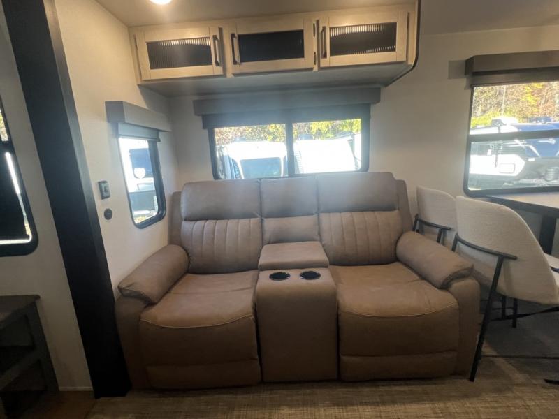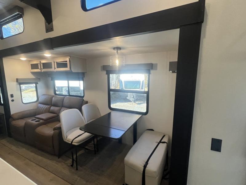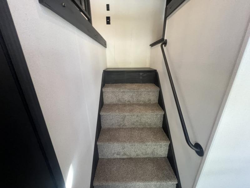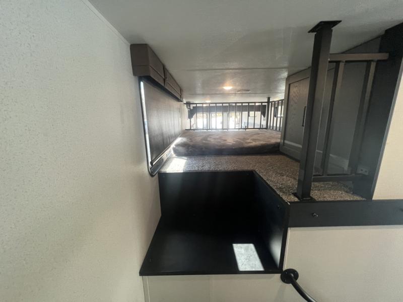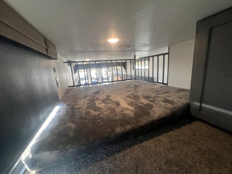 Wherever your destination may be, you can be sure to enjoy it to the fullest with this trailer in tow! With two entry doors, you can enter in through the rear private bedroom or the main living area. The bedroom includes a king bed slide out, a wardrobe/closet to keep your clothes organized, plus a closet with the option to add washer and dryer prep. Just outside this room are steps that lead to the large loft area with a 58" x 58" bunk mat and a cabinet on one side, plus two 32" x 69" bunk mats on the other. There is also a cabinet and a wardrobe/closet for plenty of storage space. Once you've headed back downstairs, you can relax on the dual recliners, front sofa, or free-standing table with a bench and two seats. And the chef of your group will love the kitchen with its residential style refrigerator and pantry, kitchen island, and four burner cooktop!