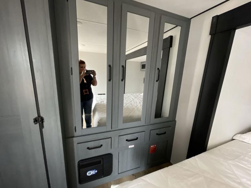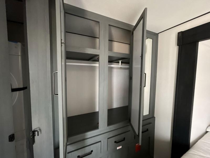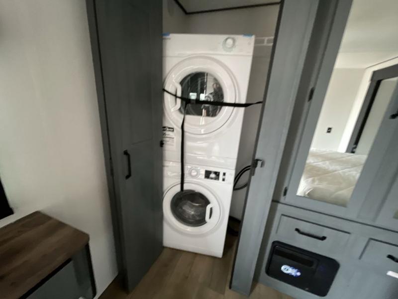 Wherever your destination may be, you can be sure to enjoy it to the fullest with this trailer in tow! With two entry doors, you can enter in through the rear private bedroom or the main living area. The bedroom includes a king bed slide out, a wardrobe/closet to keep your clothes organized, plus a closet with the option to add washer and dryer prep. Just outside this room are steps that lead to the large loft area with a 58" x 58" bunk mat and a cabinet on one side, plus two 32" x 69" bunk mats on the other. There is also a cabinet and a wardrobe/closet for plenty of storage space. Once you've headed back downstairs, you can relax on the dual recliners, front sofa, or free-standing table with a bench and two seats. And the chef of your group will love the kitchen with its residential style refrigerator and pantry, kitchen island, and four burner cooktop!