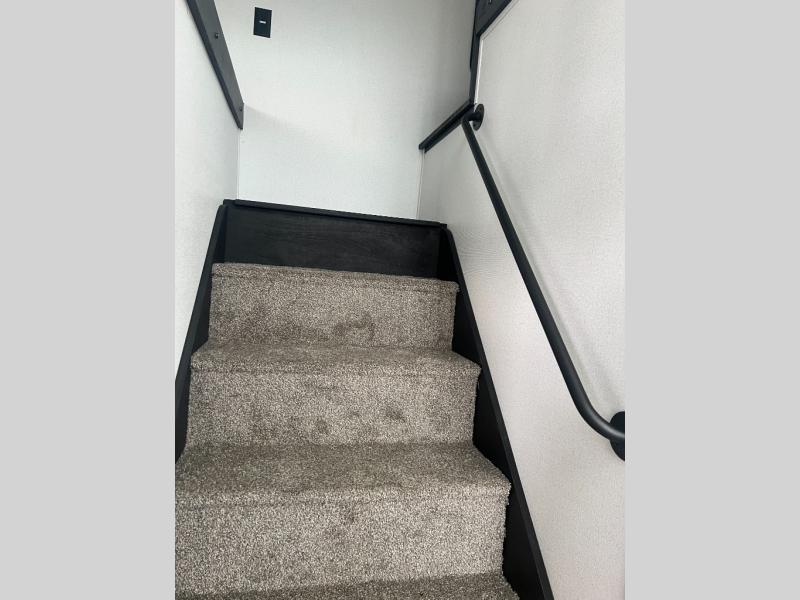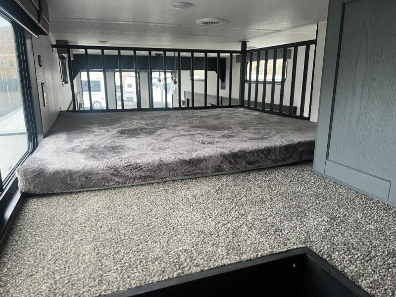 Wherever your destination may be, you can be sure to enjoy it to the fullest with this trailer in tow! With two entry doors, you can enter in through the rear private bedroom or the main living area. The bedroom includes a king bed slide out, a wardrobe/closet to keep your clothes organized, plus a closet with washer and dryer prep. Just outside this room are steps that lead to the large loft area with a 58" x 58" bunk mat and a cabinet on one side, plus two 32" x 69" bunk mats on the other. There is also a cabinet and a wardrobe/closet for plenty of storage space. Once you've headed back downstairs, you can relax on the theater seating, front sofa, or table and chairs with a bench seating. And the chef of your group will love the kitchen with its residential style refrigerator and pantry, kitchen island, and four burner cooktop!