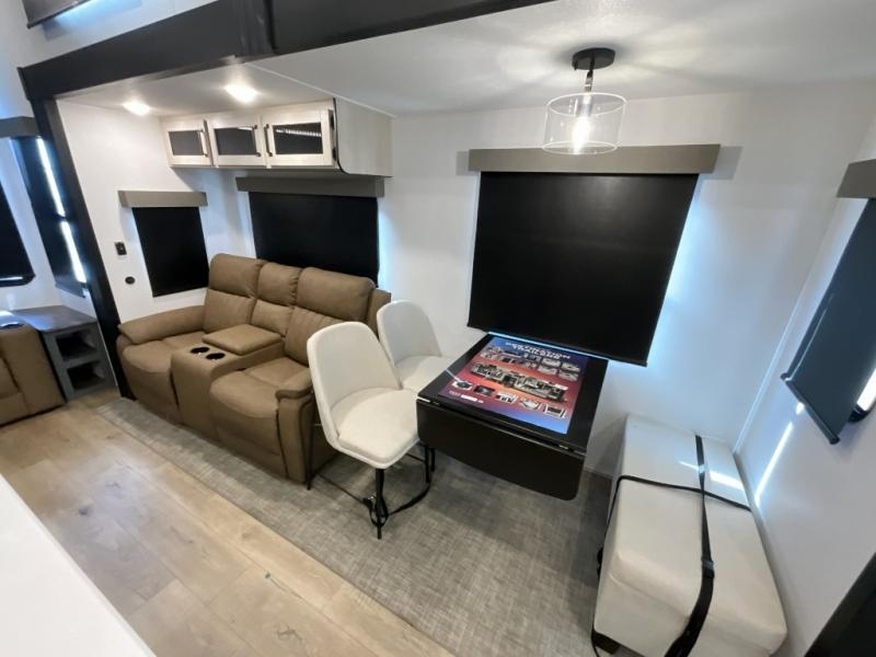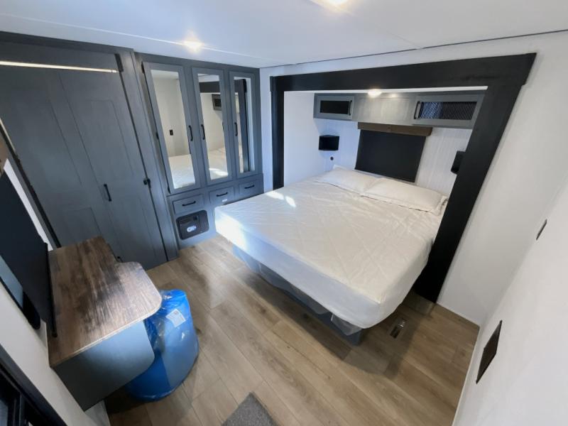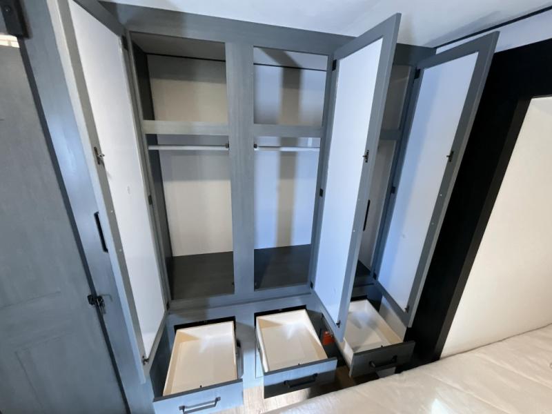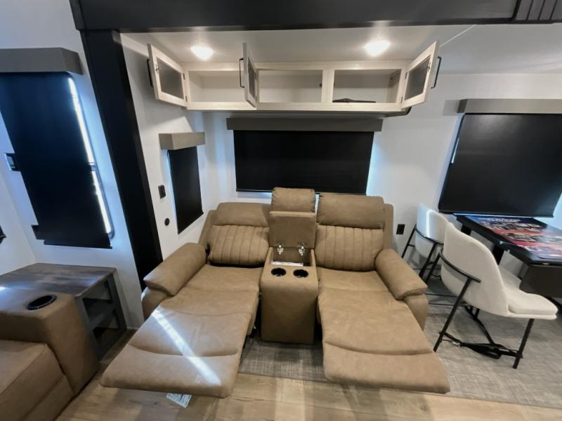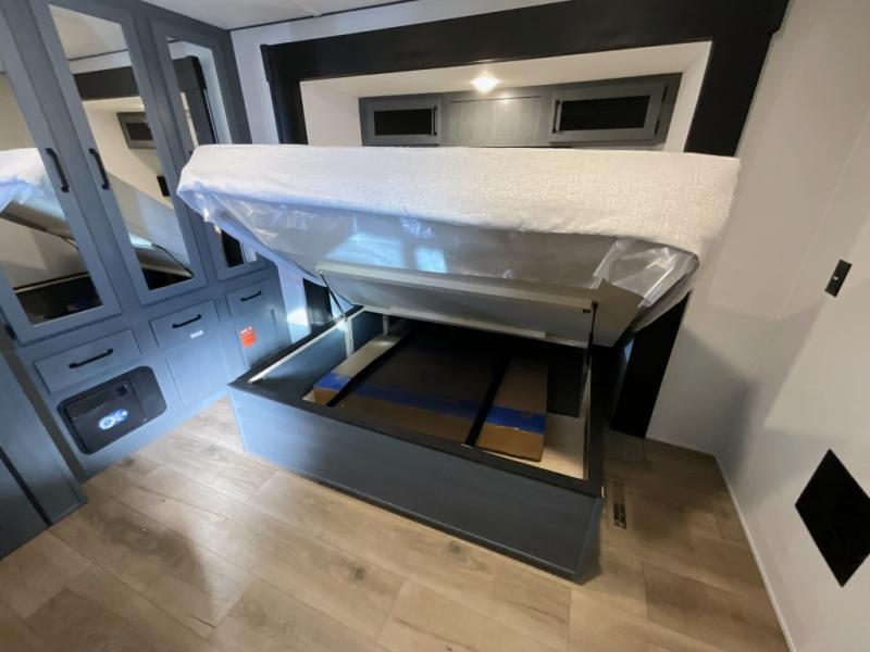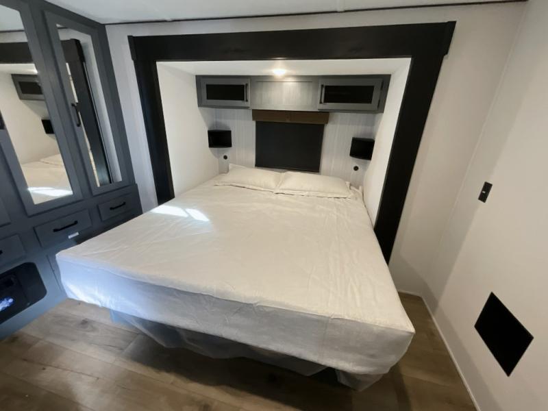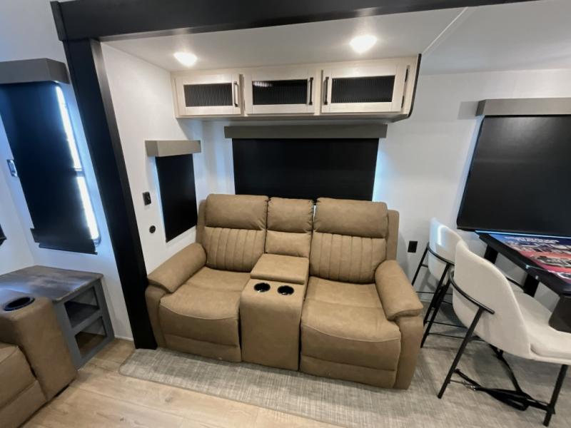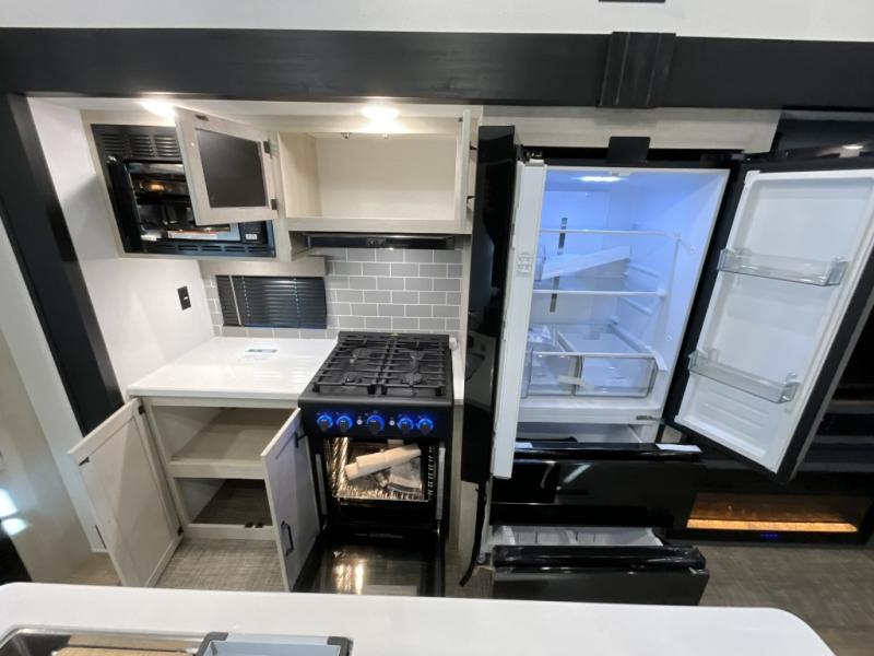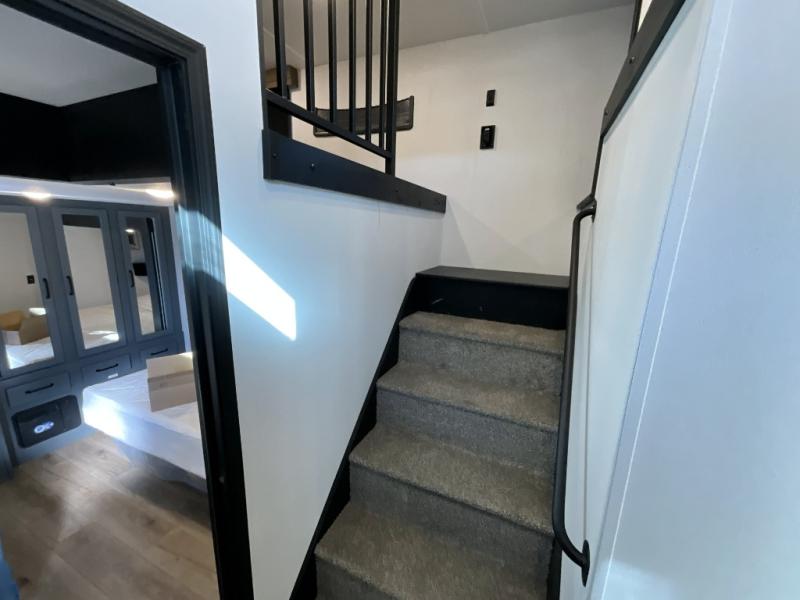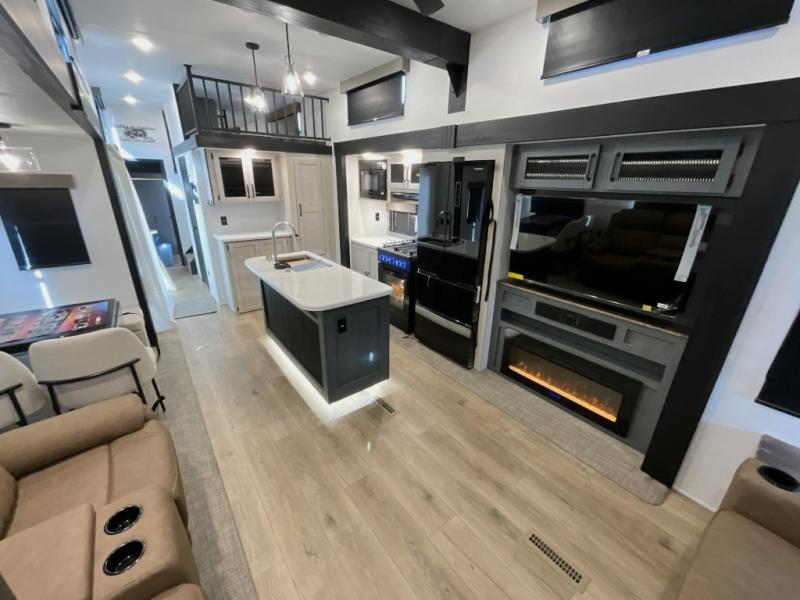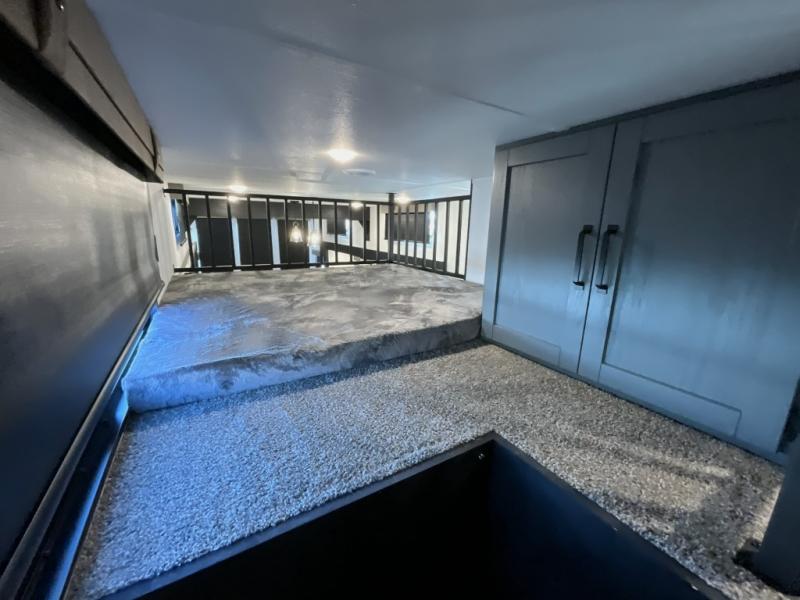 Wherever your destination may be, you can be sure to enjoy it to the fullest with this trailer in tow! With two entry doors, you can enter in through the rear private bedroom or the main living area. The bedroom includes a king bed slide out, a wardrobe/closet to keep your clothes organized, plus a closet with washer and dryer prep. Just outside this room are steps that lead to the large loft area with a 58" x 58" bunk mat and a cabinet on one side, plus two 32" x 69" bunk mats on the other. There is also a cabinet and a wardrobe/closet for plenty of storage space. Once you've headed back downstairs, you can relax on the theater seating, front sofa, or table and chairs with a bench seating. And the chef of your group will love the kitchen with its residential style refrigerator and pantry, kitchen island, and four burner cooktop!