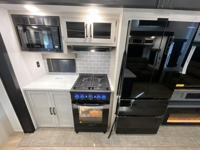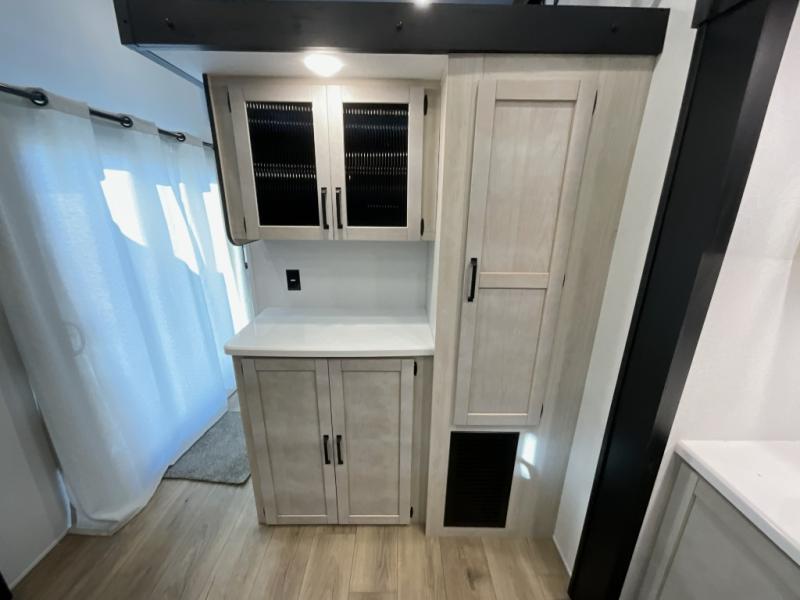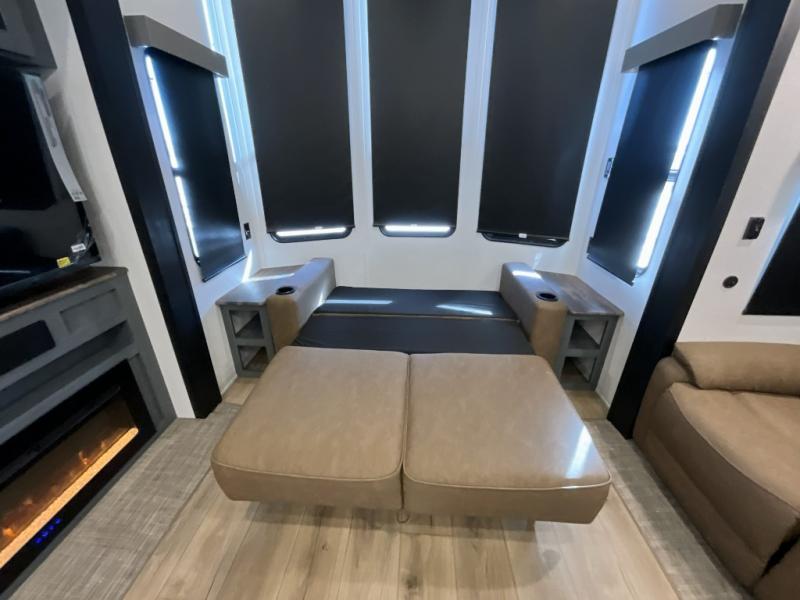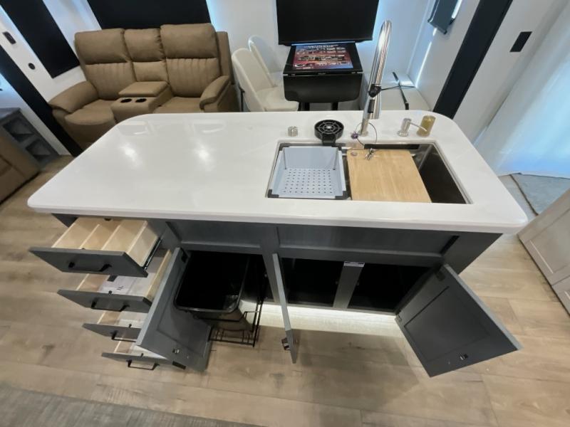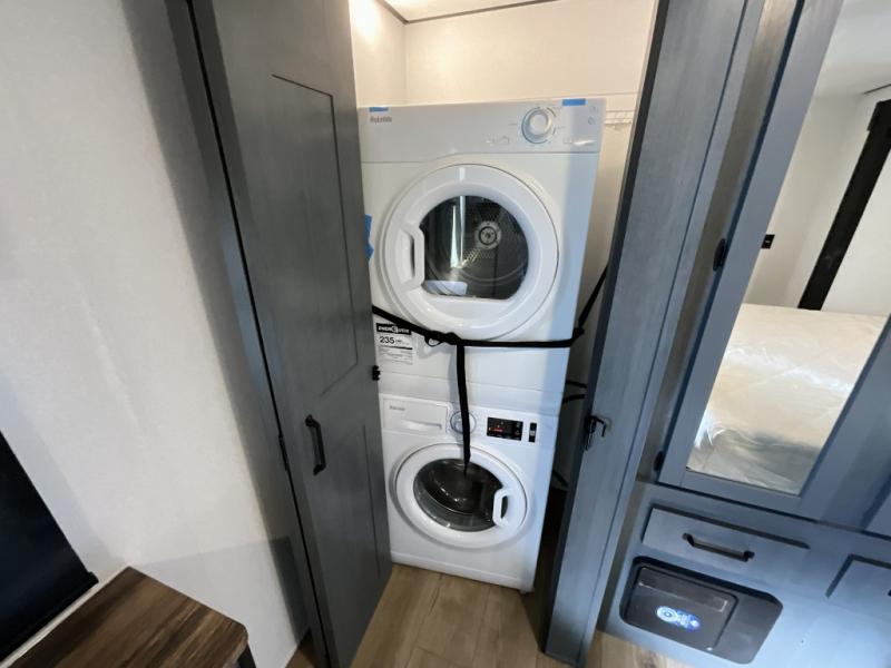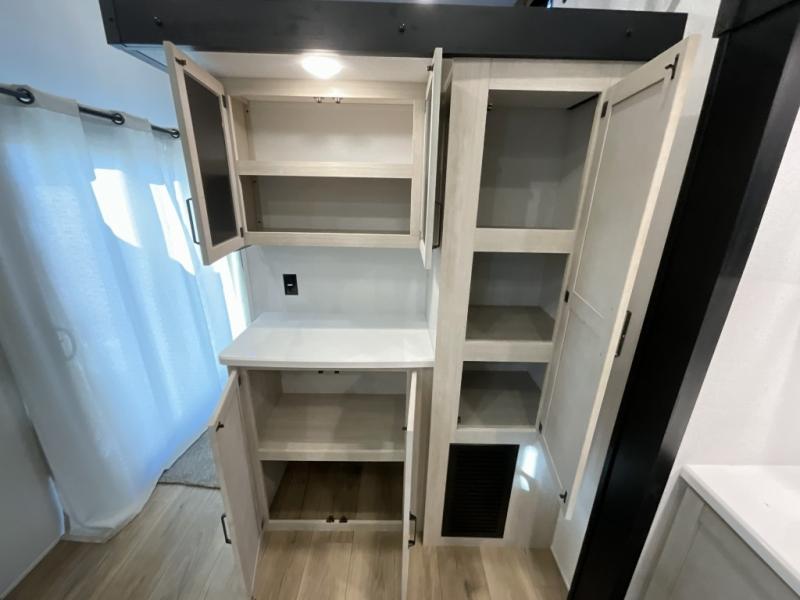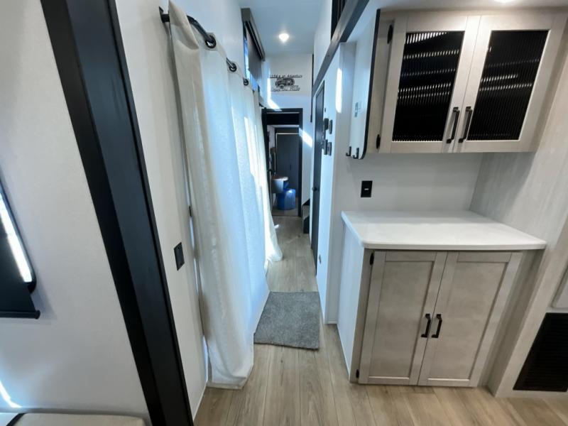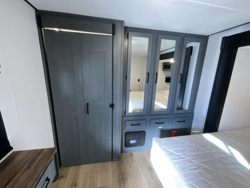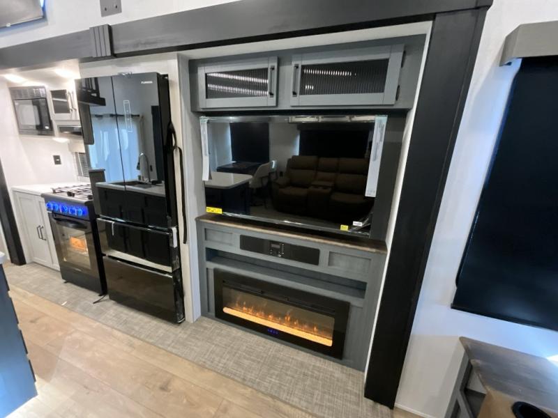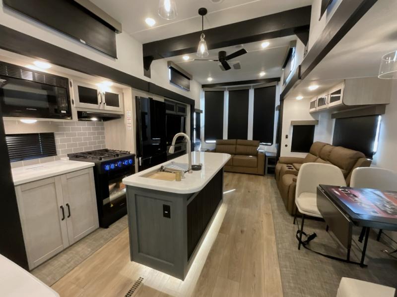Wherever your destination may be, you can be sure to enjoy it to the fullest with this trailer in tow! With two entry doors, you can enter in through the rear private bedroom or the main living area. The bedroom includes a king bed slide out, a wardrobe/closet to keep your clothes organized, plus a closet with washer and dryer prep. Just outside this room are steps that lead to the large loft area with a 58" x 58" bunk mat and a cabinet on one side, plus two 32" x 69" bunk mats on the other. There is also a cabinet and a wardrobe/closet for plenty of storage space. Once you've headed back downstairs, you can relax on the theater seating, front sofa, or table and chairs with a bench seating. And the chef of your group will love the kitchen with its residential style refrigerator and pantry, kitchen island, and four burner cooktop!