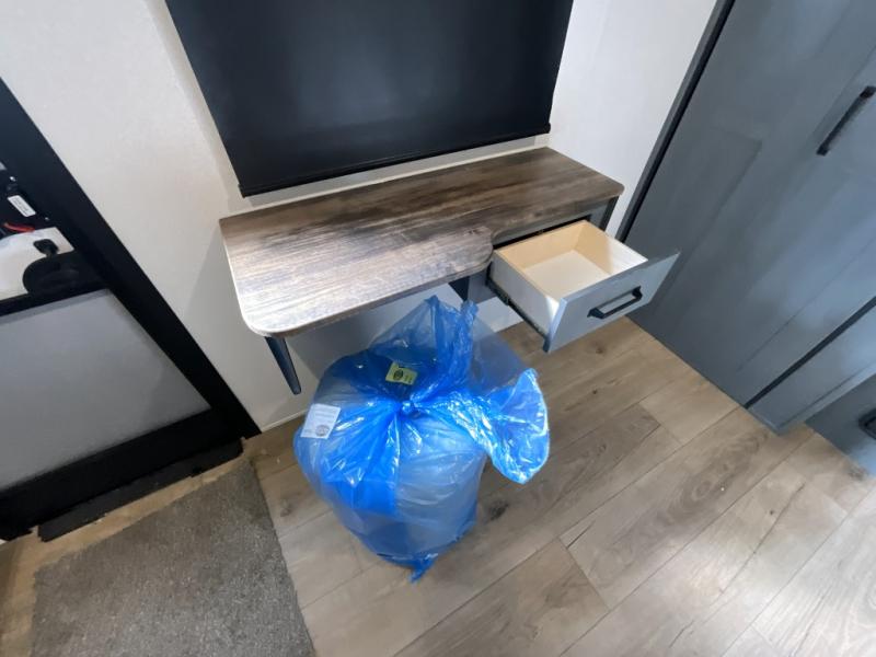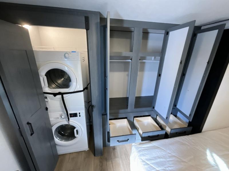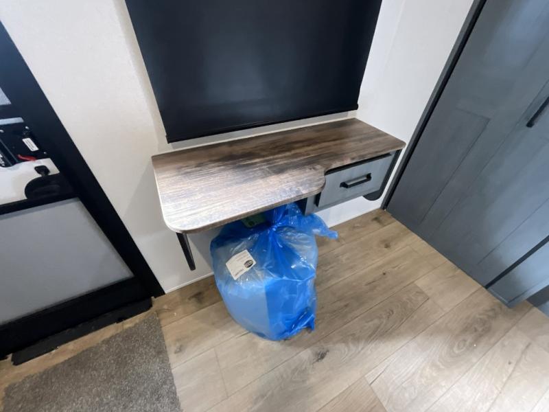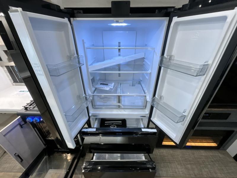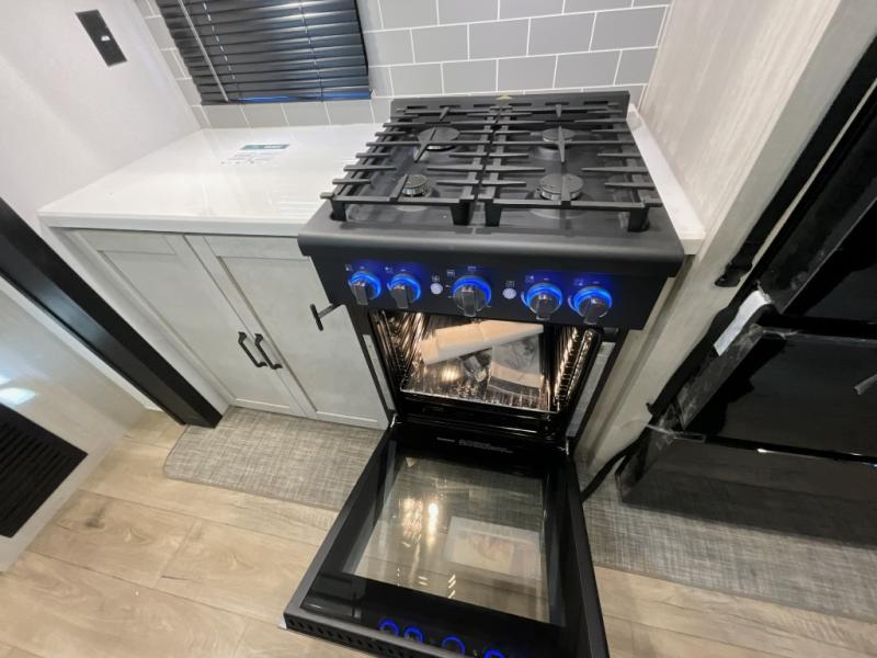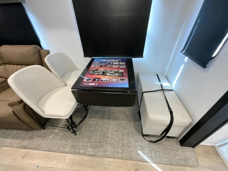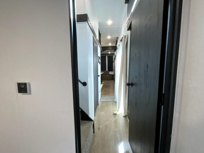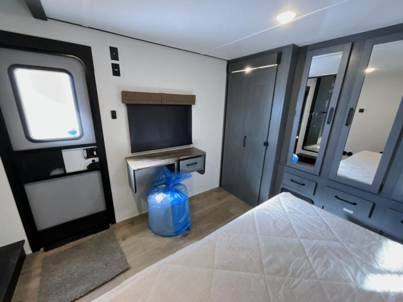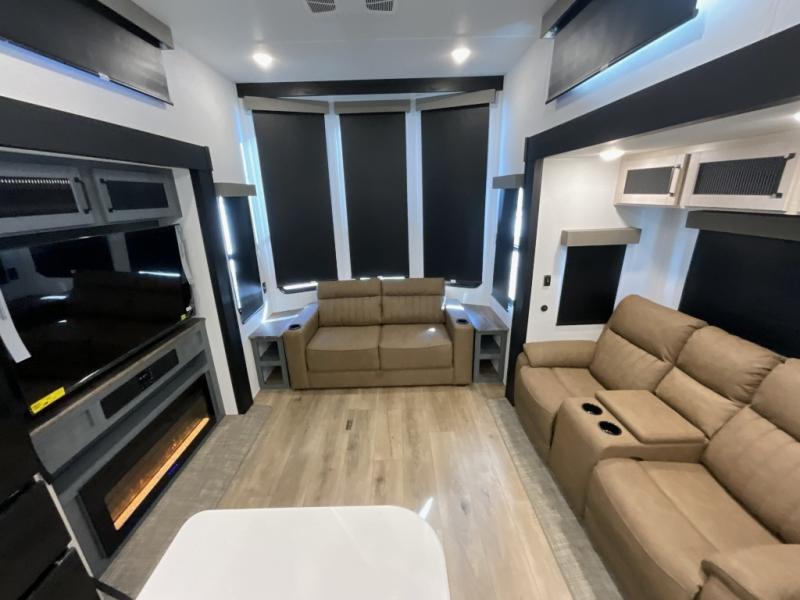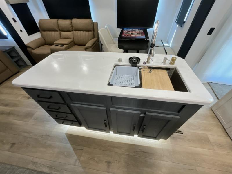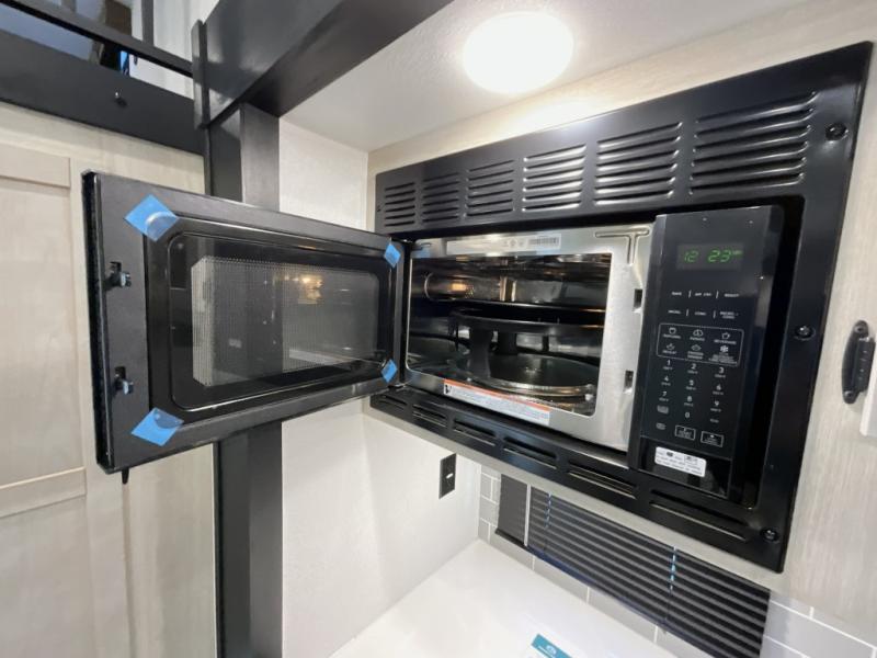 Wherever your destination may be, you can be sure to enjoy it to the fullest with this trailer in tow! With two entry doors, you can enter in through the rear private bedroom or the main living area. The bedroom includes a king bed slide out, a wardrobe/closet to keep your clothes organized, plus a closet with washer and dryer prep. Just outside this room are steps that lead to the large loft area with a 58" x 58" bunk mat and a cabinet on one side, plus two 32" x 69" bunk mats on the other. There is also a cabinet and a wardrobe/closet for plenty of storage space. Once you've headed back downstairs, you can relax on the theater seating, front sofa, or table and chairs with a bench seating. And the chef of your group will love the kitchen with its residential style refrigerator and pantry, kitchen island, and four burner cooktop!