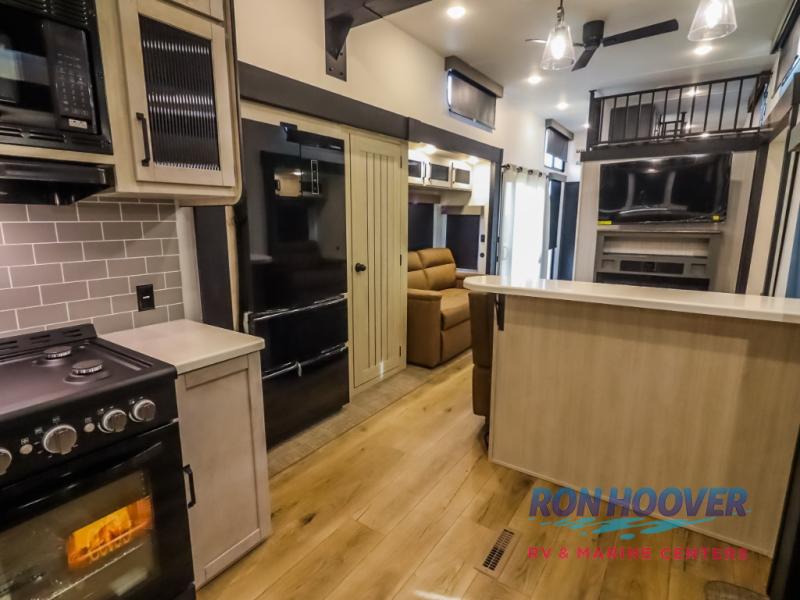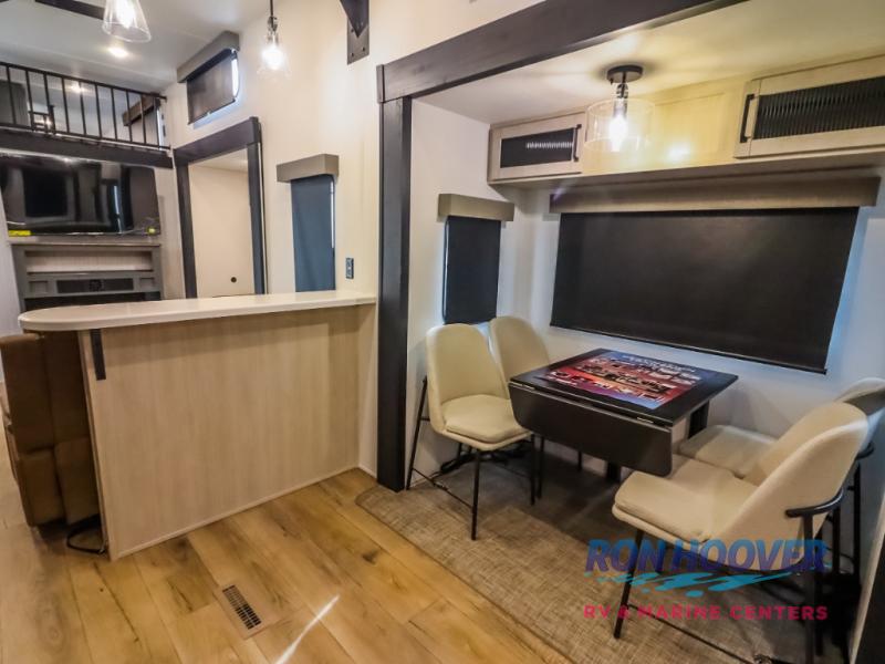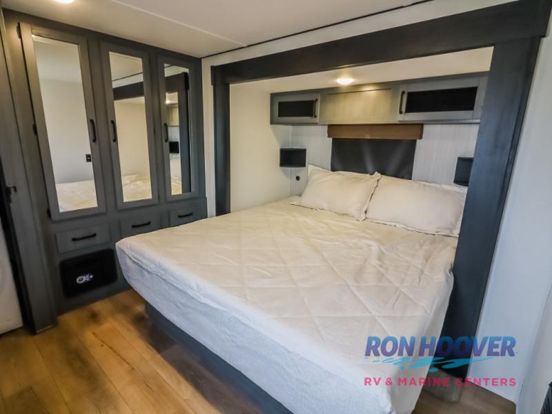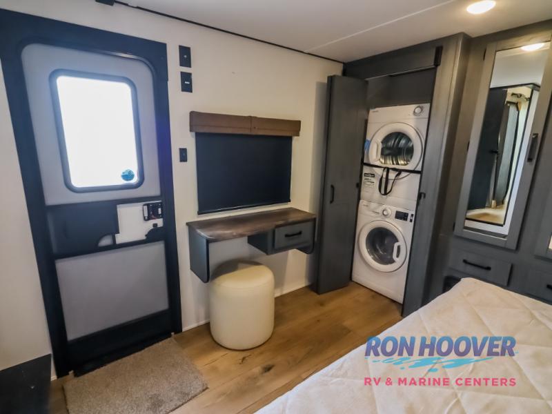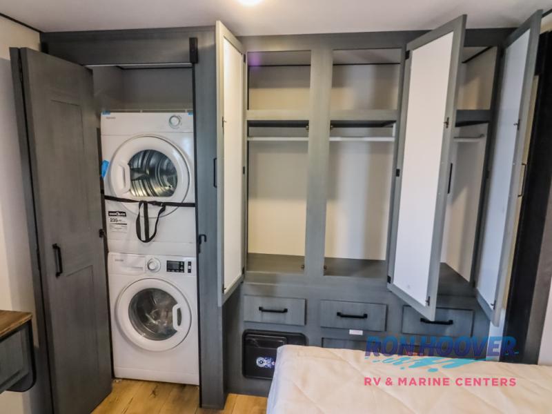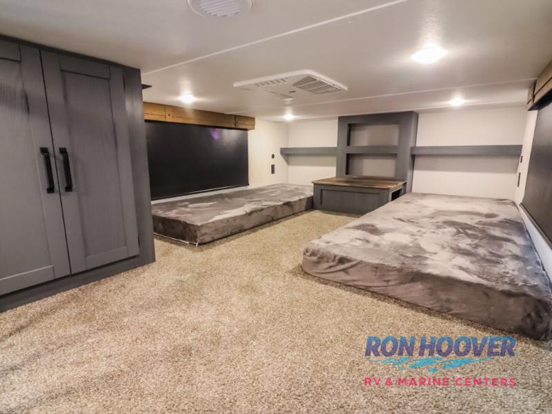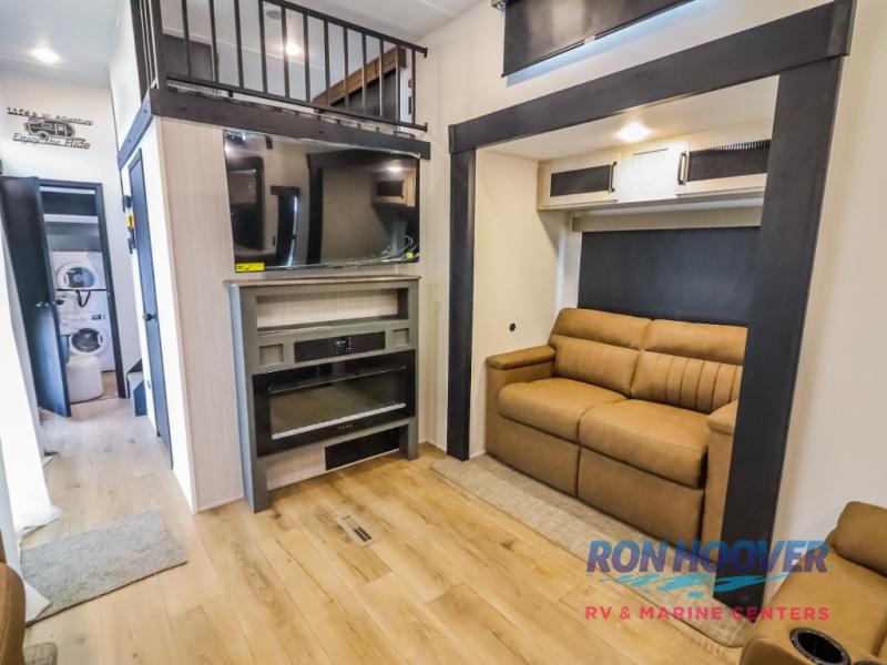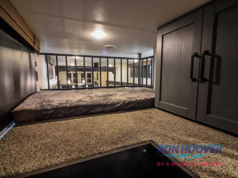 Wherever your destination may be, you can be sure to enjoy it to the fullest with this trailer in tow! With two entry doors, you can enter in through the rear private bedroom or the main living area. The bedroom includes a king bed slide out, a wardrobe/closet to keep your clothes organized, plus a closet with washer and dryer prep. Just outside this room are steps that lead to the large loft area with a 58" x 58" bunk mat and a cabinet on one side, plus two 32" x 69" bunk mats on the other. There is also a cabinet and a wardrobe/closet for plenty of storage space. Once you've headed back downstairs, you can relax on the theater seating, front sofa, or table and chairs with a bench seating. And the chef of your group will love the kitchen with its residential style refrigerator and pantry, kitchen island, and four burner cooktop!
