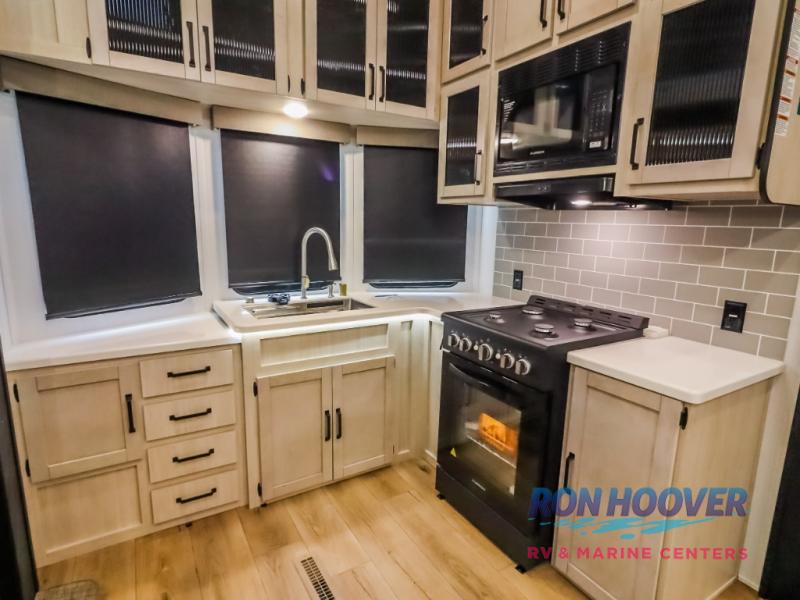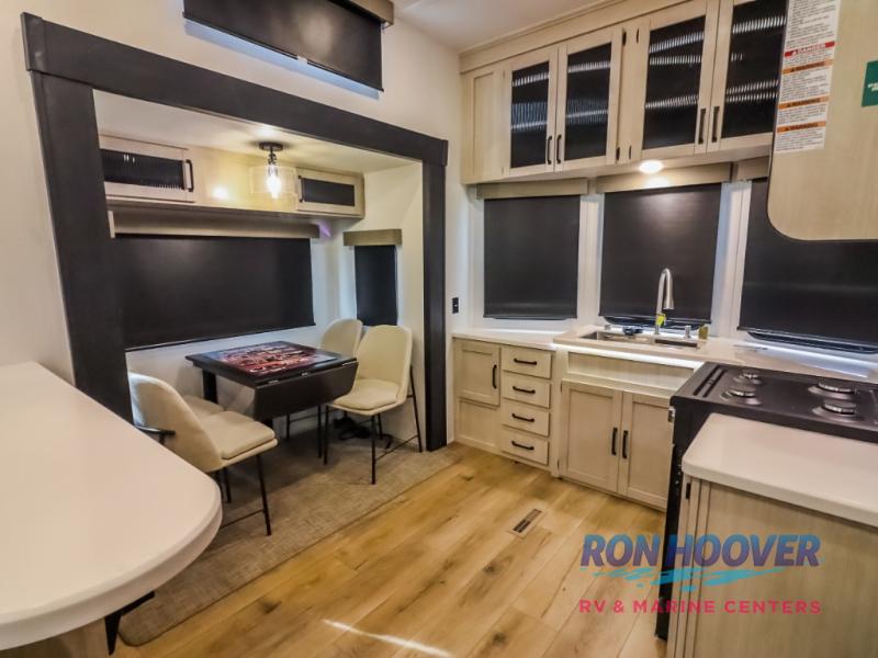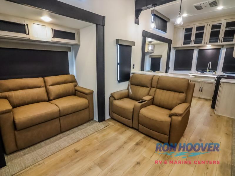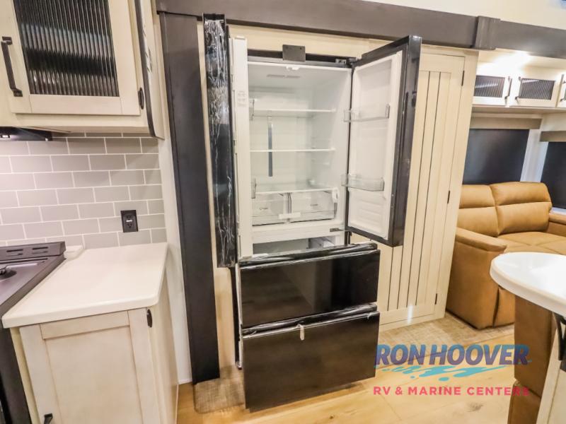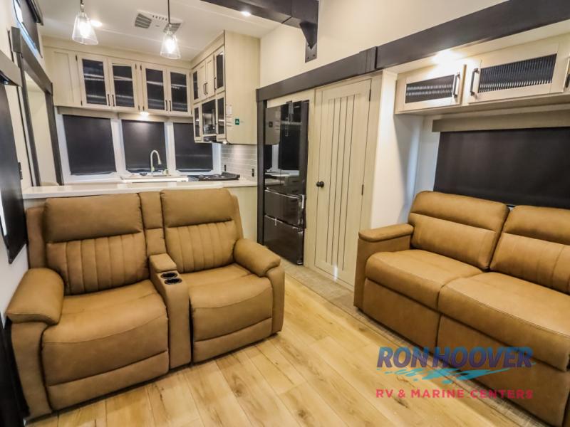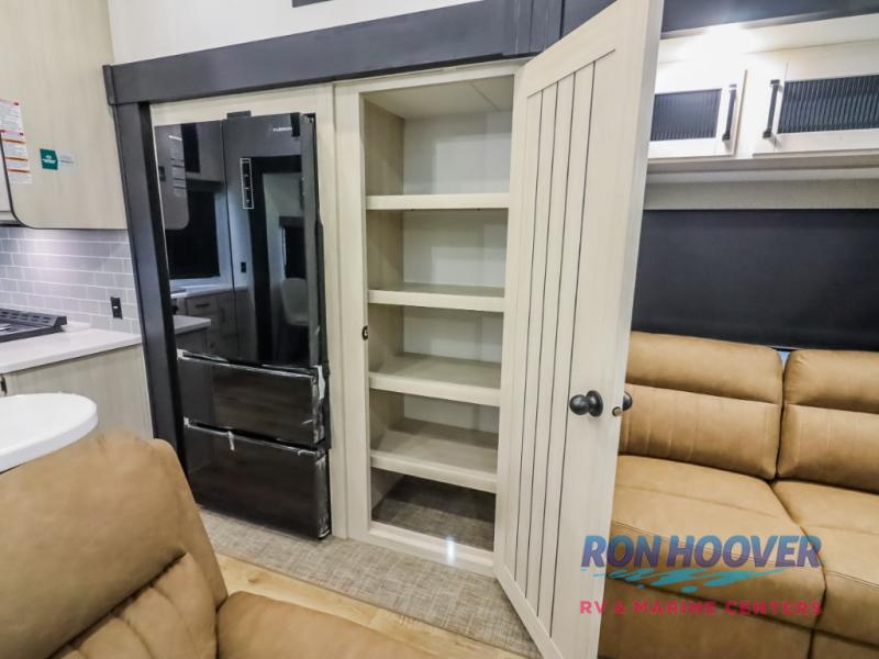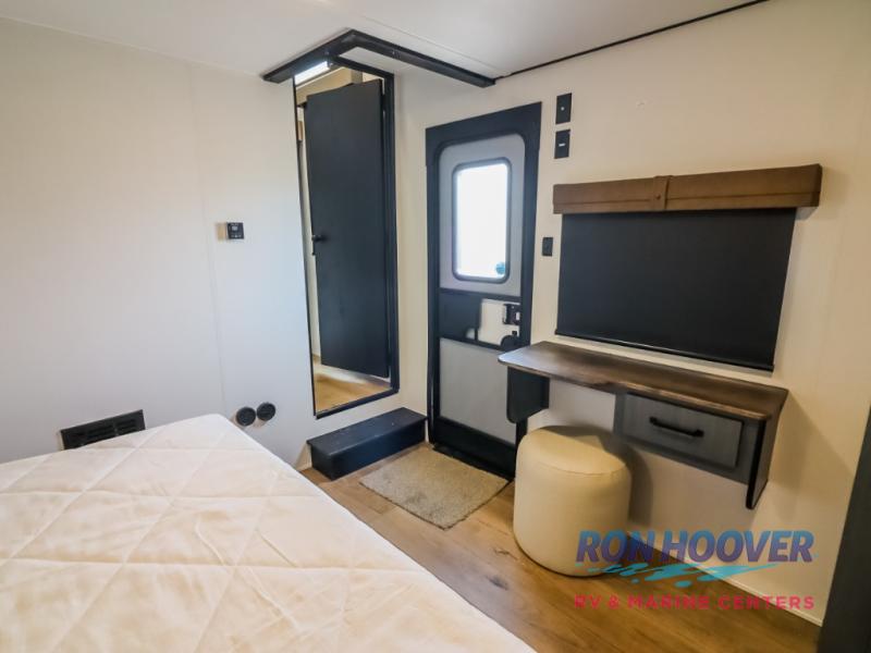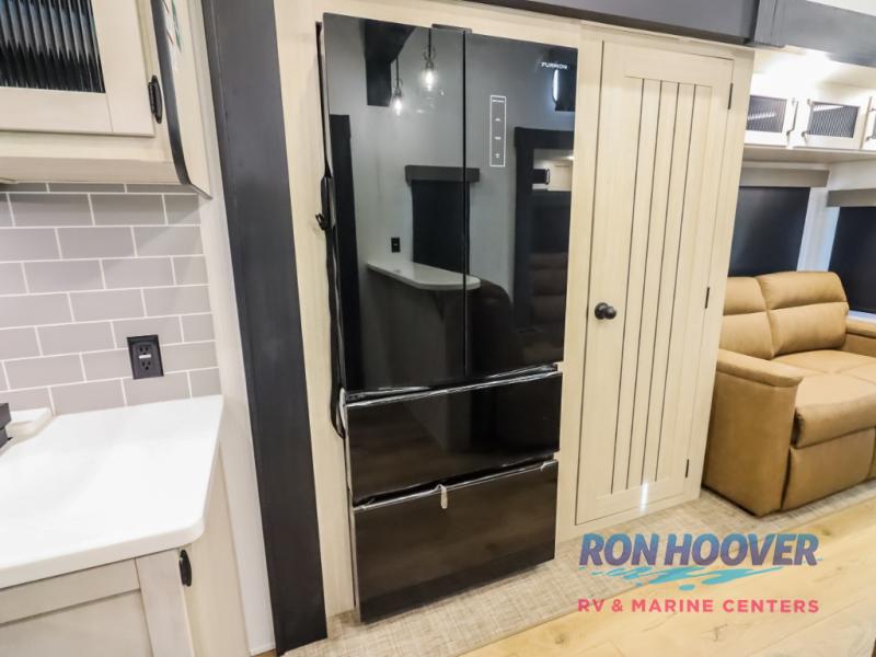 Wherever your destination may be, you can be sure to enjoy it to the fullest with this trailer in tow! With two entry doors, you can enter in through the rear private bedroom or the main living area. The bedroom includes a king bed slide out, a wardrobe/closet to keep your clothes organized, plus a closet with washer and dryer prep. Just outside this room are steps that lead to the large loft area with a 58" x 58" bunk mat and a cabinet on one side, plus two 32" x 69" bunk mats on the other. There is also a cabinet and a wardrobe/closet for plenty of storage space. Once you've headed back downstairs, you can relax on the theater seating, front sofa, or table and chairs with a bench seating. And the chef of your group will love the kitchen with its residential style refrigerator and pantry, kitchen island, and four burner cooktop!