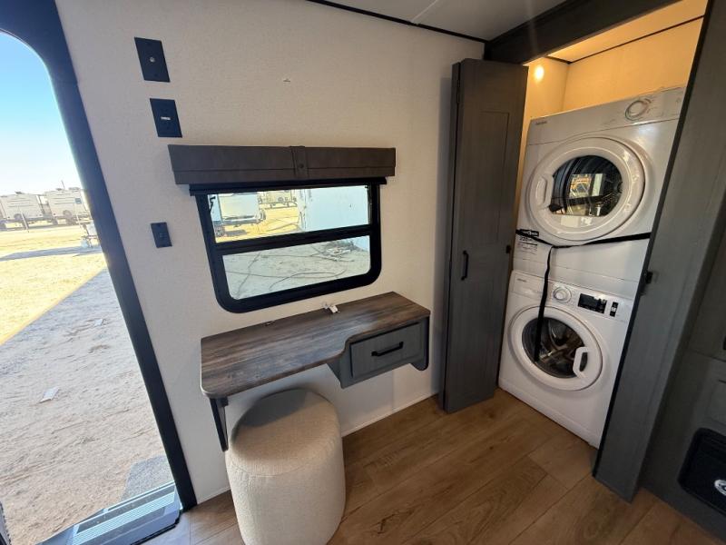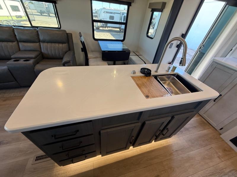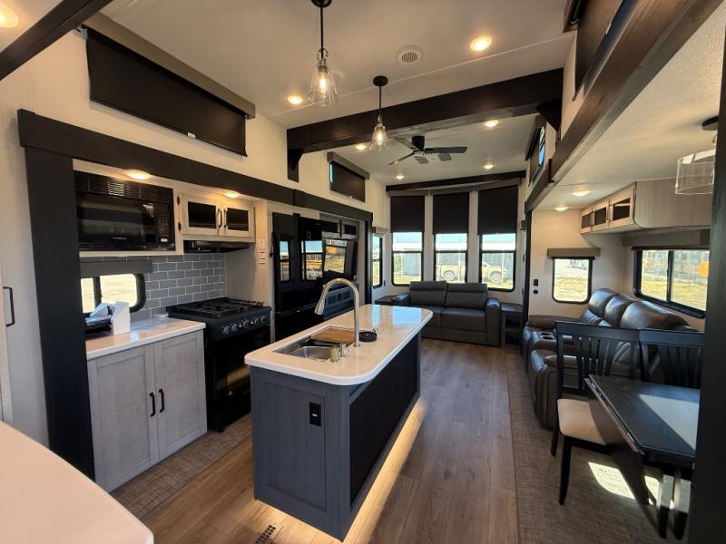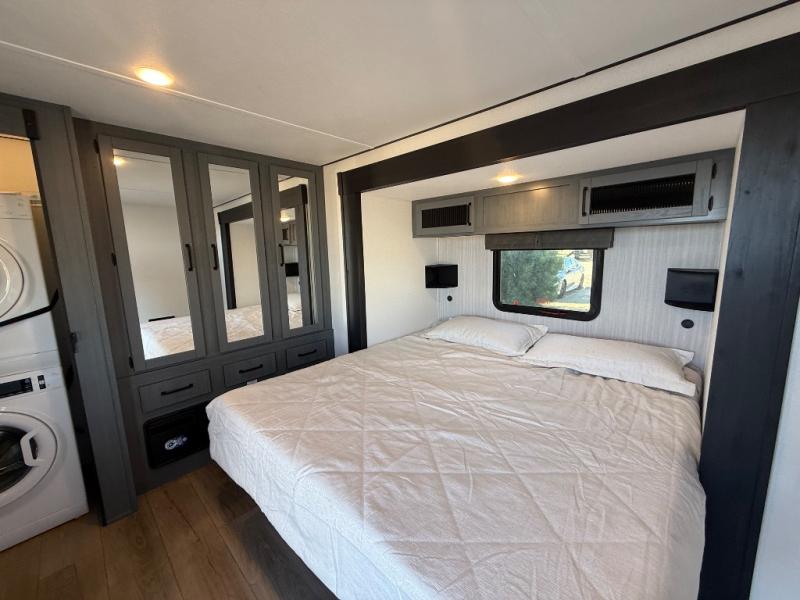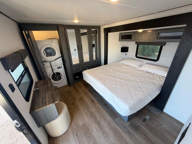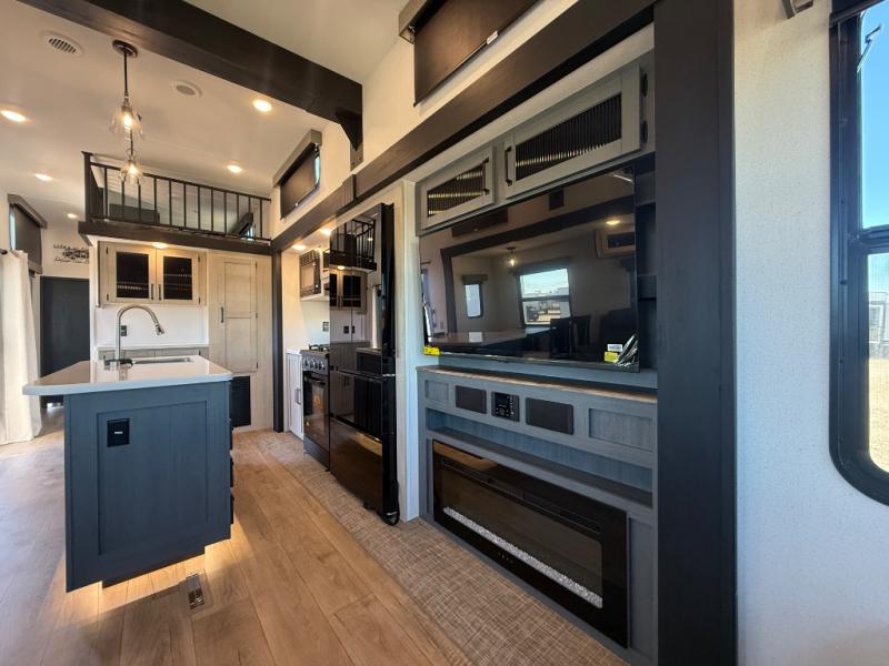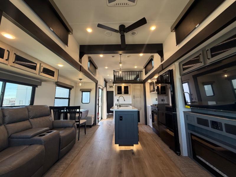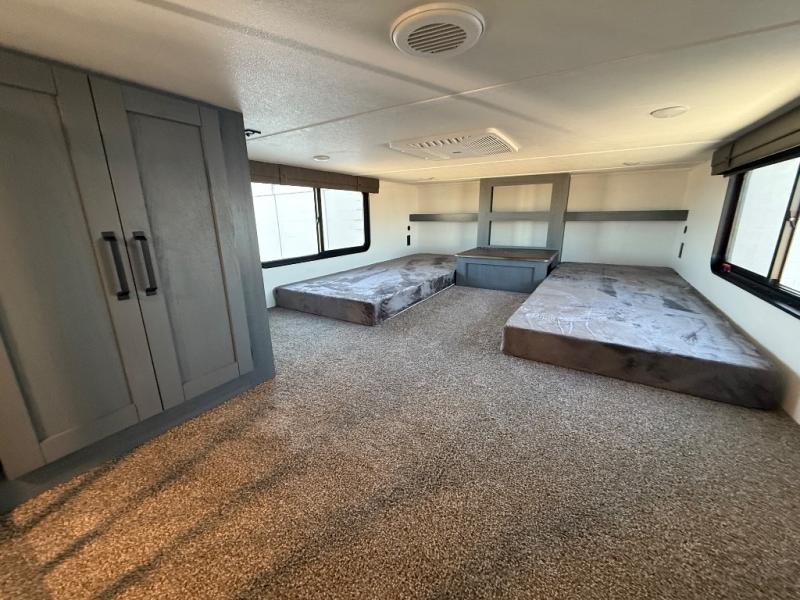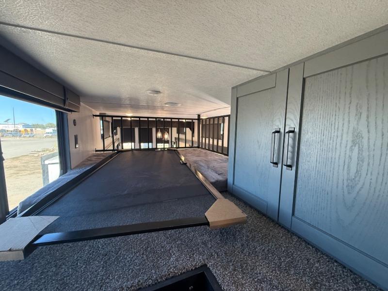 Wherever your destination may be, you can be sure to enjoy it to the fullest with this trailer in tow! With two entry doors, you can enter in through the rear private bedroom or the main living area. The bedroom includes a king bed slide out, a wardrobe/closet to keep your clothes organized, plus a closet with washer and dryer prep. Just outside this room are steps that lead to the large loft area with a 58" x 58" bunk mat and a cabinet on one side, plus two 32" x 69" bunk mats on the other. There is also a cabinet and a wardrobe/closet for plenty of storage space. Once you've headed back downstairs, you can relax on the theater seating, front sofa, or table and chairs with a bench seating. And the chef of your group will love the kitchen with its residential style refrigerator and pantry, kitchen island, and four burner cooktop!