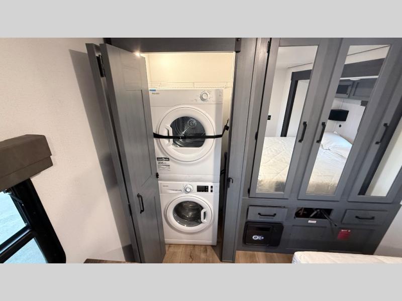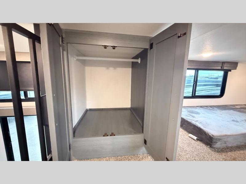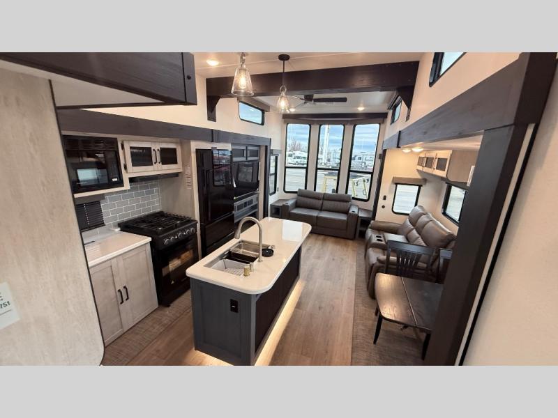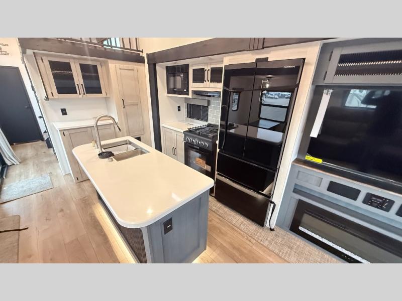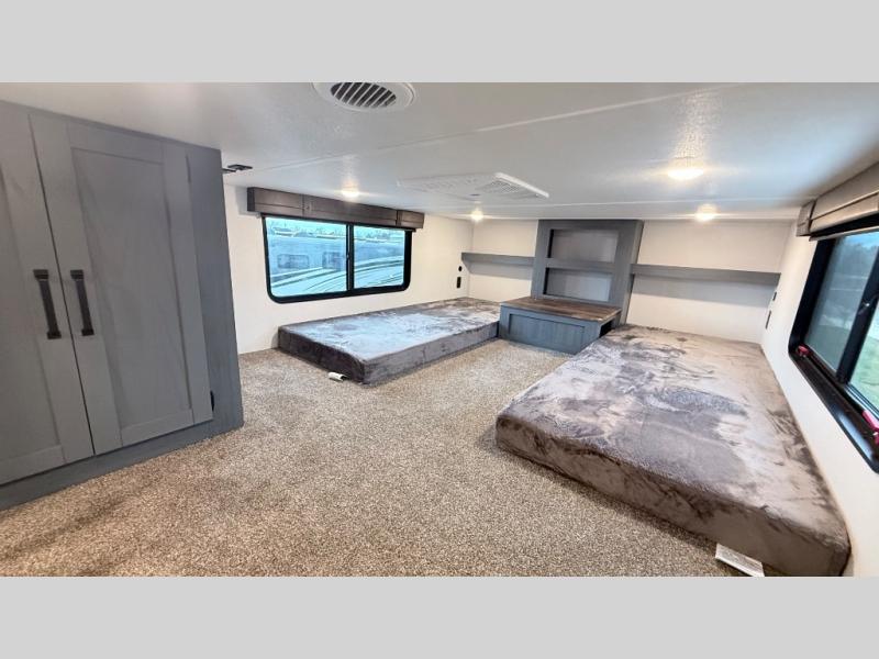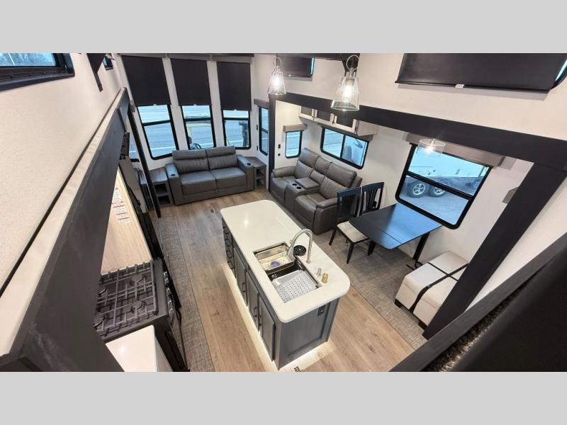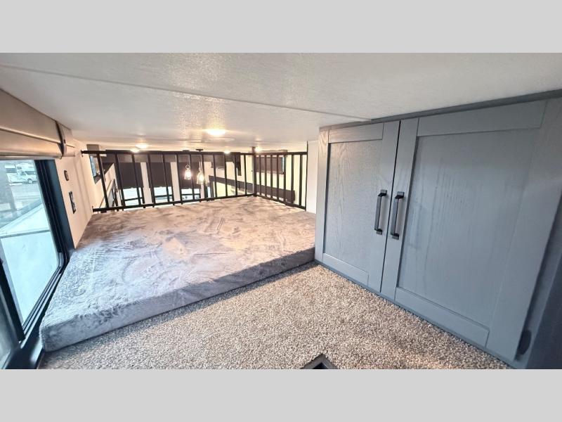 Wherever your destination may be, you can be sure to enjoy it to the fullest with this trailer in tow! With two entry doors, you can enter in through the rear private bedroom or the main living area. The bedroom includes a king bed slide out, a wardrobe/closet to keep your clothes organized, plus a closet with washer and dryer prep. Just outside this room are steps that lead to the large loft area with a 58" x 58" bunk mat and a cabinet on one side, plus two 32" x 69" bunk mats on the other. There is also a cabinet and a wardrobe/closet for plenty of storage space. Once you've headed back downstairs, you can relax on the theater seating, front sofa, or table and chairs with a bench seating. And the chef of your group will love the kitchen with its residential style refrigerator and pantry, kitchen island, and four burner cooktop!