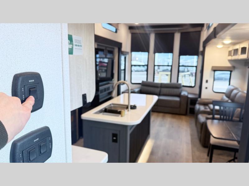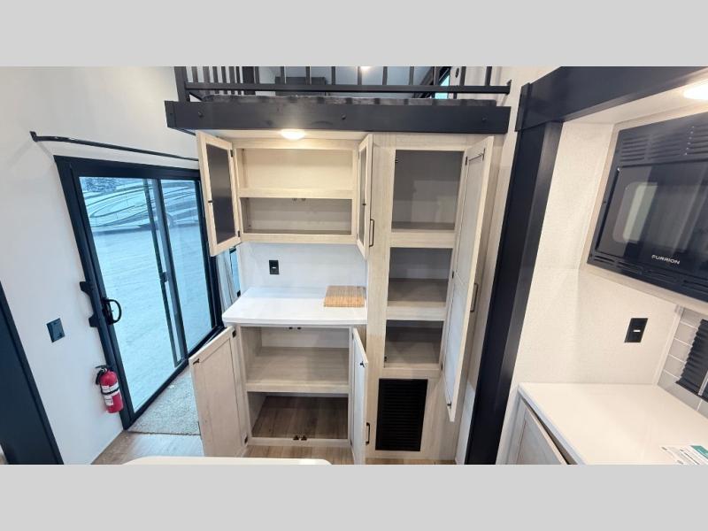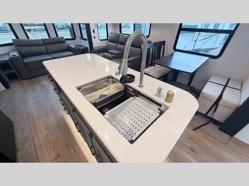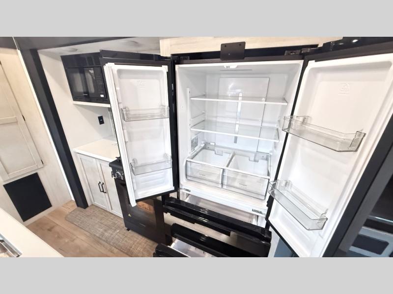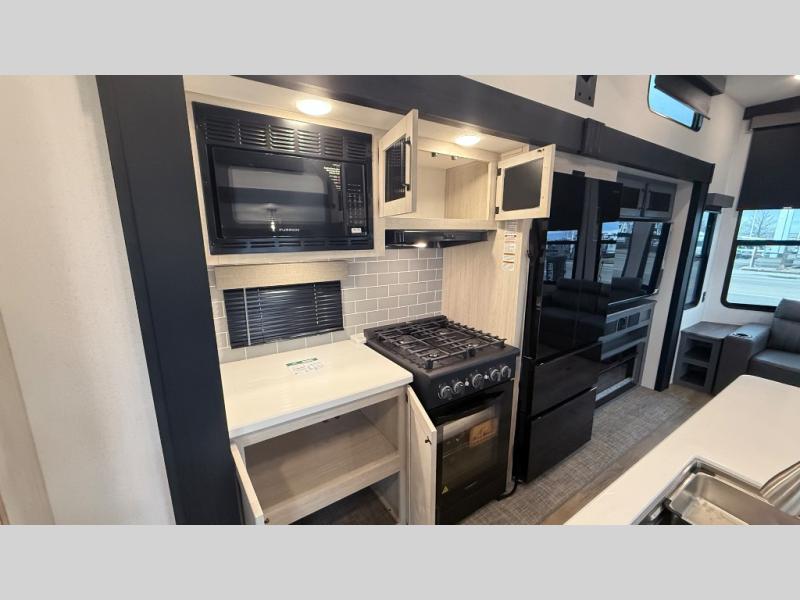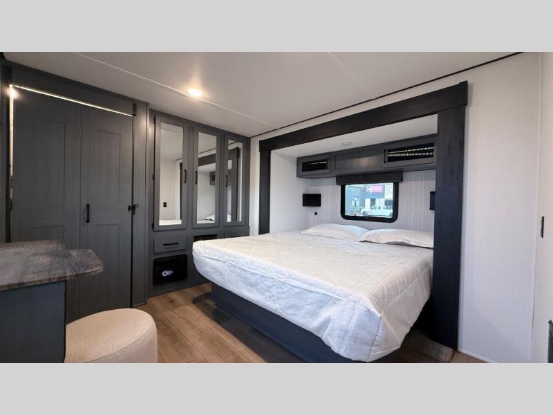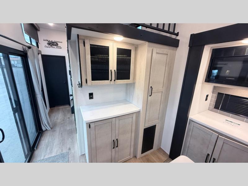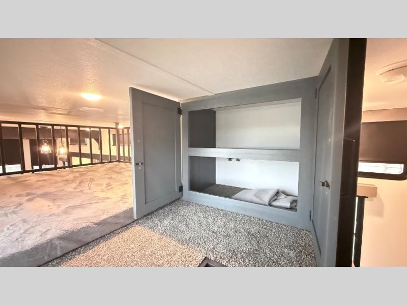 Wherever your destination may be, you can be sure to enjoy it to the fullest with this trailer in tow! With two entry doors, you can enter in through the rear private bedroom or the main living area. The bedroom includes a king bed slide out, a wardrobe/closet to keep your clothes organized, plus a closet with washer and dryer prep. Just outside this room are steps that lead to the large loft area with a 58" x 58" bunk mat and a cabinet on one side, plus two 32" x 69" bunk mats on the other. There is also a cabinet and a wardrobe/closet for plenty of storage space. Once you've headed back downstairs, you can relax on the theater seating, front sofa, or table and chairs with a bench seating. And the chef of your group will love the kitchen with its residential style refrigerator and pantry, kitchen island, and four burner cooktop!