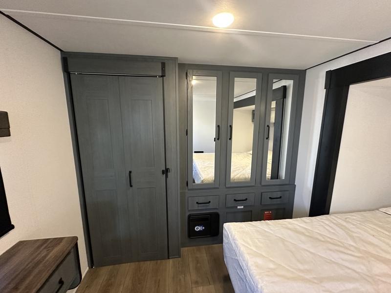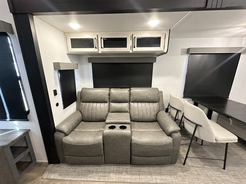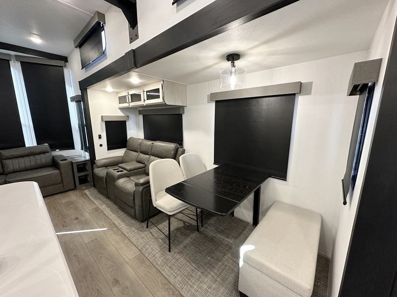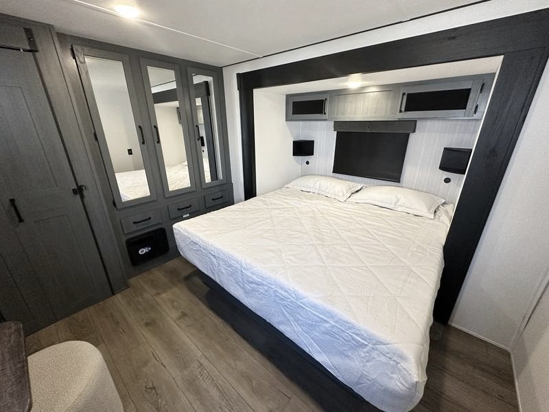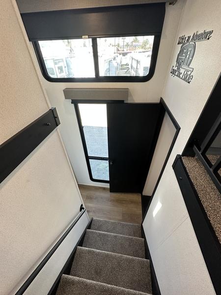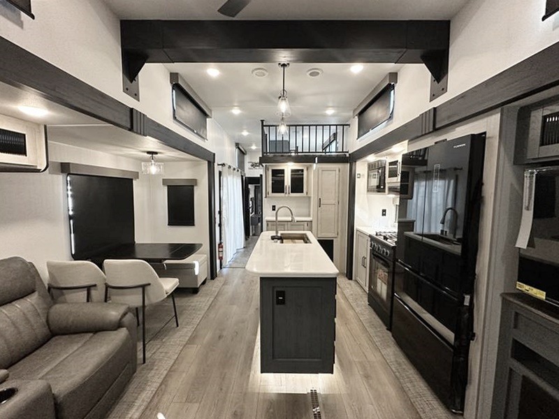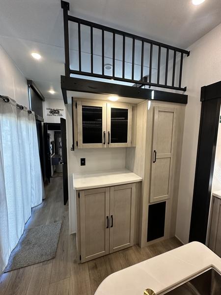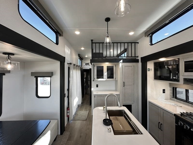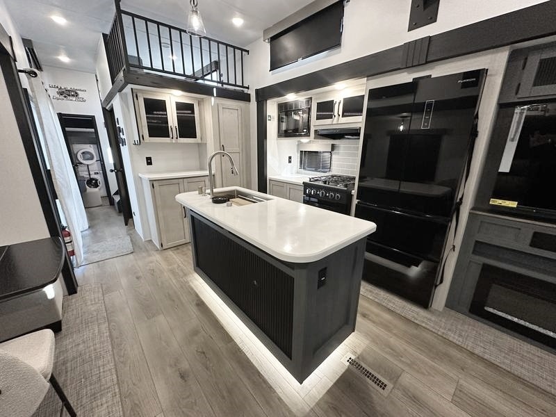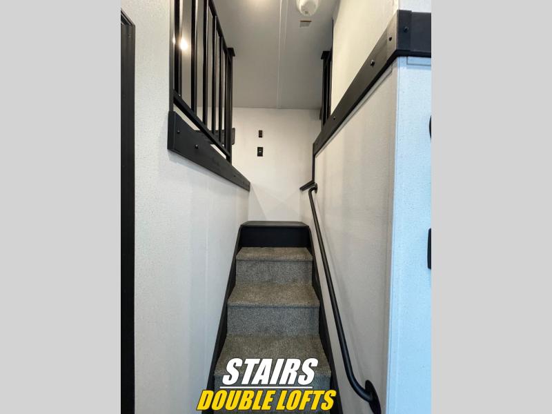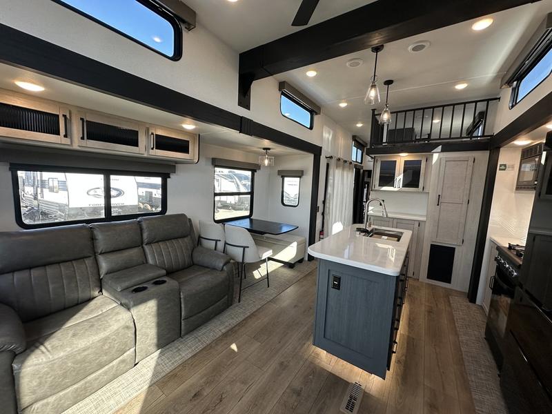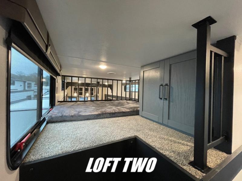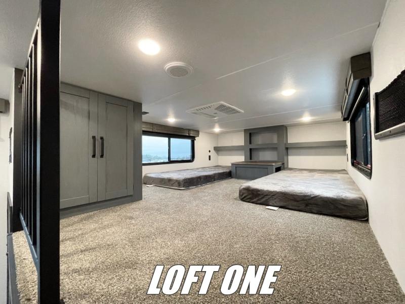 Wherever your destination may be, you can be sure to enjoy it to the fullest with this trailer in tow! With two entry doors, you can enter in through the rear private bedroom or the main living area. The bedroom includes a king bed slide out, a wardrobe/closet to keep your clothes organized, plus a closet with washer and dryer prep. Just outside this room are steps that lead to the large loft area with a 58" x 58" bunk mat and a cabinet on one side, plus two 32" x 69" bunk mats on the other. There is also a cabinet and a wardrobe/closet for plenty of storage space. Once you've headed back downstairs, you can relax on the theater seating, front sofa, or table and chairs with a bench seating. And the chef of your group will love the kitchen with its residential style refrigerator and pantry, kitchen island, and four burner cooktop!