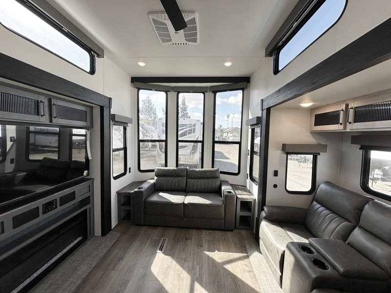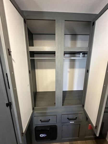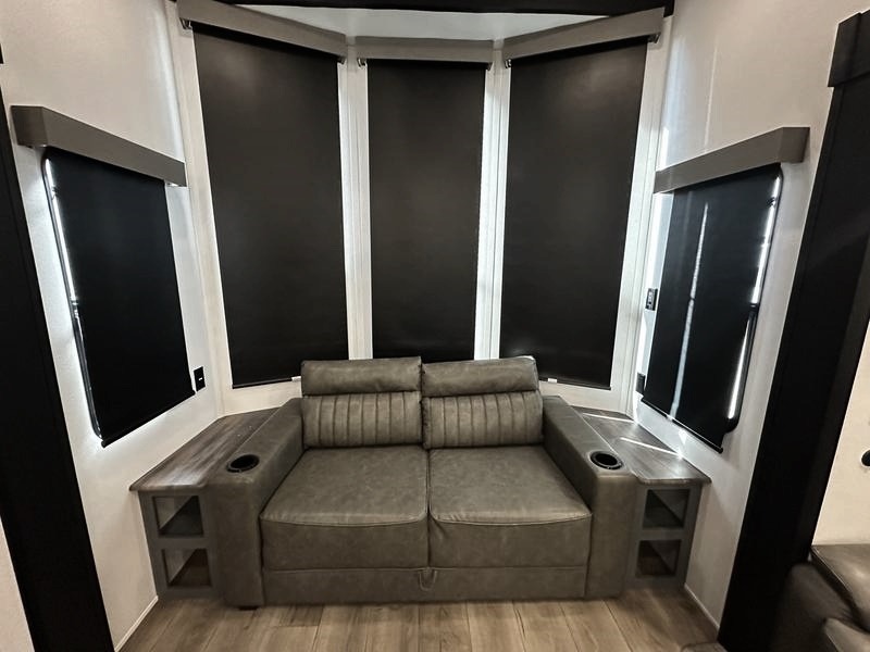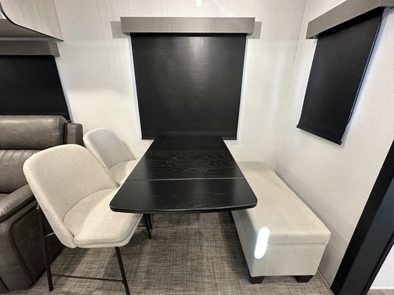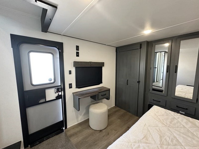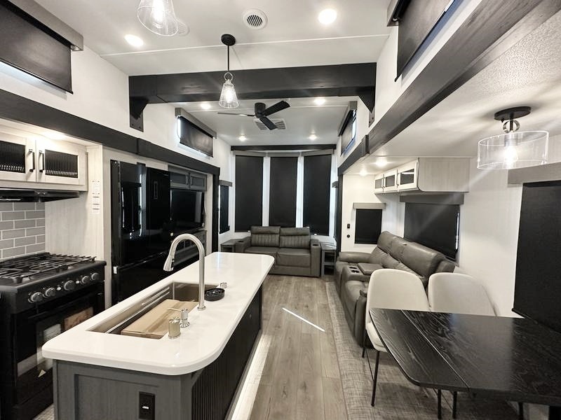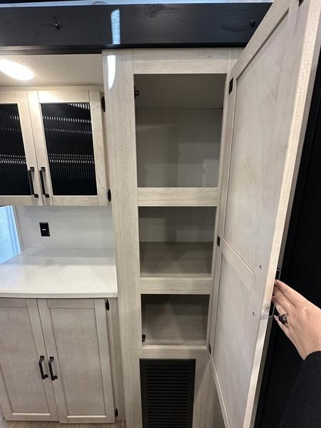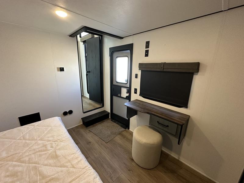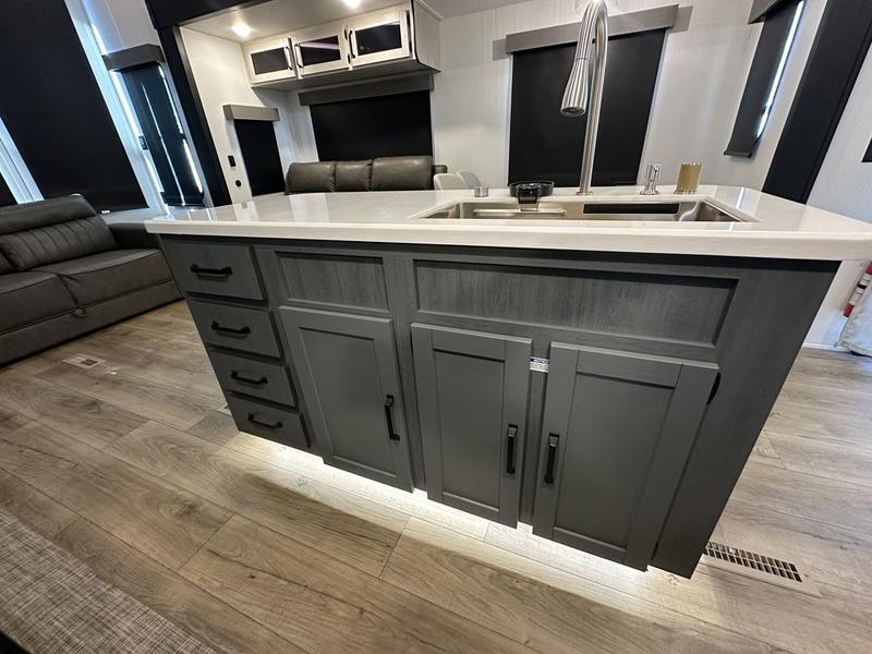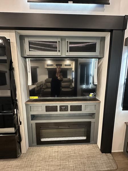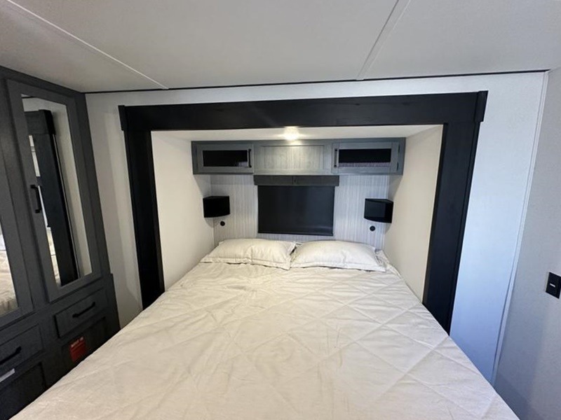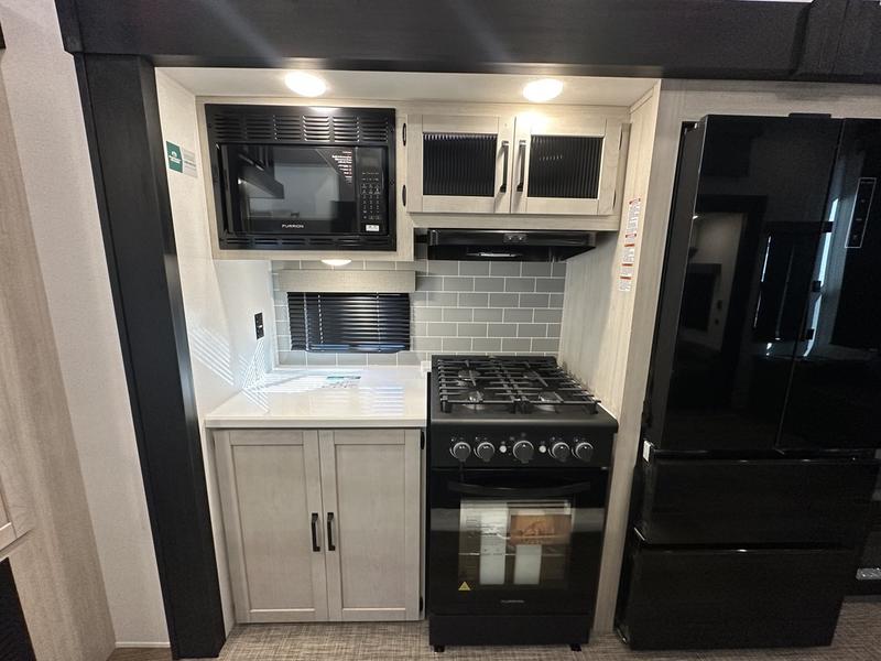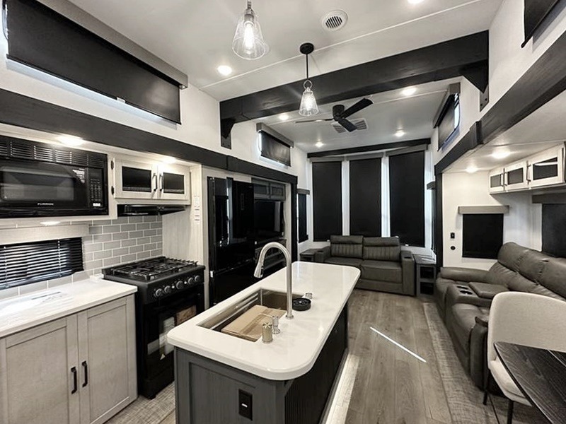 Wherever your destination may be, you can be sure to enjoy it to the fullest with this trailer in tow! With two entry doors, you can enter in through the rear private bedroom or the main living area. The bedroom includes a king bed slide out, a wardrobe/closet to keep your clothes organized, plus a closet with washer and dryer prep. Just outside this room are steps that lead to the large loft area with a 58" x 58" bunk mat and a cabinet on one side, plus two 32" x 69" bunk mats on the other. There is also a cabinet and a wardrobe/closet for plenty of storage space. Once you've headed back downstairs, you can relax on the theater seating, front sofa, or table and chairs with a bench seating. And the chef of your group will love the kitchen with its residential style refrigerator and pantry, kitchen island, and four burner cooktop!