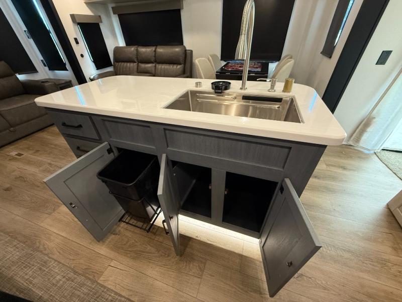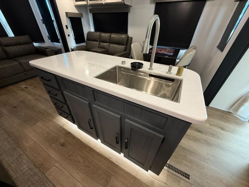 Large kitchen island with solid countertop and undermount sink (in upgraded package).