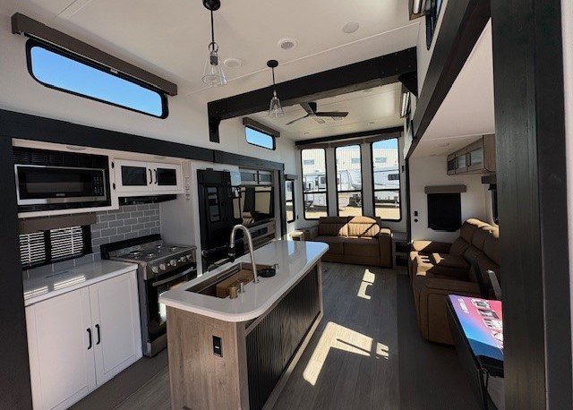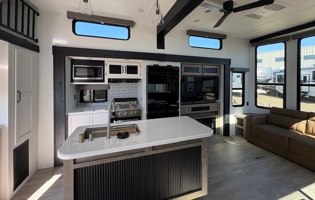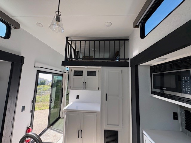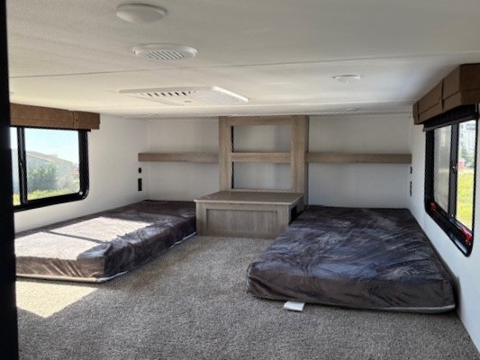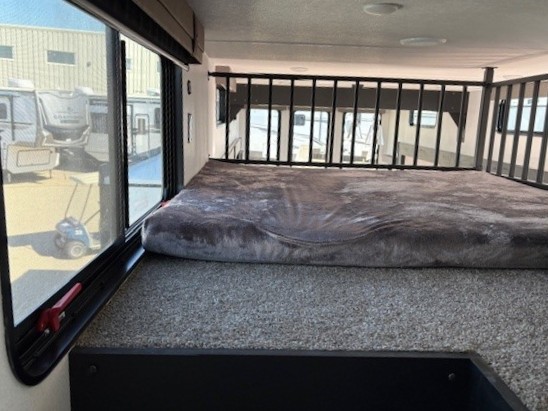 Wherever your destination may be, you can be sure to enjoy it to the fullest with this trailer in tow! With two entry doors, you can enter in through the rear private bedroom or the main living area. The bedroom includes a king bed slide out, a wardrobe/closet to keep your clothes organized, plus a closet with washer and dryer prep. Just outside this room are steps that lead to the large loft area with a 58" x 58" bunk mat and a cabinet on one side, plus two 32" x 69" bunk mats on the other. There is also a cabinet and a wardrobe/closet for plenty of storage space. Once you've headed back downstairs, you can relax on the theater seating, front sofa, or table and chairs with a bench seating. And the chef of your group will love the kitchen with its residential style refrigerator and pantry, kitchen island, and four burner cooktop!