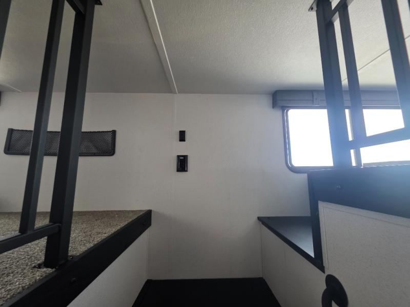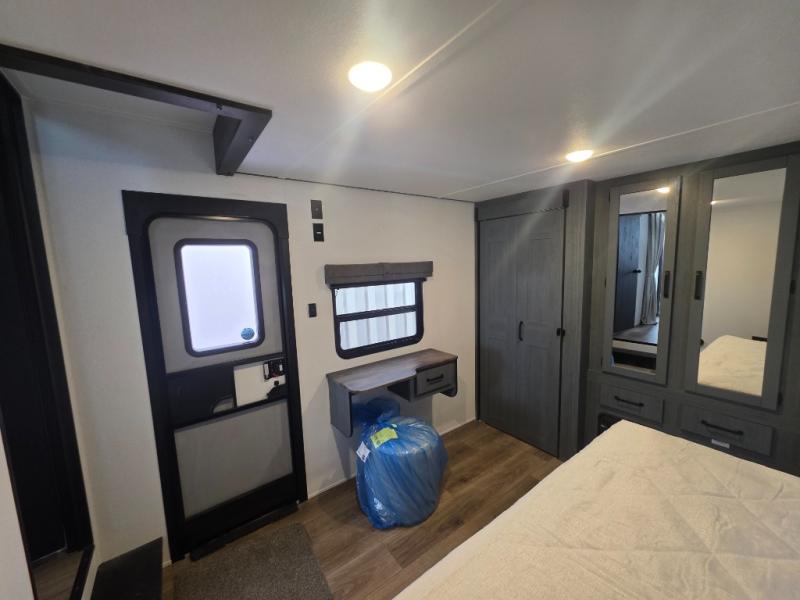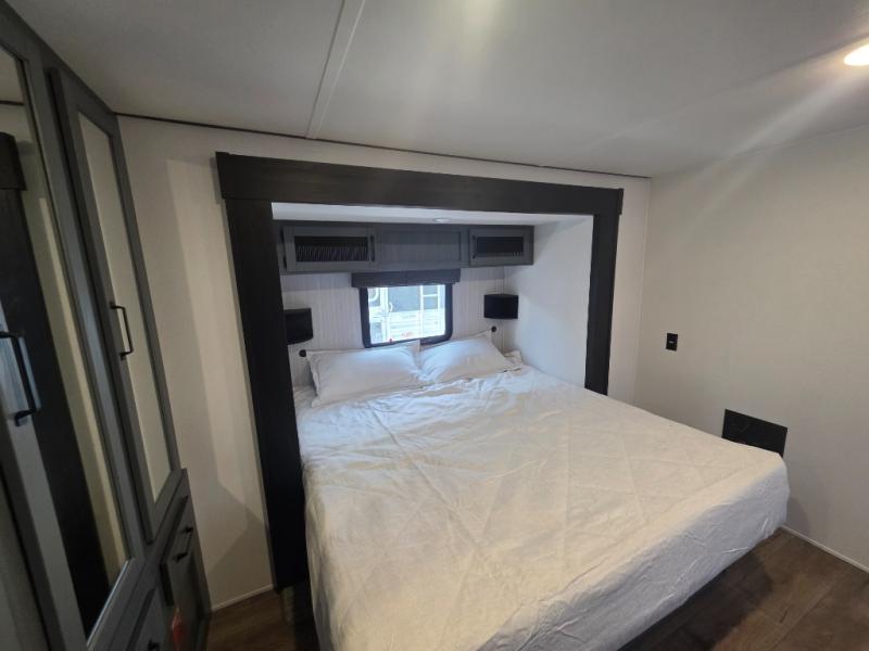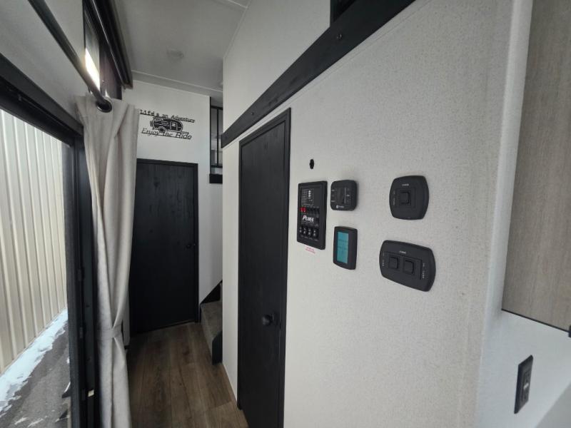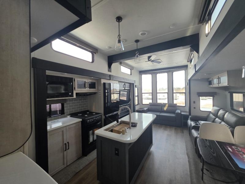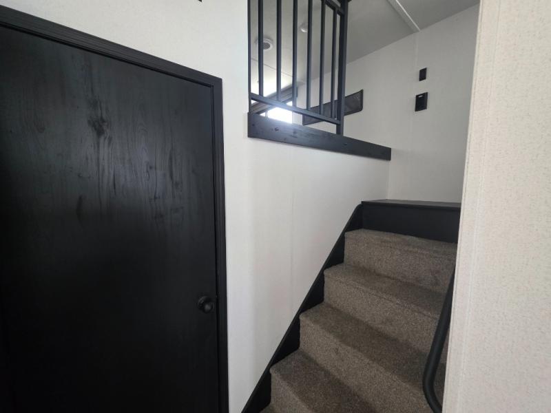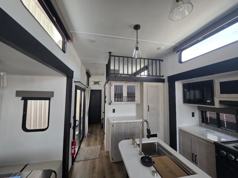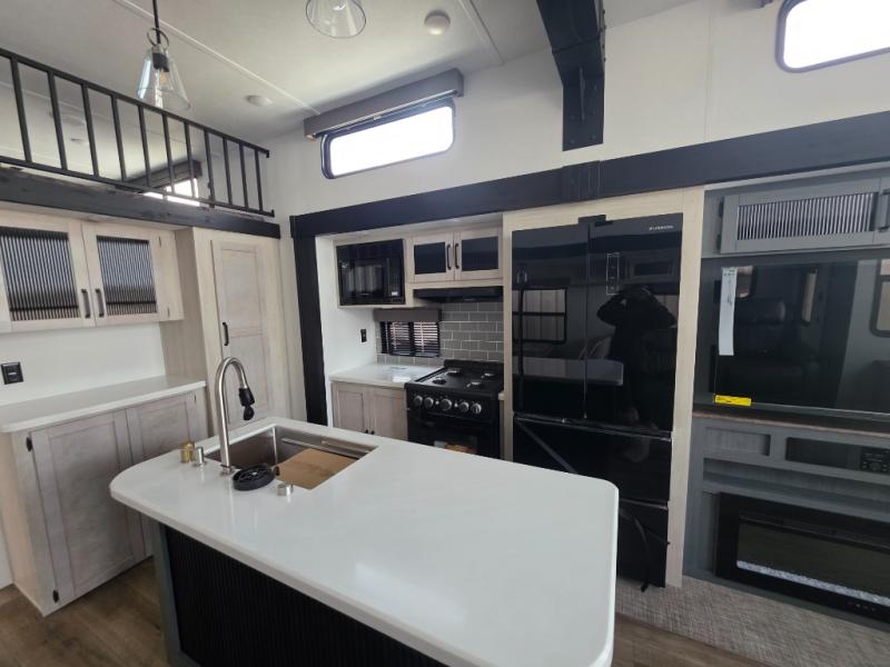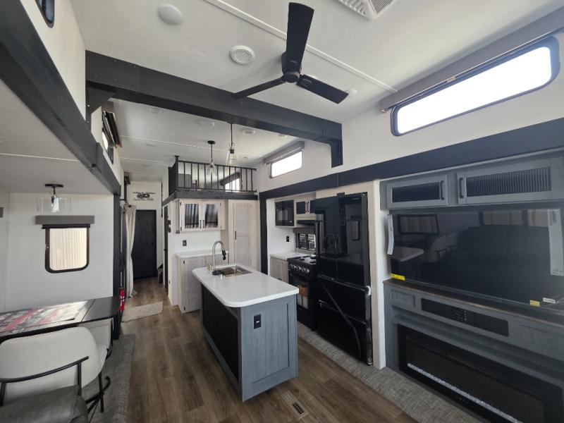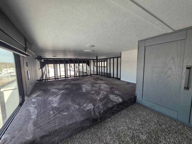 Wherever your destination may be, you can be sure to enjoy it to the fullest with this trailer in tow! With two entry doors, you can enter in through the rear private bedroom or the main living area. The bedroom includes a king bed slide out, a wardrobe/closet to keep your clothes organized, plus a closet with washer and dryer prep. Just outside this room are steps that lead to the large loft area with a 58" x 58" bunk mat and a cabinet on one side, plus two 32" x 69" bunk mats on the other. There is also a cabinet and a wardrobe/closet for plenty of storage space. Once you've headed back downstairs, you can relax on the theater seating, front sofa, or table and chairs with a bench seating. And the chef of your group will love the kitchen with its residential style refrigerator and pantry, kitchen island, and four burner cooktop!