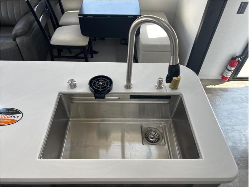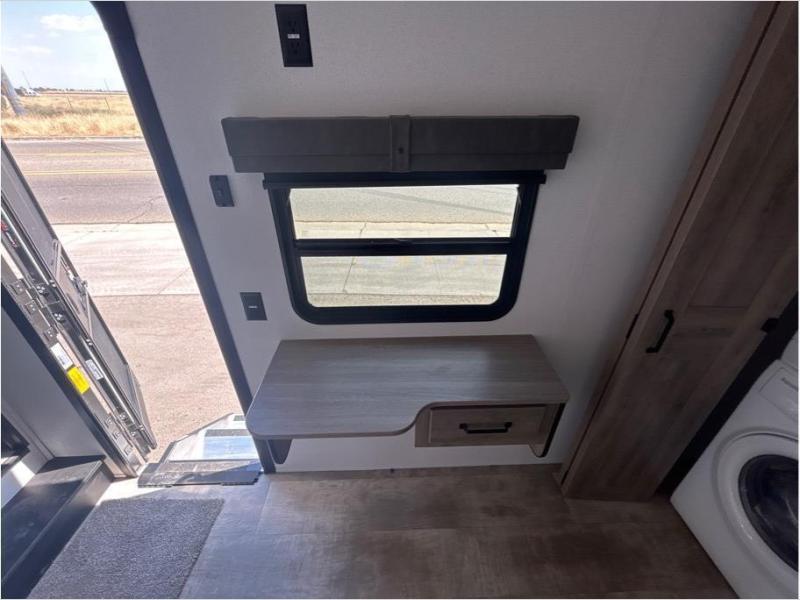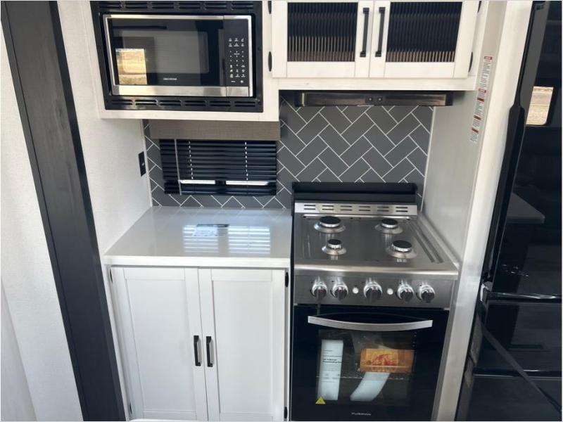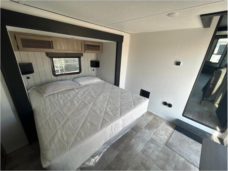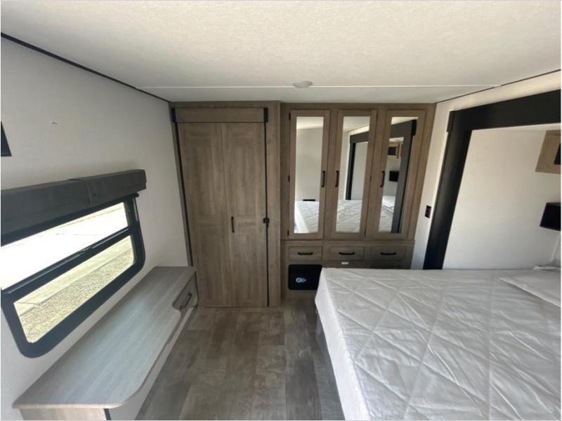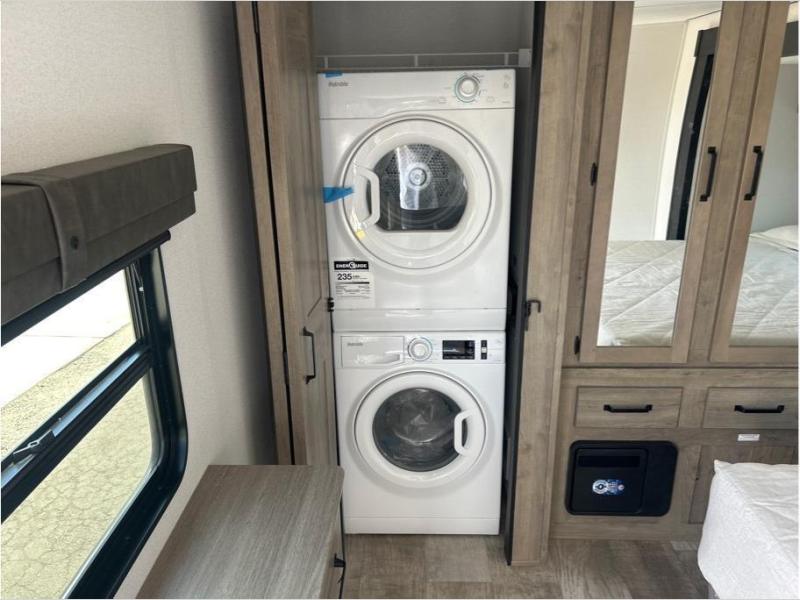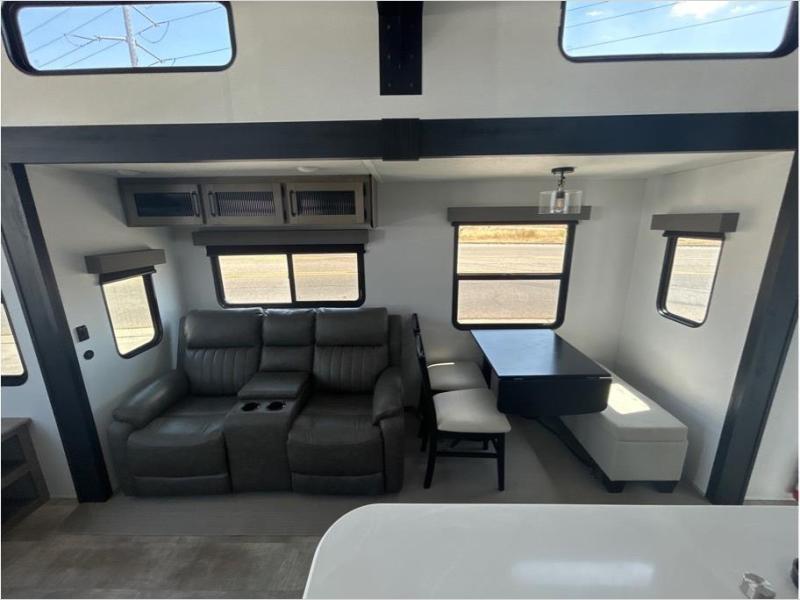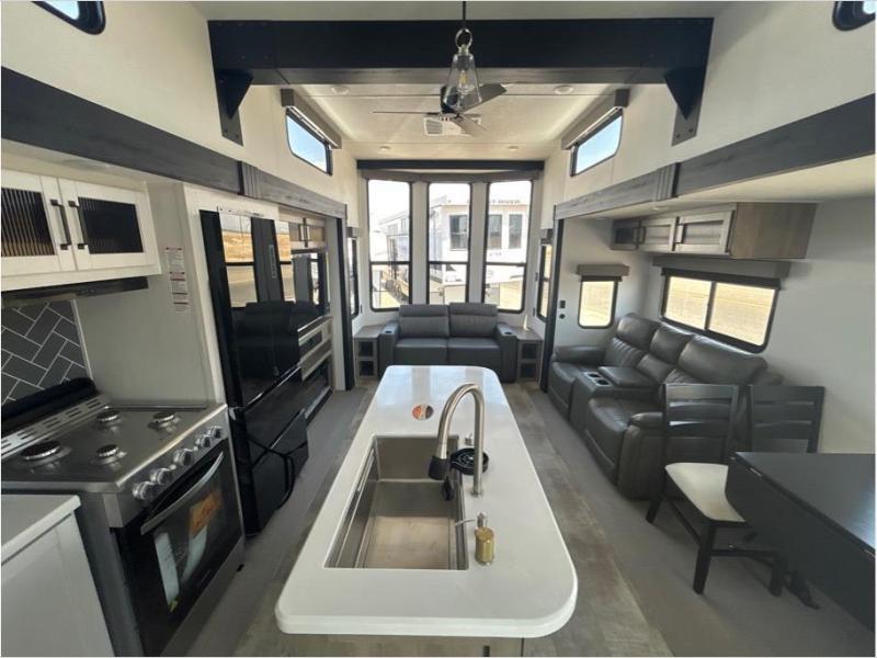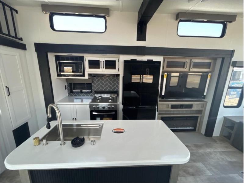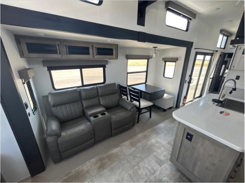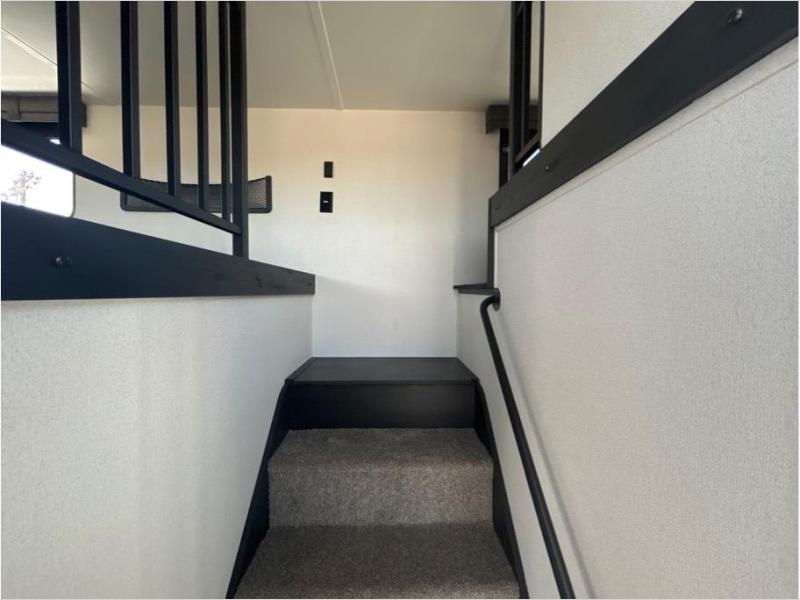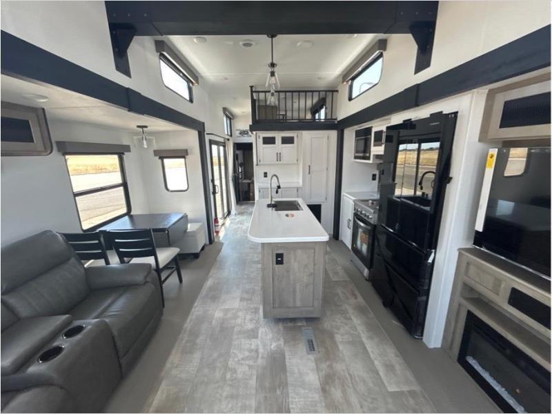 Wherever your destination may be, you can be sure to enjoy it to the fullest with this trailer in tow! With two entry doors, you can enter in through the rear private bedroom or the main living area. The bedroom includes a king bed slide out, a wardrobe/closet to keep your clothes organized, plus a closet with washer and dryer prep. Just outside this room are steps that lead to the large loft area with a 58" x 58" bunk mat and a cabinet on one side, plus two 32" x 69" bunk mats on the other. There is also a cabinet and a wardrobe/closet for plenty of storage space. Once you've headed back downstairs, you can relax on the theater seating, front sofa, or table and chairs with a bench seating. And the chef of your group will love the kitchen with its residential style refrigerator and pantry, kitchen island, and four burner cooktop!