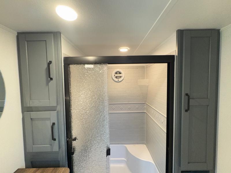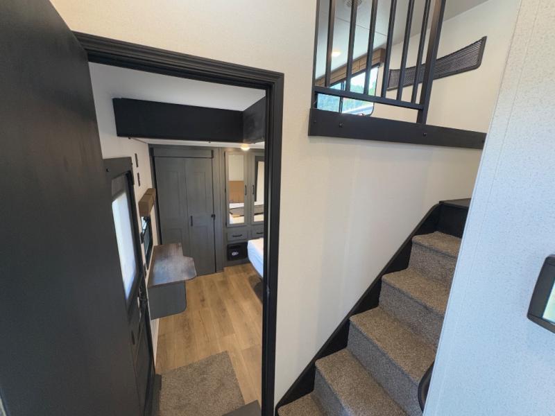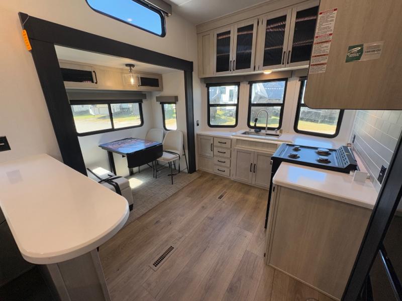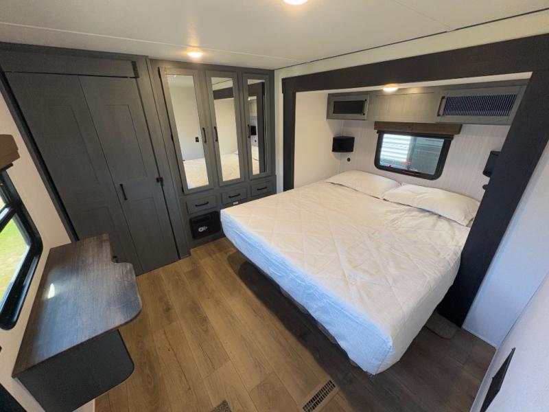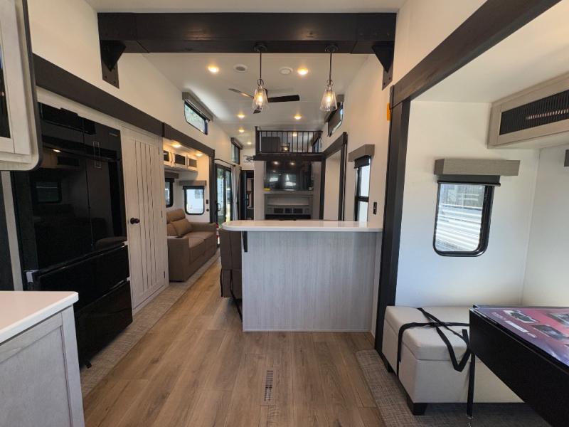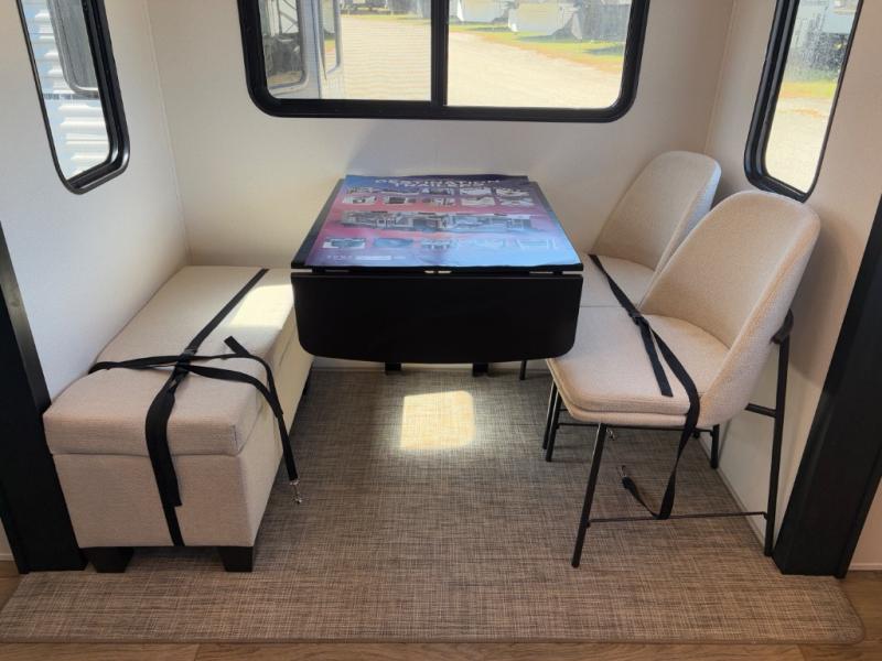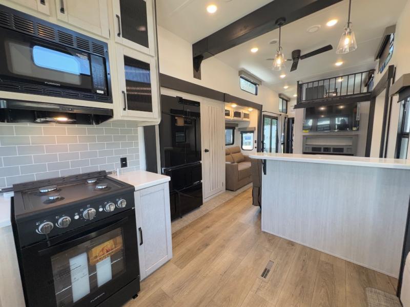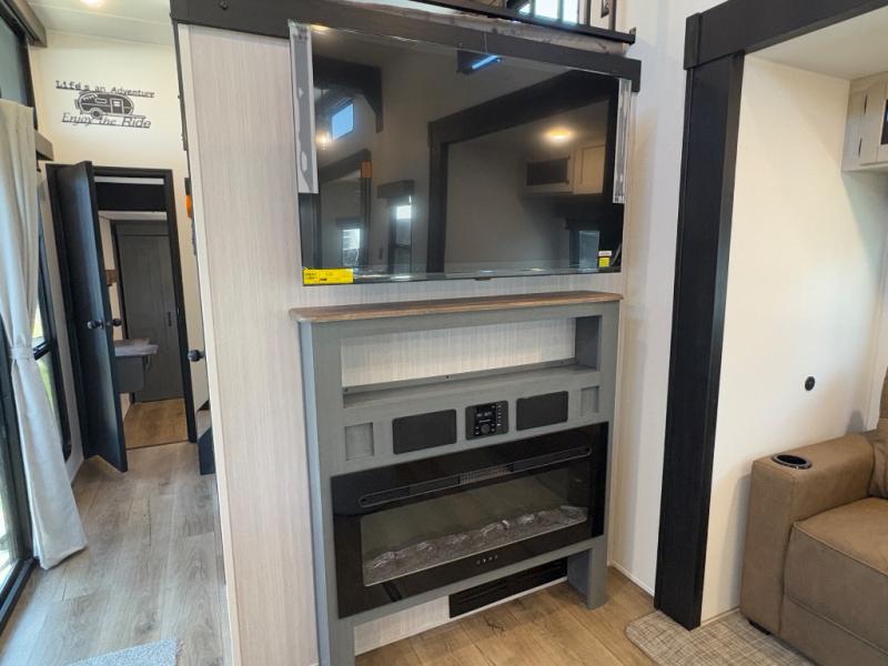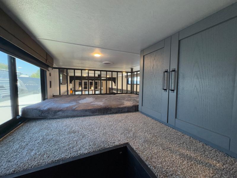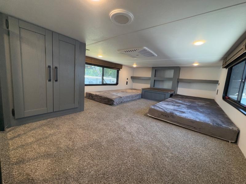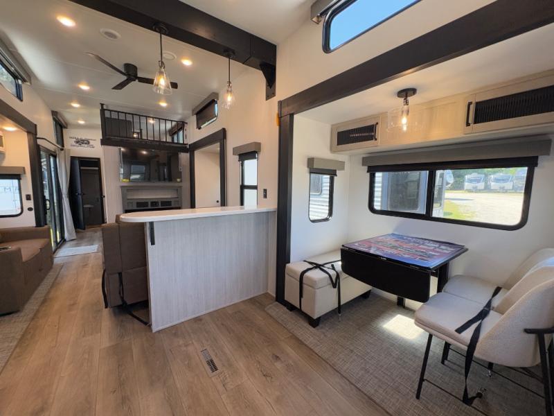 This is the perfect destination trailer for a larger group since it can sleep up to nine campers each night. The little ones will love the double loft areas with three bunk mats and storage space for their things, while you take the rear private bedroom. There is a king bed slide out here, along with a wardrobe/closet for your clothes, plus a second closet with the option to add washer and dryer prep. Everyone can meet in the middle living room to relax on the dual sofas or recliners across from the fireplace and entertainment center. Head to the front of the unit where you'll find the kitchen that includes ample counter space to prep meals, a residential style refrigerator and pantry for food storage, and a free-standing table to dine at. There is also a breakfast nook that overlooks the living area so you can visit with the cook and watch a movie at the same time!