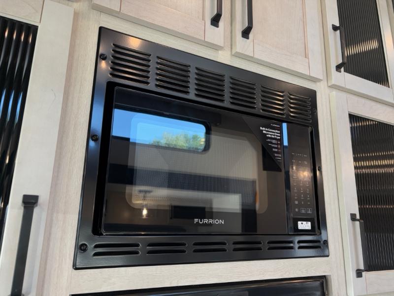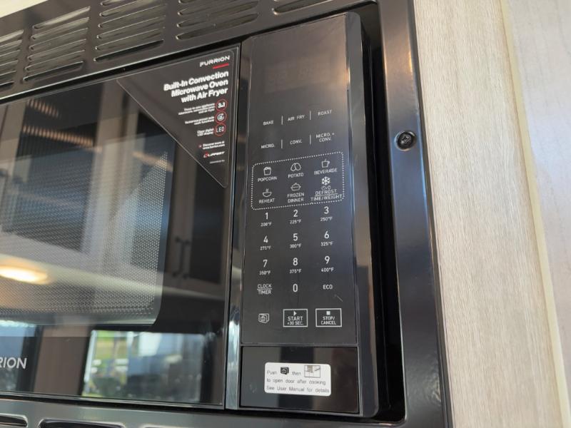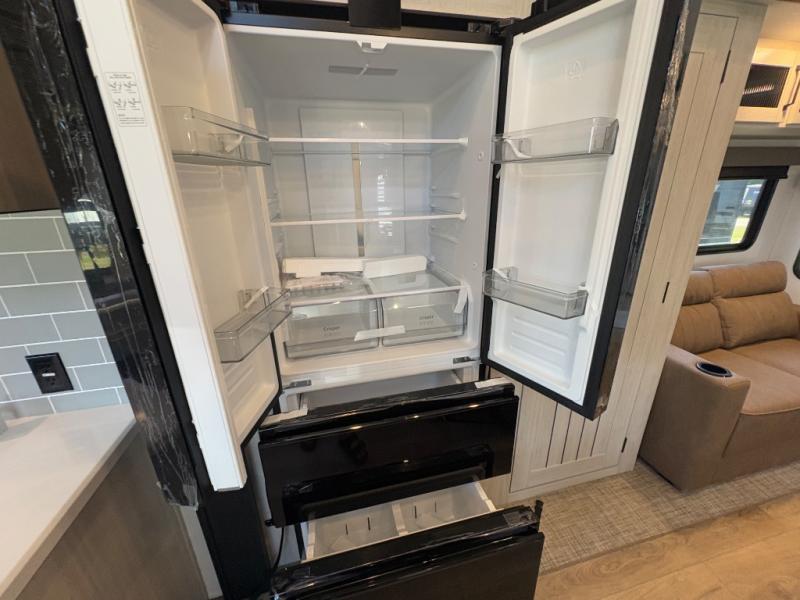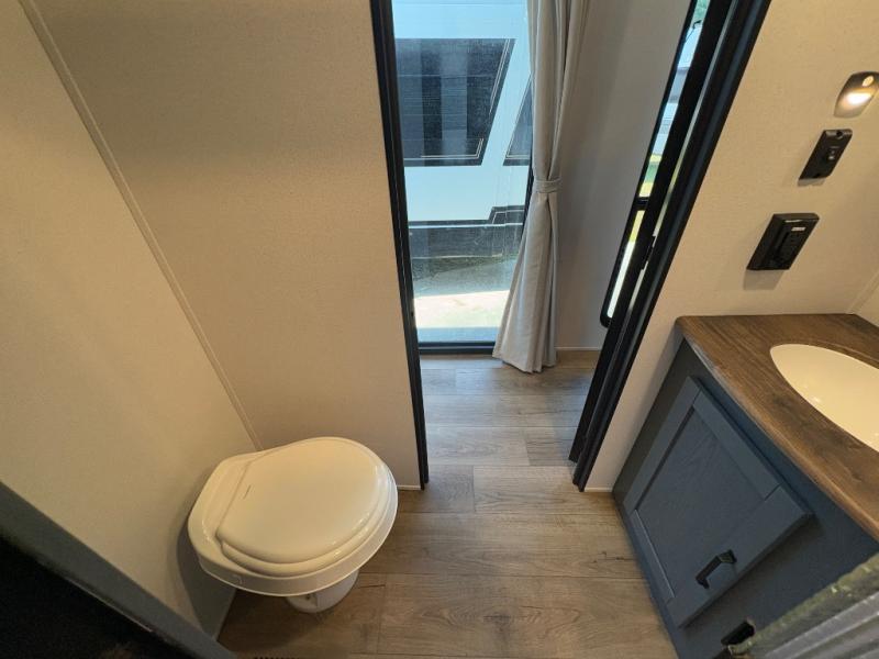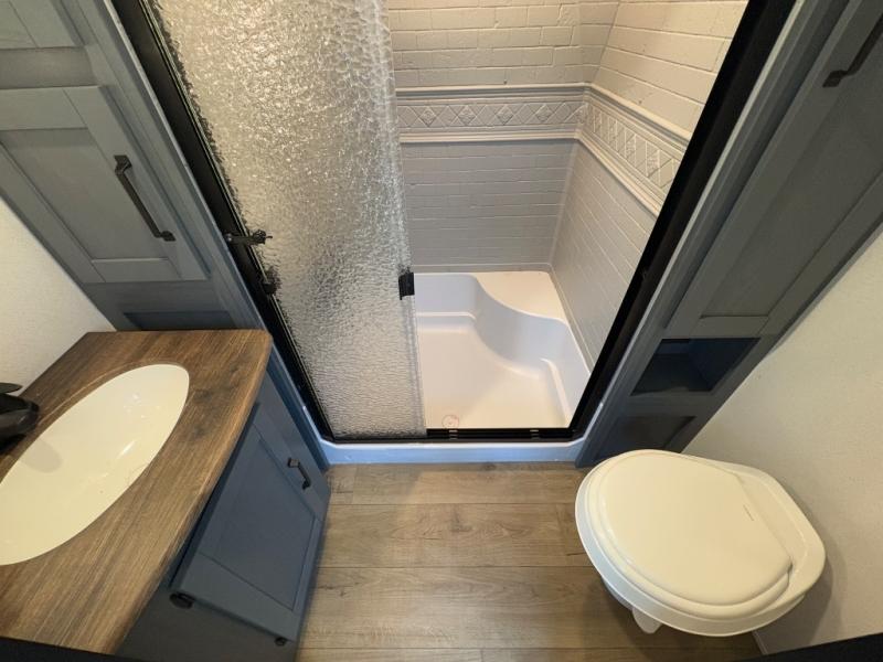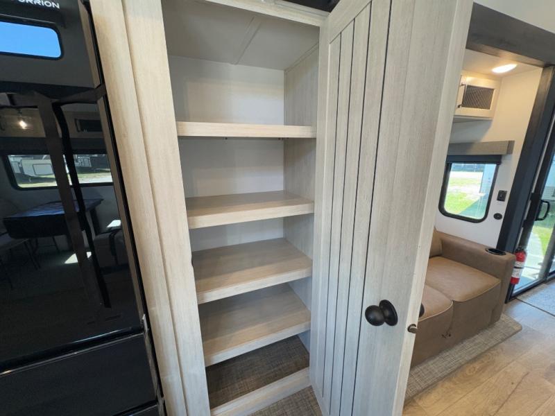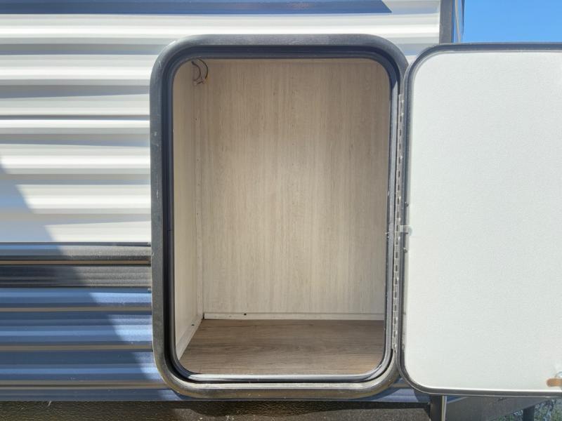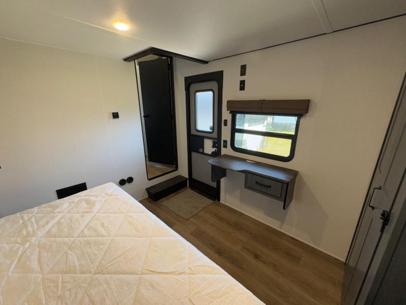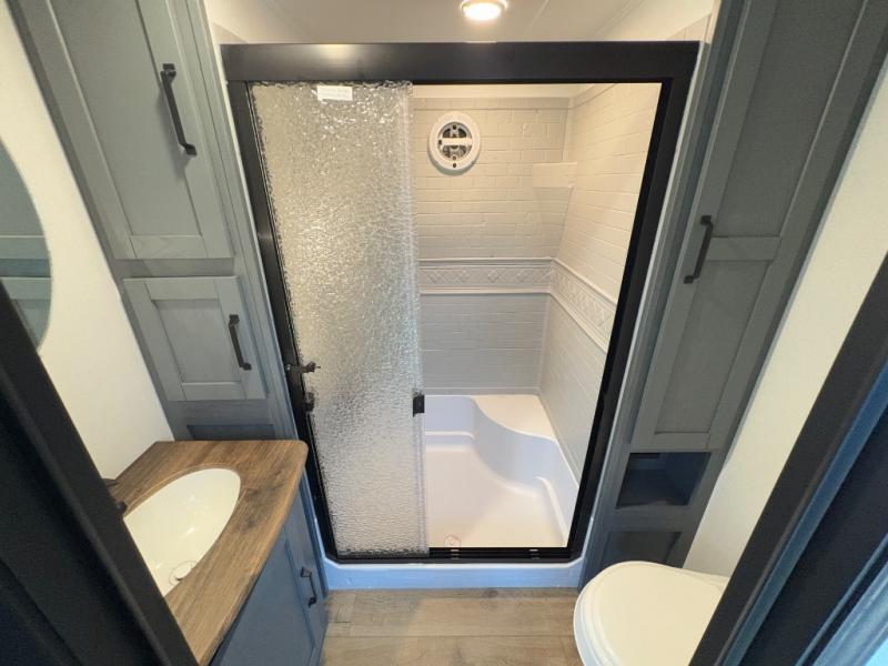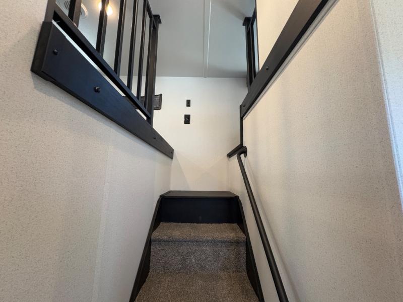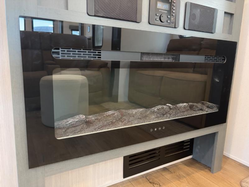 This is the perfect destination trailer for a larger group since it can sleep up to nine campers each night. The little ones will love the double loft areas with three bunk mats and storage space for their things, while you take the rear private bedroom. There is a king bed slide out here, along with a wardrobe/closet for your clothes, plus a second closet with the option to add washer and dryer prep. Everyone can meet in the middle living room to relax on the dual sofas or recliners across from the fireplace and entertainment center. Head to the front of the unit where you'll find the kitchen that includes ample counter space to prep meals, a residential style refrigerator and pantry for food storage, and a free-standing table to dine at. There is also a breakfast nook that overlooks the living area so you can visit with the cook and watch a movie at the same time!