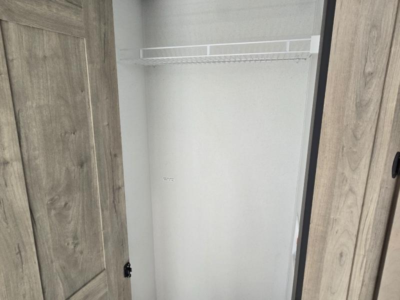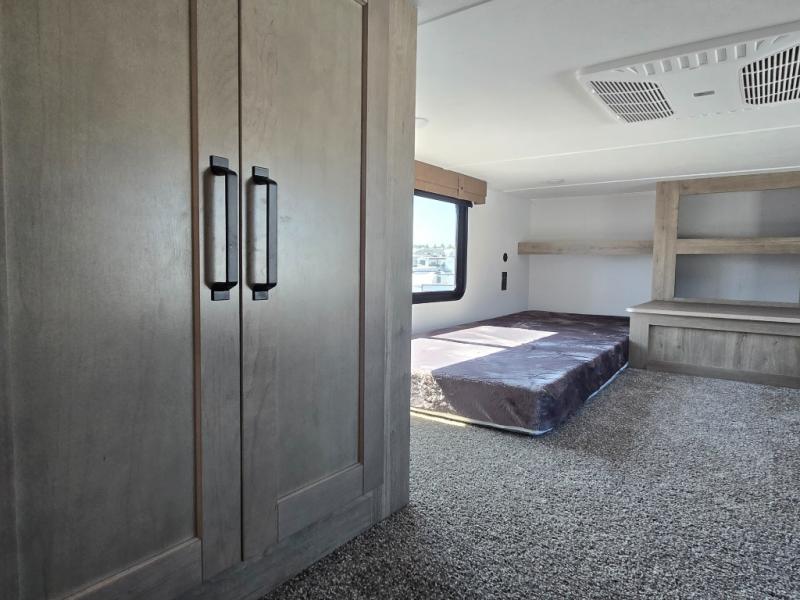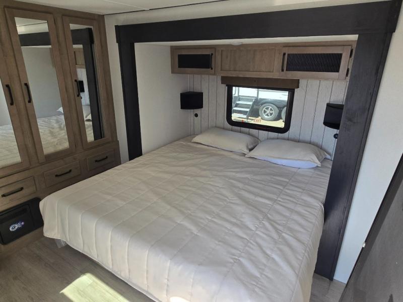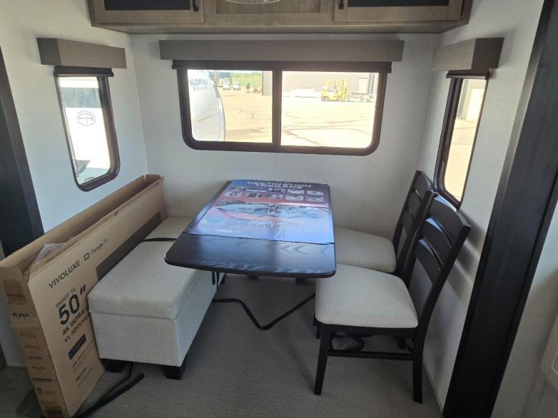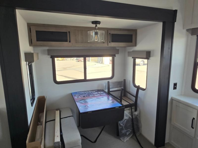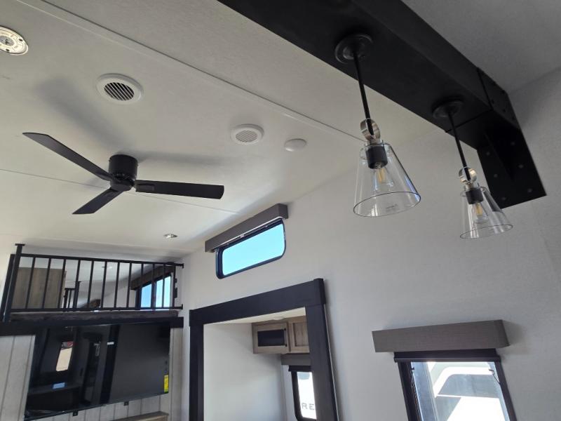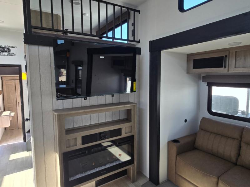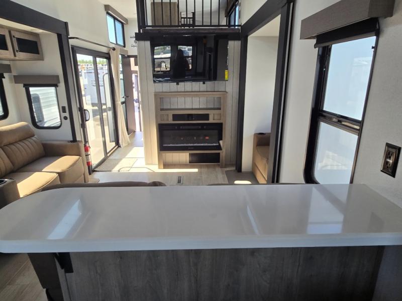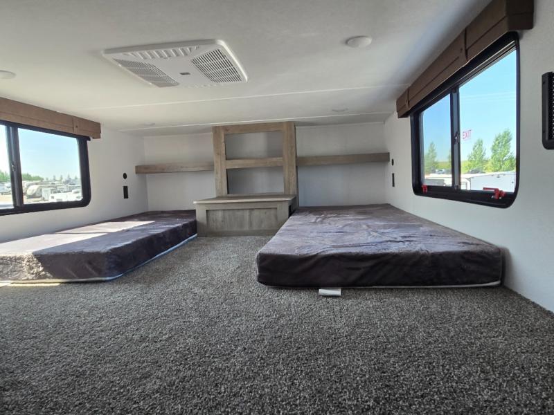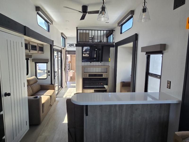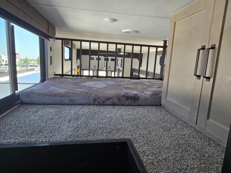 This is the perfect destination trailer for a larger group since it can sleep up to nine campers each night. The little ones will love the double loft areas with three bunk mats and storage space for their things, while you take the rear private bedroom. There is a king bed slide out here, along with a wardrobe/closet for your clothes, plus a second closet with the option to add washer and dryer prep. Everyone can meet in the middle living room to relax on the dual sofas or recliners across from the fireplace and entertainment center. Head to the front of the unit where you'll find the kitchen that includes ample counter space to prep meals, a residential style refrigerator and pantry for food storage, and a free-standing table to dine at. There is also a breakfast nook that overlooks the living area so you can visit with the cook and watch a movie at the same time!