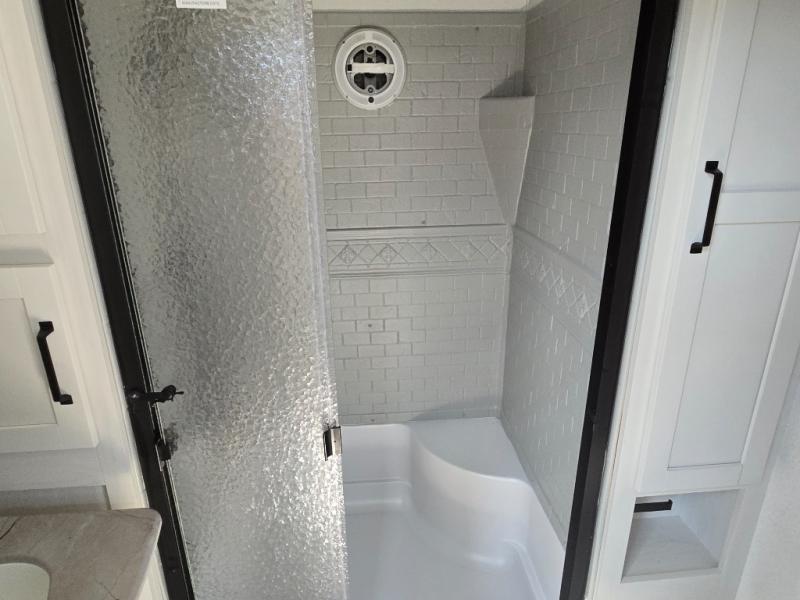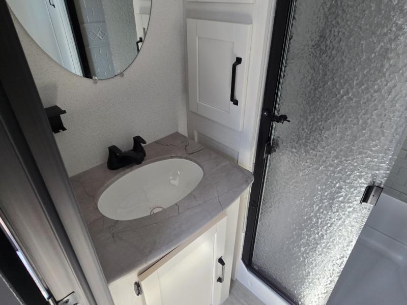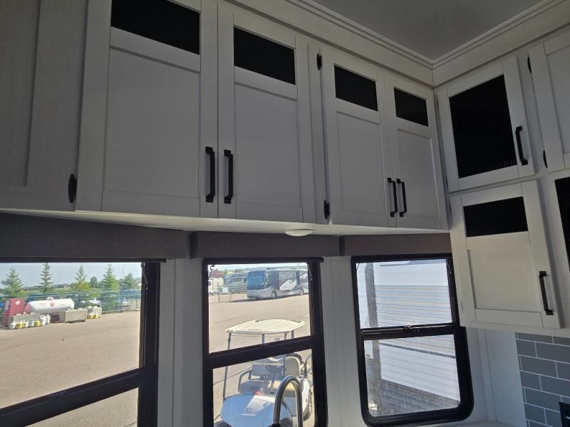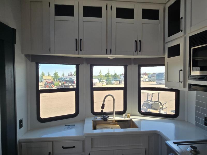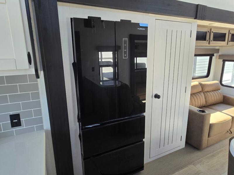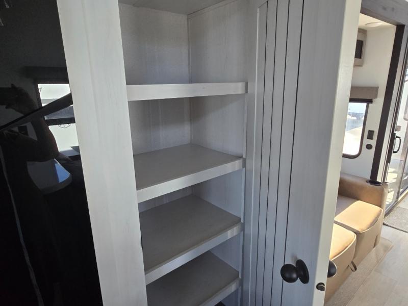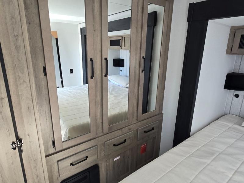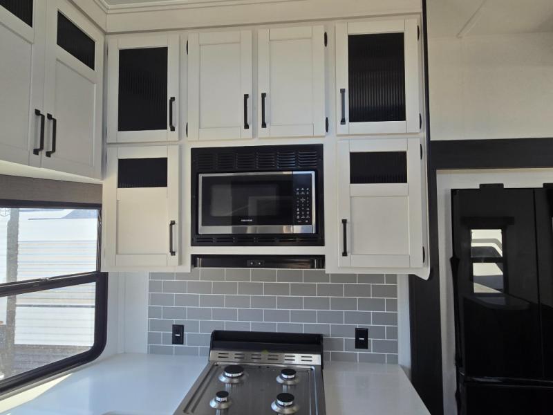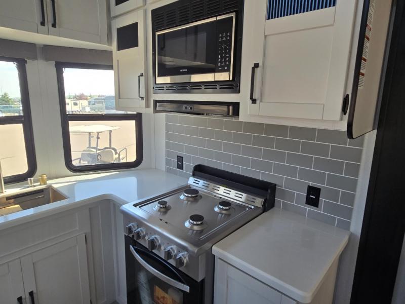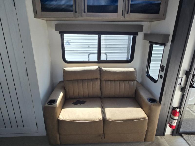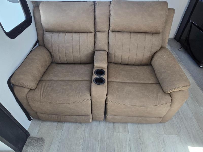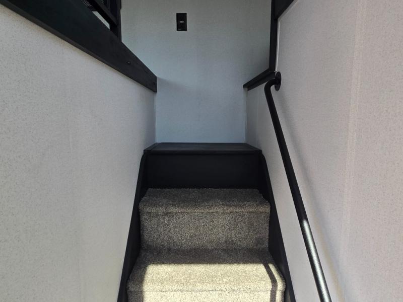This is the perfect destination trailer for a larger group since it can sleep up to nine campers each night. The little ones will love the double loft areas with three bunk mats and storage space for their things, while you take the rear private bedroom. There is a king bed slide out here, along with a wardrobe/closet for your clothes, plus a second closet with the option to add washer and dryer prep. Everyone can meet in the middle living room to relax on the dual sofas or recliners across from the fireplace and entertainment center. Head to the front of the unit where you'll find the kitchen that includes ample counter space to prep meals, a residential style refrigerator and pantry for food storage, and a free-standing table to dine at. There is also a breakfast nook that overlooks the living area so you can visit with the cook and watch a movie at the same time!