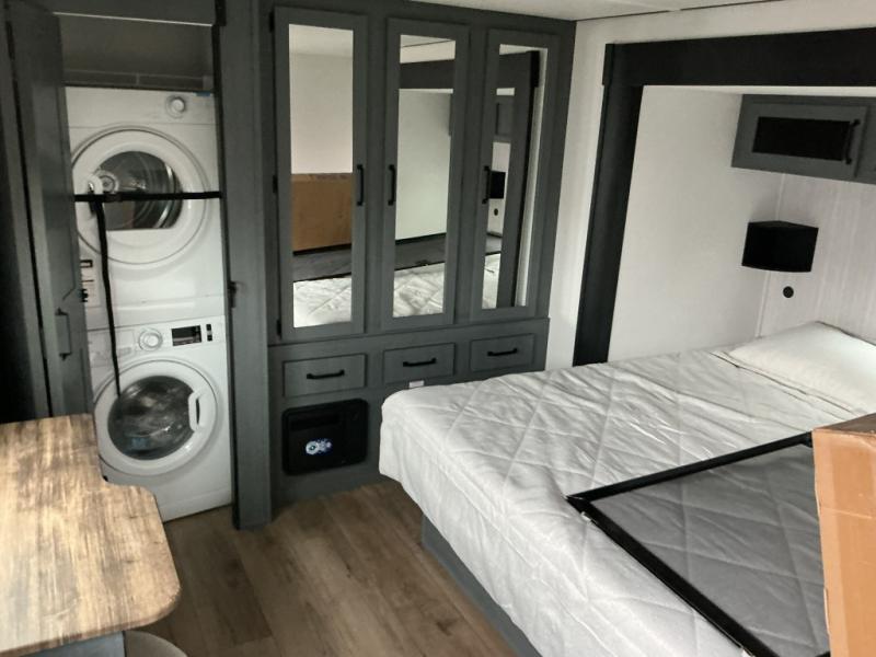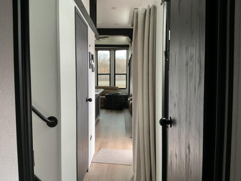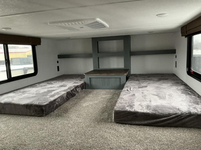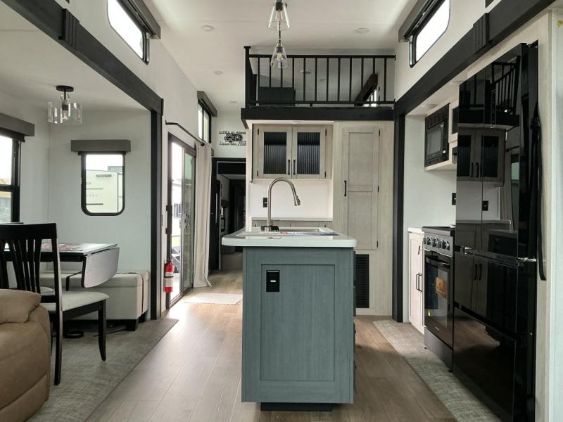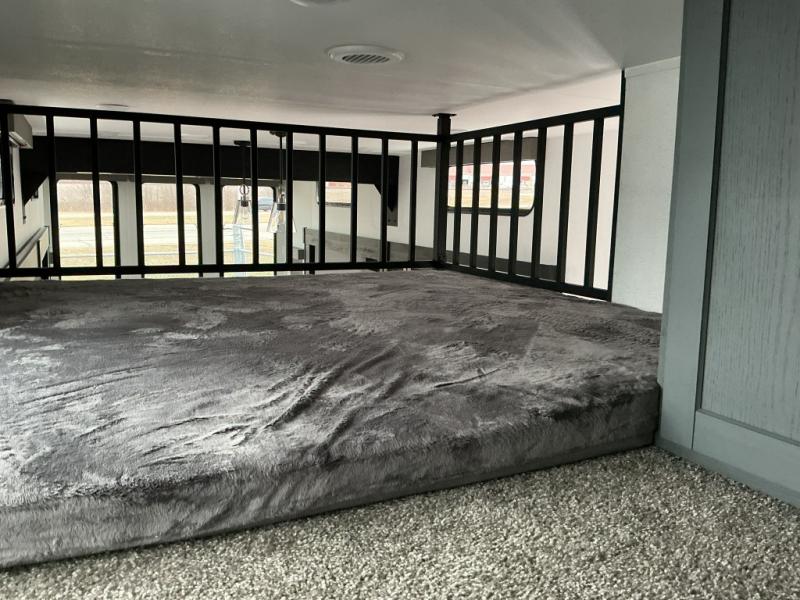 This is the perfect destination trailer for a larger group since it can sleep up to nine campers each night. The little ones will love the double loft areas with three bunk mats and storage space for their things, while you take the rear private bedroom. There is a king bed slide out here, along with a wardrobe/closet for your clothes, plus a second closet with washer and dryer prep. Everyone can meet in the middle living room to relax on the dual opposing sofas or theater seating across from the fireplace and entertainment center. Head to the front of the unit where you'll find the kitchen that includes ample counter space to prep meals, a residential style refrigerator and pantry for food storage, and a free-standing table to dine at. There is also a breakfast nook that overlooks the living area so you can visit with the cook and watch a movie at the same time!