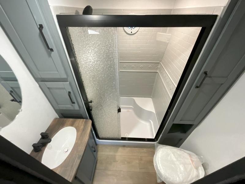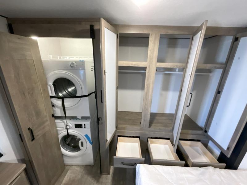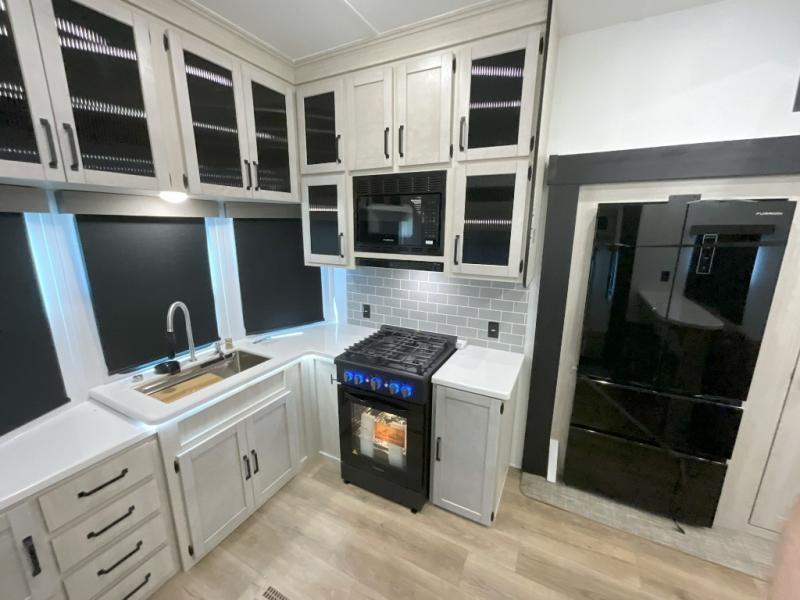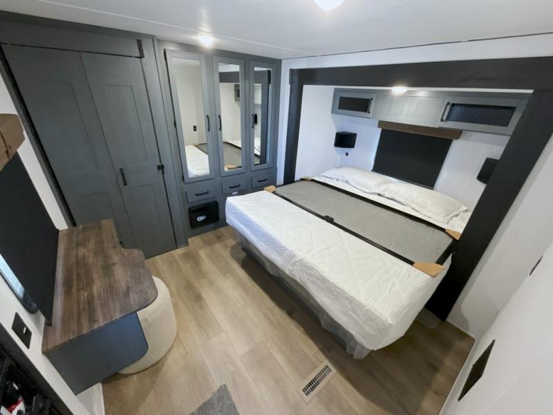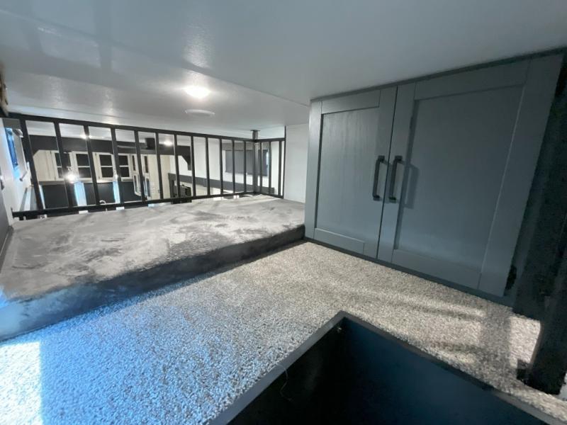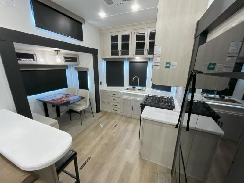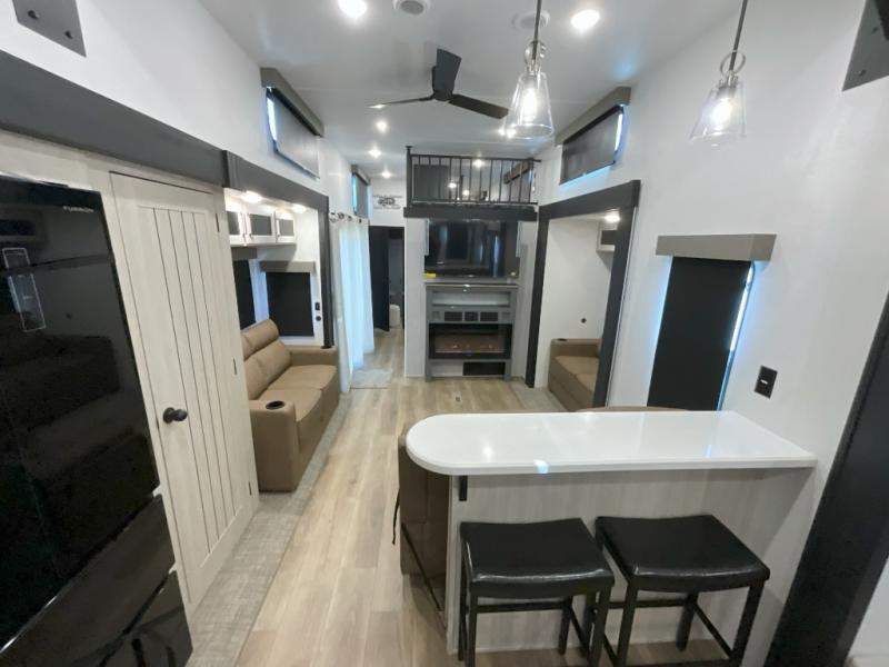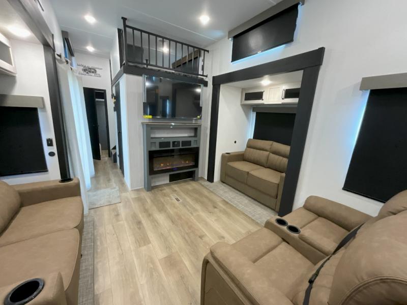 This is the perfect destination trailer for a larger group since it can sleep up to nine campers each night. The little ones will love the double loft areas with three bunk mats and storage space for their things, while you take the rear private bedroom. There is a king bed slide out here, along with a wardrobe/closet for your clothes, plus a second closet with the option to add washer and dryer prep. Everyone can meet in the middle living room to relax on the dual sofas or recliners across from the fireplace and entertainment center. Head to the front of the unit where you'll find the kitchen that includes ample counter space to prep meals, a residential style refrigerator and pantry for food storage, and a free-standing table to dine at. There is also a breakfast nook that overlooks the living area so you can visit with the cook and watch a movie at the same time!