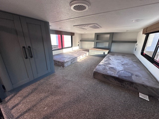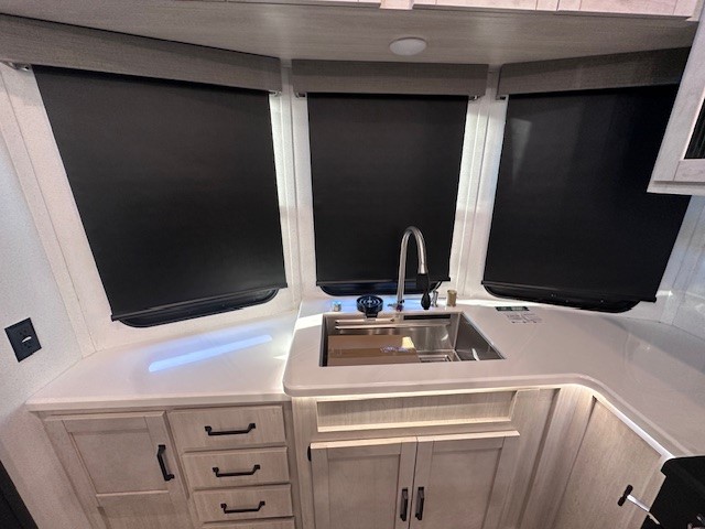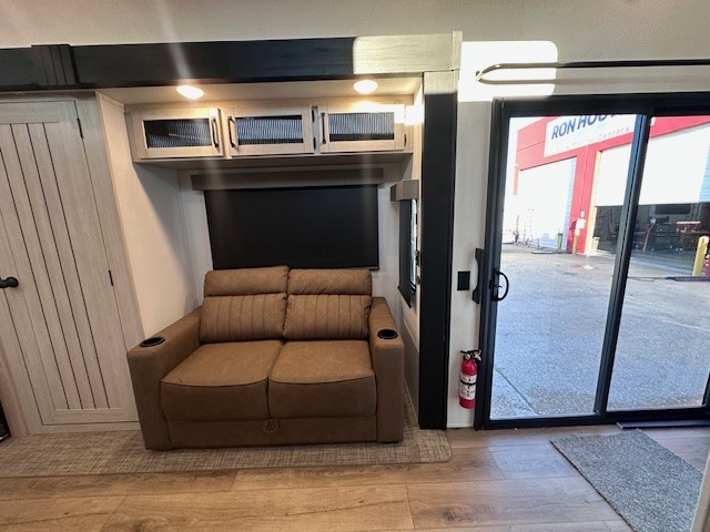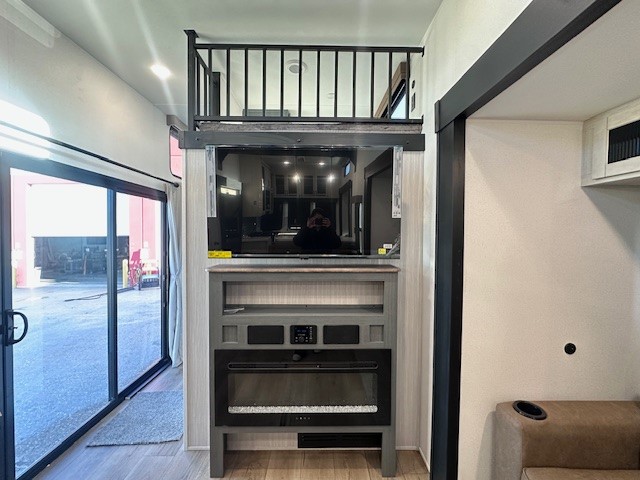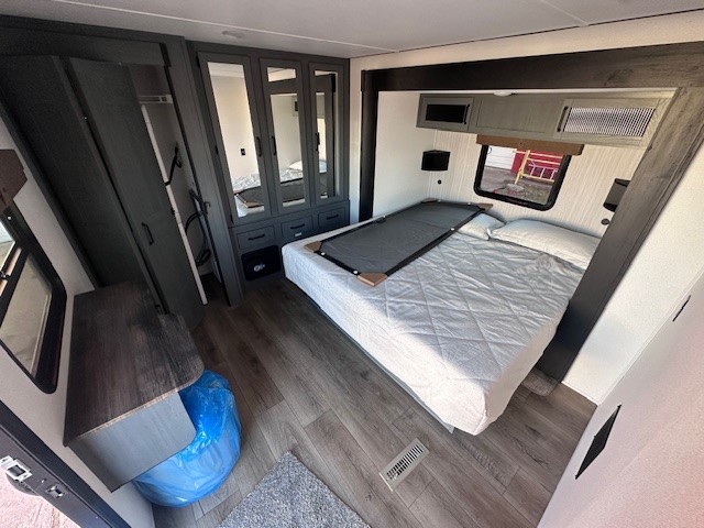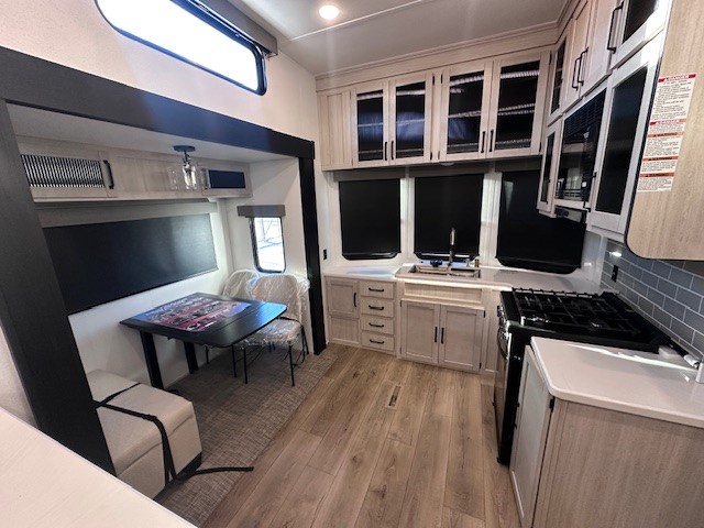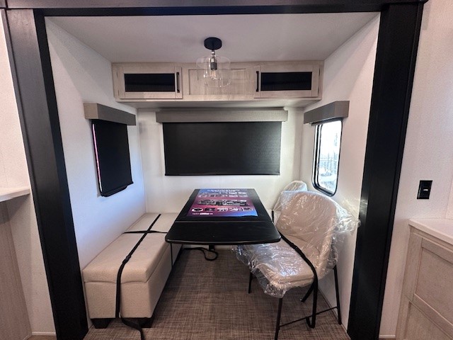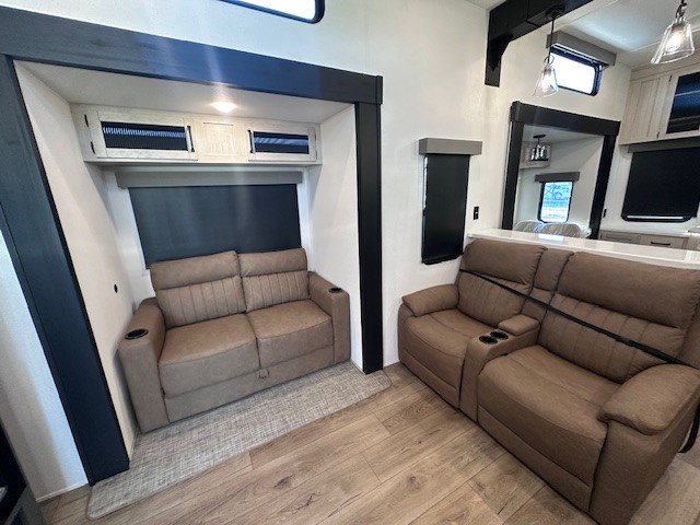 This is the perfect destination trailer for a larger group since it can sleep up to nine campers each night. The little ones will love the double loft areas with three bunk mats and storage space for their things, while you take the rear private bedroom. There is a king bed slide out here, along with a wardrobe/closet for your clothes, plus a second closet with washer and dryer prep. Everyone can meet in the middle living room to relax on the dual opposing sofas or theater seating across from the fireplace and entertainment center. Head to the front of the unit where you'll find the kitchen that includes ample counter space to prep meals, a residential style refrigerator and pantry for food storage, and a free-standing table to dine at. There is also a breakfast nook that overlooks the living area so you can visit with the cook and watch a movie at the same time!
