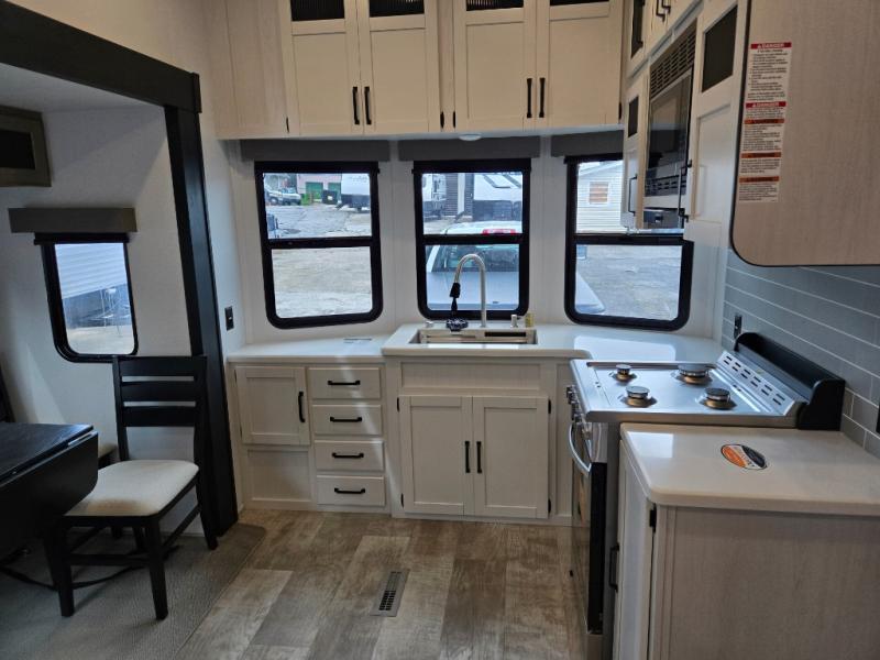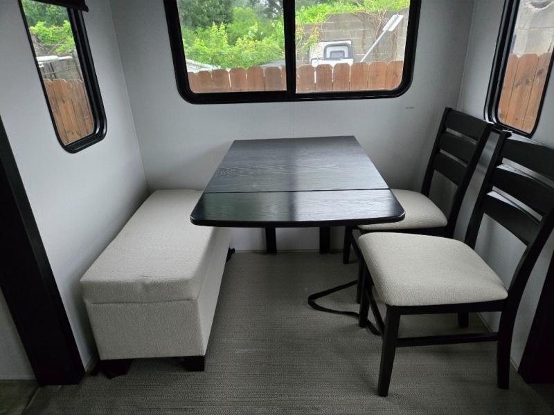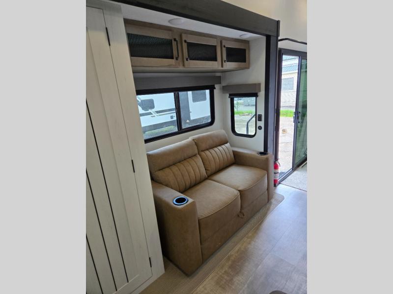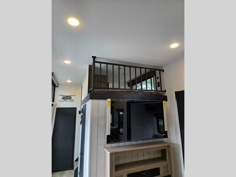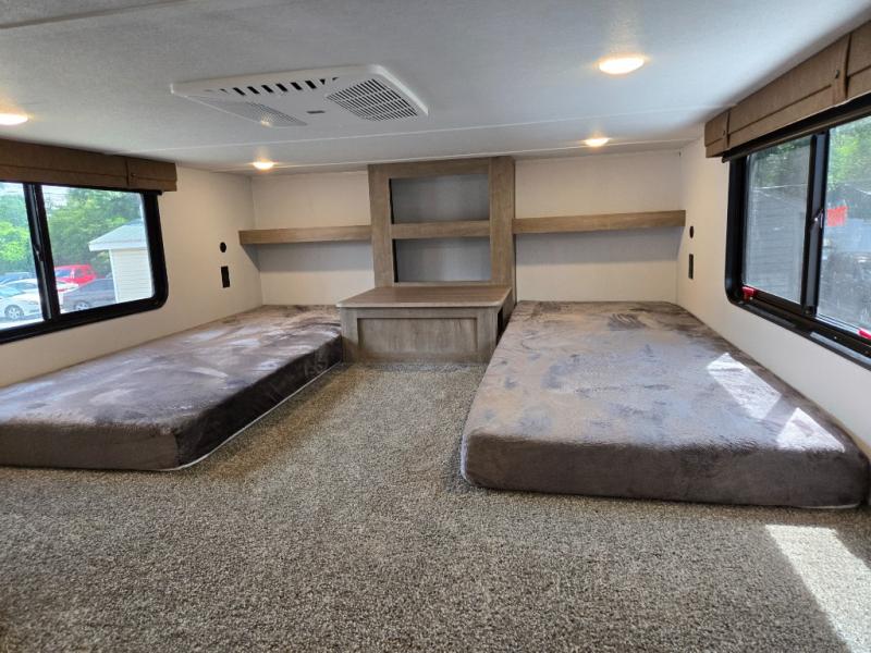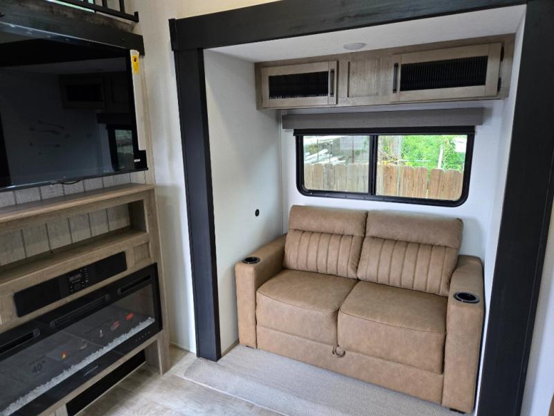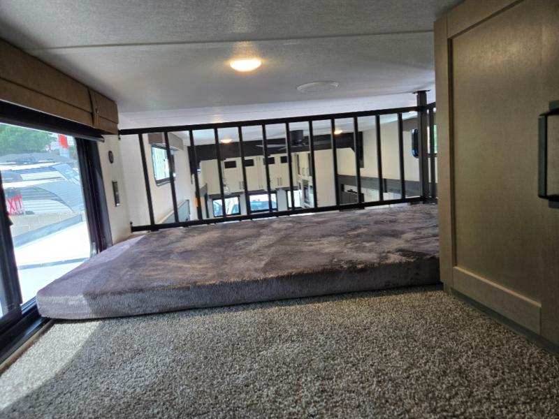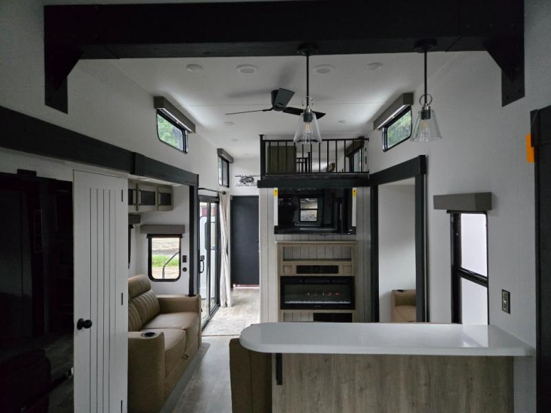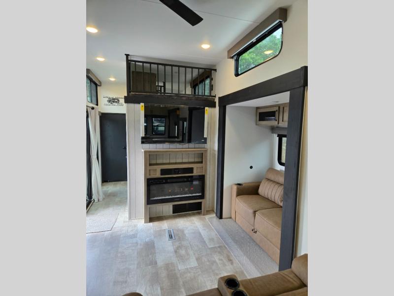 This is the perfect destination trailer for a larger group since it can sleep up to nine campers each night. The little ones will love the double loft areas with three bunk mats and storage space for their things, while you take the rear private bedroom. There is a king bed slide out here, along with a wardrobe/closet for your clothes, plus a second closet with the option to add washer and dryer prep. Everyone can meet in the middle living room to relax on the dual sofas or recliners across from the fireplace and entertainment center. Head to the front of the unit where you'll find the kitchen that includes ample counter space to prep meals, a residential style refrigerator and pantry for food storage, and a free-standing table to dine at. There is also a breakfast nook that overlooks the living area so you can visit with the cook and watch a movie at the same time!