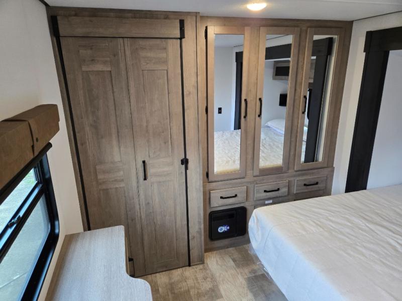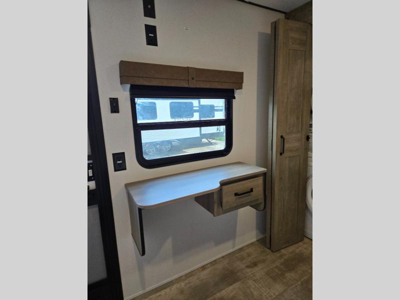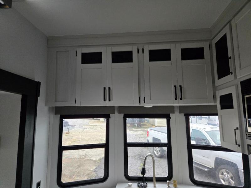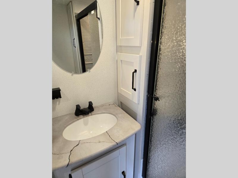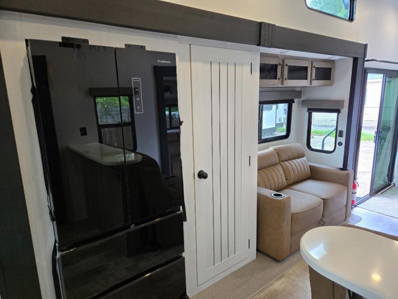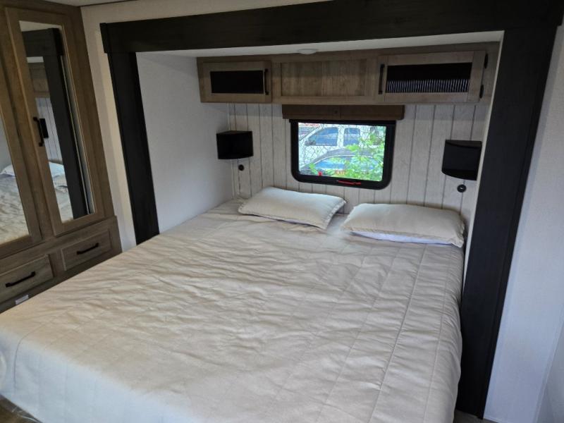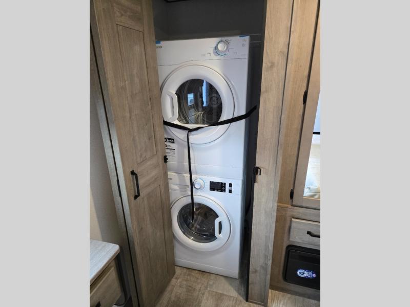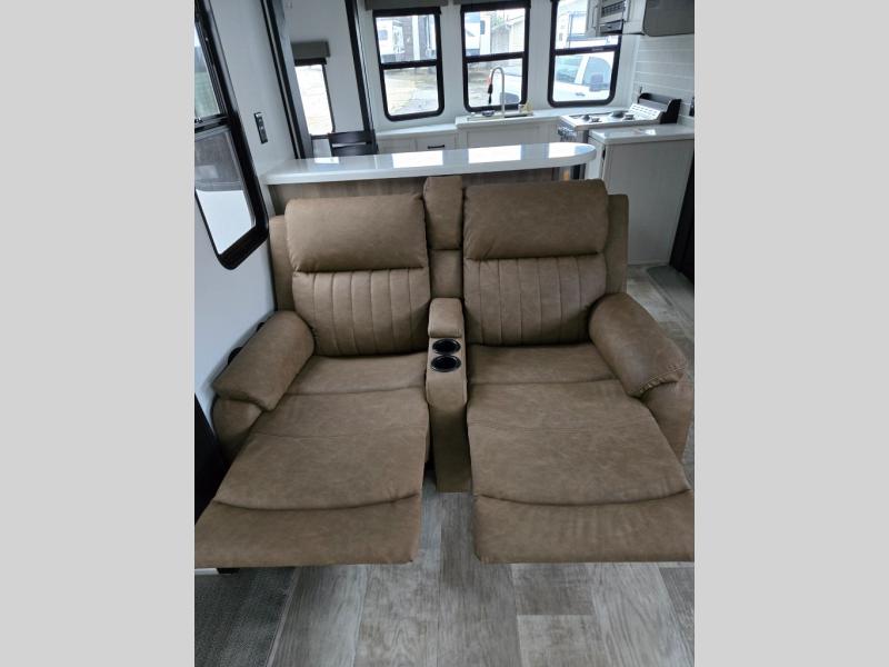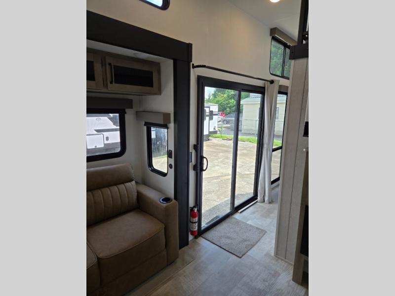 This is the perfect destination trailer for a larger group since it can sleep up to nine campers each night. The little ones will love the double loft areas with three bunk mats and storage space for their things, while you take the rear private bedroom. There is a king bed slide out here, along with a wardrobe/closet for your clothes, plus a second closet with the option to add washer and dryer prep. Everyone can meet in the middle living room to relax on the dual sofas or recliners across from the fireplace and entertainment center. Head to the front of the unit where you'll find the kitchen that includes ample counter space to prep meals, a residential style refrigerator and pantry for food storage, and a free-standing table to dine at. There is also a breakfast nook that overlooks the living area so you can visit with the cook and watch a movie at the same time!
