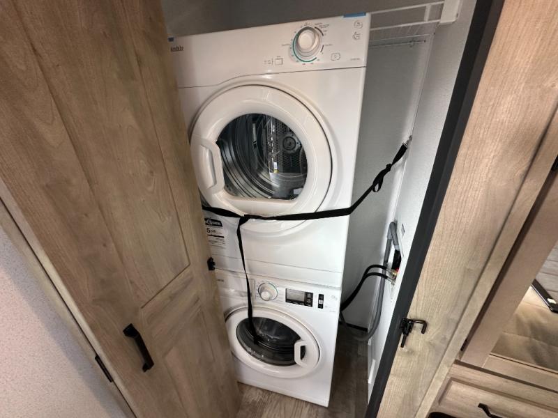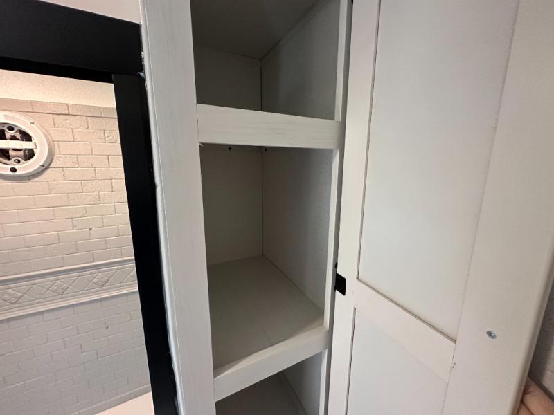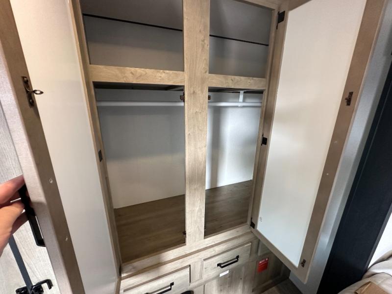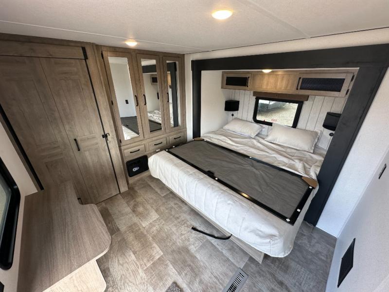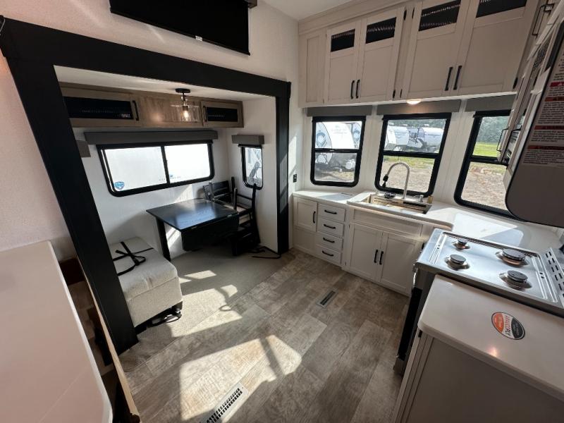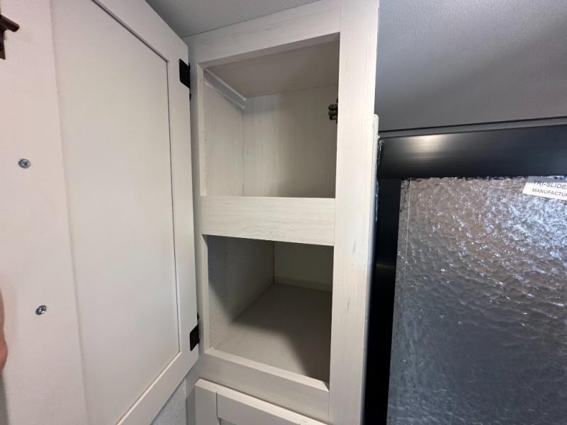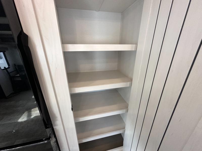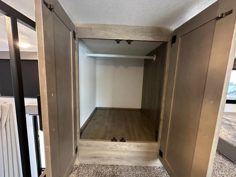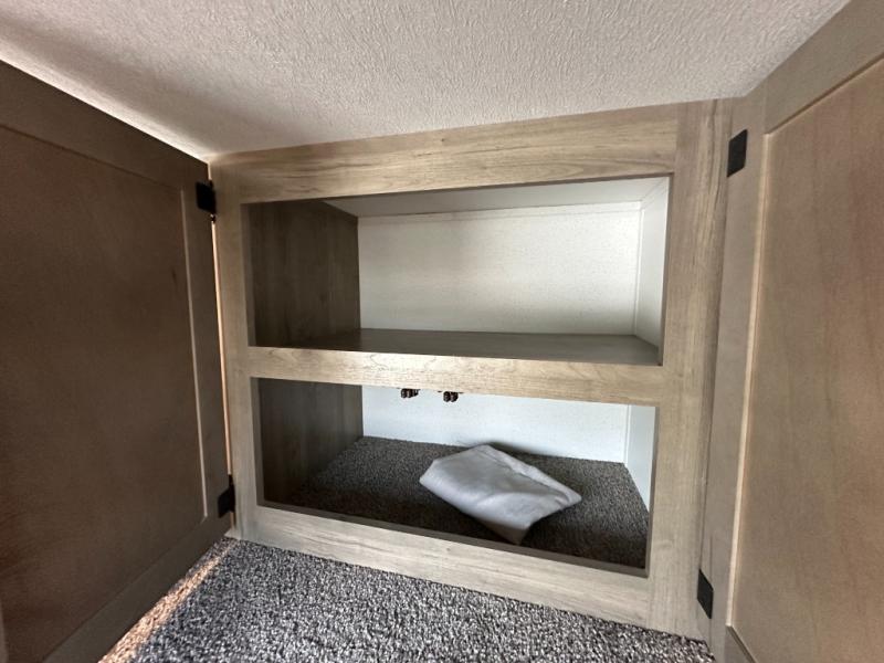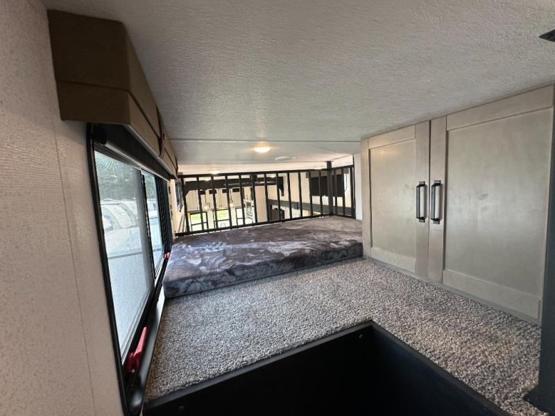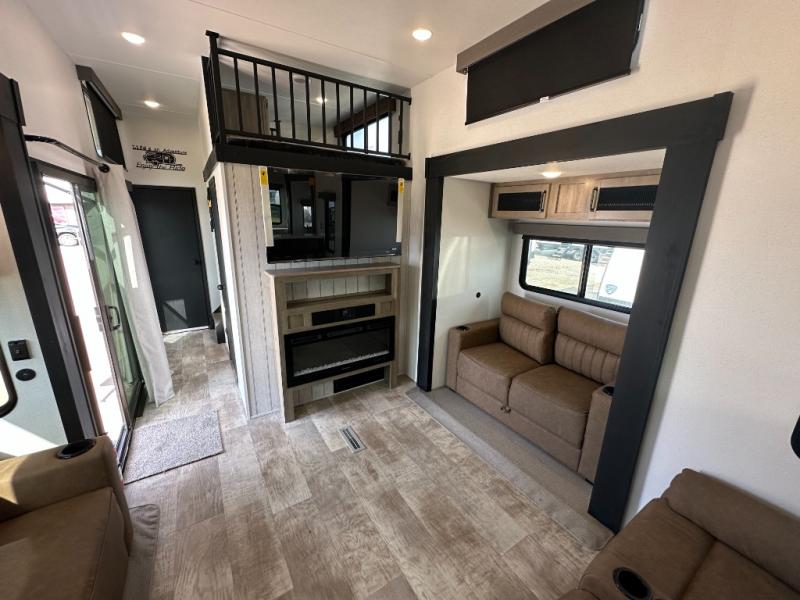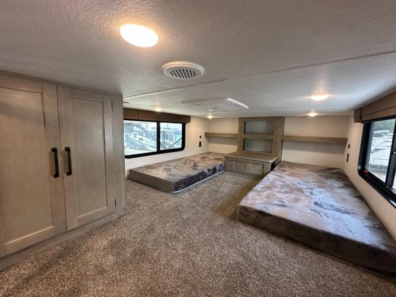 This is the perfect destination trailer for a larger group since it can sleep up to nine campers each night. The little ones will love the double loft areas with three bunk mats and storage space for their things, while you take the rear private bedroom. There is a king bed slide out here, along with a wardrobe/closet for your clothes, plus a second closet with the option to add washer and dryer prep. Everyone can meet in the middle living room to relax on the dual sofas or recliners across from the fireplace and entertainment center. Head to the front of the unit where you'll find the kitchen that includes ample counter space to prep meals, a residential style refrigerator and pantry for food storage, and a free-standing table to dine at. There is also a breakfast nook that overlooks the living area so you can visit with the cook and watch a movie at the same time!