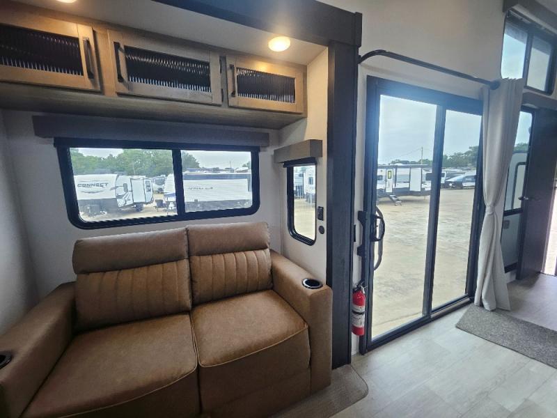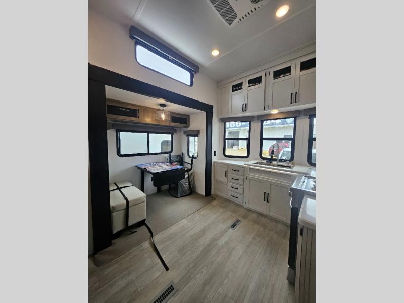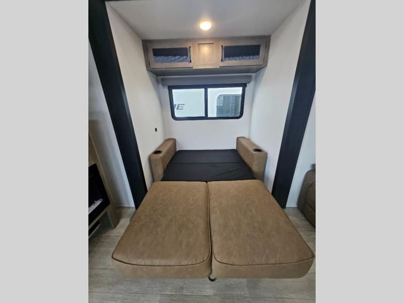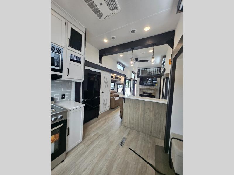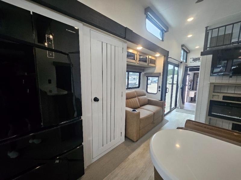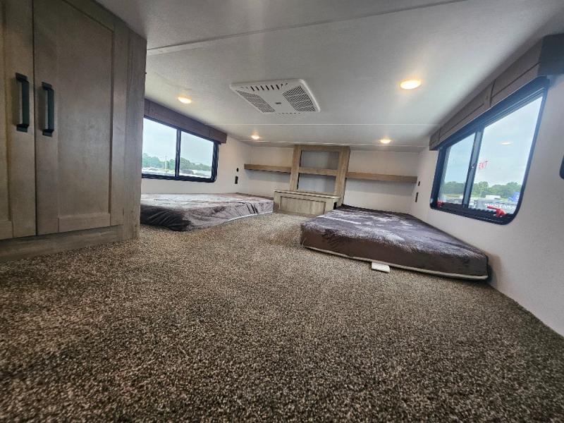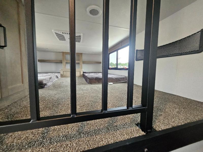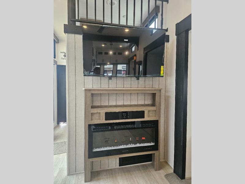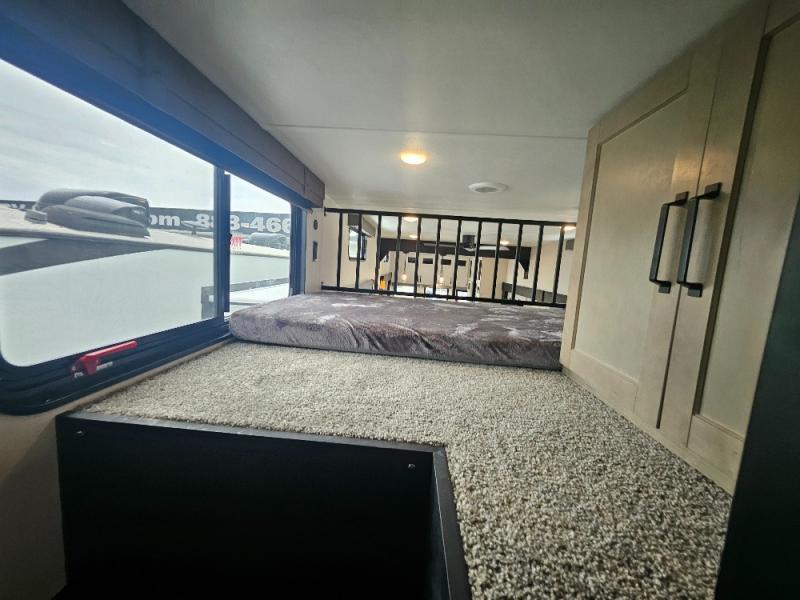 This is the perfect destination trailer for a larger group since it can sleep up to nine campers each night. The little ones will love the double loft areas with three bunk mats and storage space for their things, while you take the rear private bedroom. There is a king bed slide out here, along with a wardrobe/closet for your clothes, plus a second closet with the option to add washer and dryer prep. Everyone can meet in the middle living room to relax on the dual sofas or recliners across from the fireplace and entertainment center. Head to the front of the unit where you'll find the kitchen that includes ample counter space to prep meals, a residential style refrigerator and pantry for food storage, and a free-standing table to dine at. There is also a breakfast nook that overlooks the living area so you can visit with the cook and watch a movie at the same time!