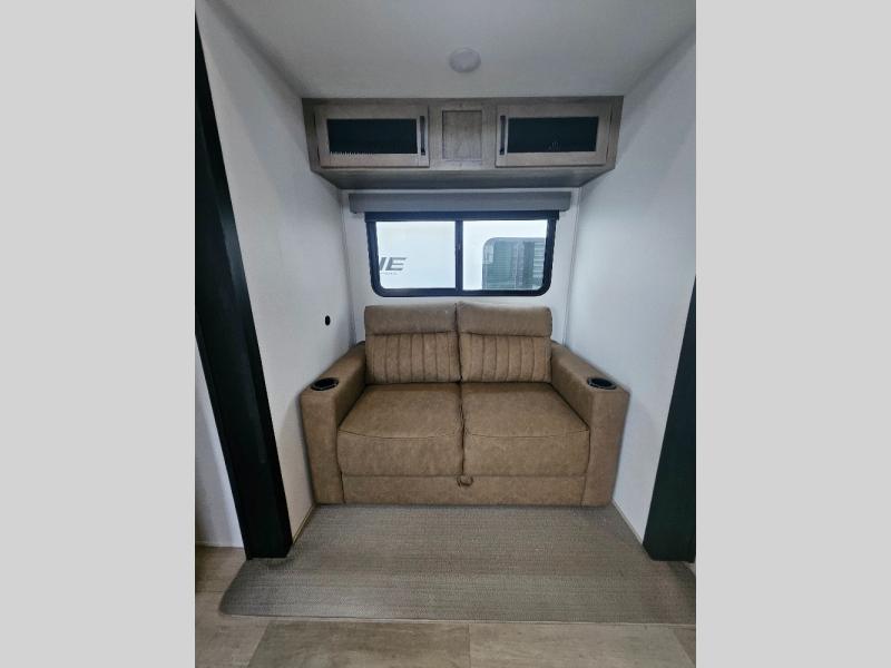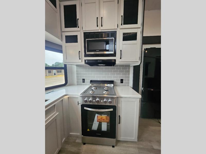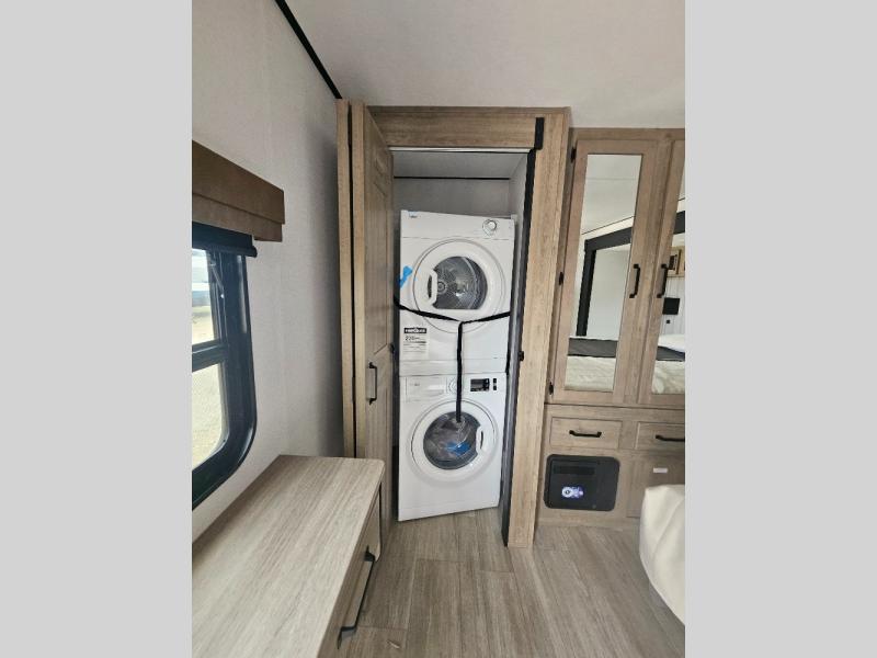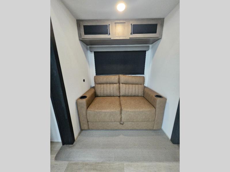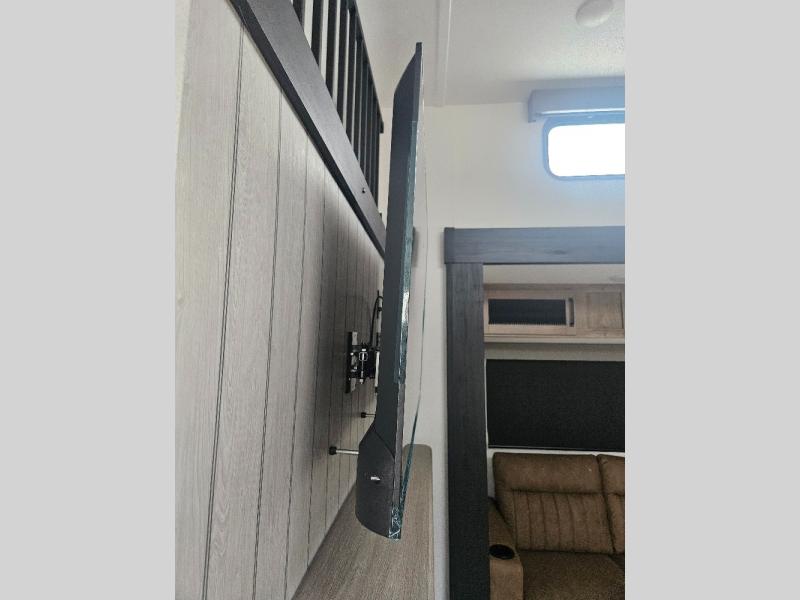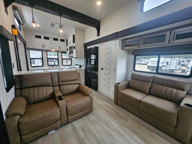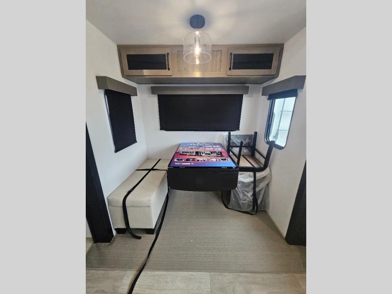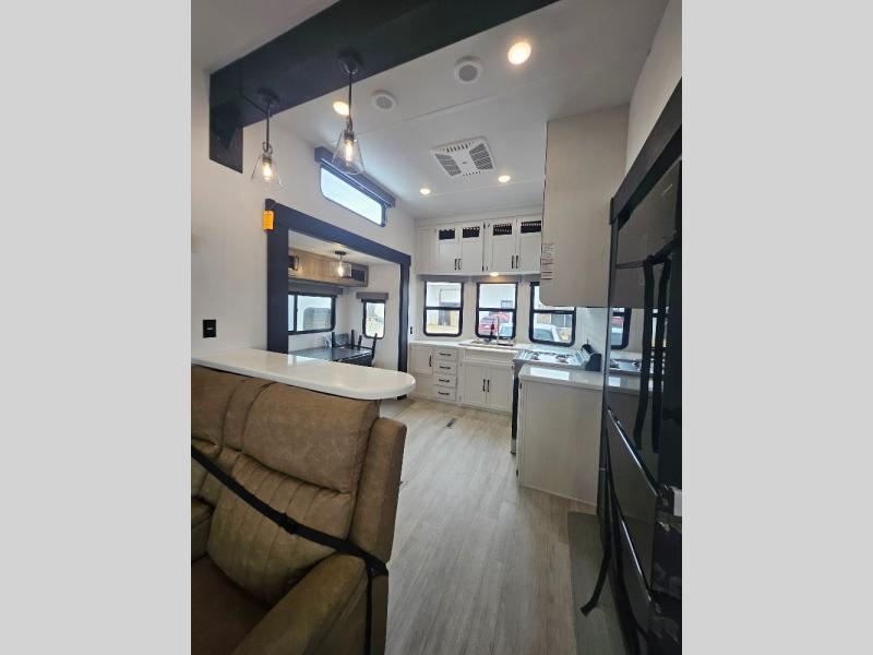 This is the perfect destination trailer for a larger group since it can sleep up to nine campers each night. The little ones will love the double loft areas with three bunk mats and storage space for their things, while you take the rear private bedroom. There is a king bed slide out here, along with a wardrobe/closet for your clothes, plus a second closet with the option to add washer and dryer prep. Everyone can meet in the middle living room to relax on the dual sofas or recliners across from the fireplace and entertainment center. Head to the front of the unit where you'll find the kitchen that includes ample counter space to prep meals, a residential style refrigerator and pantry for food storage, and a free-standing table to dine at. There is also a breakfast nook that overlooks the living area so you can visit with the cook and watch a movie at the same time!