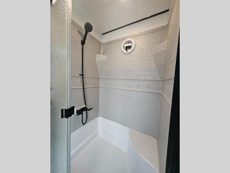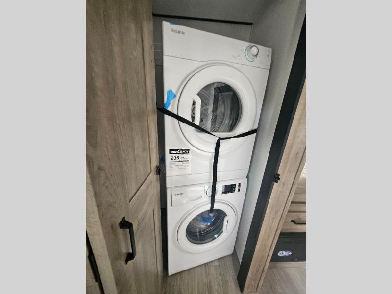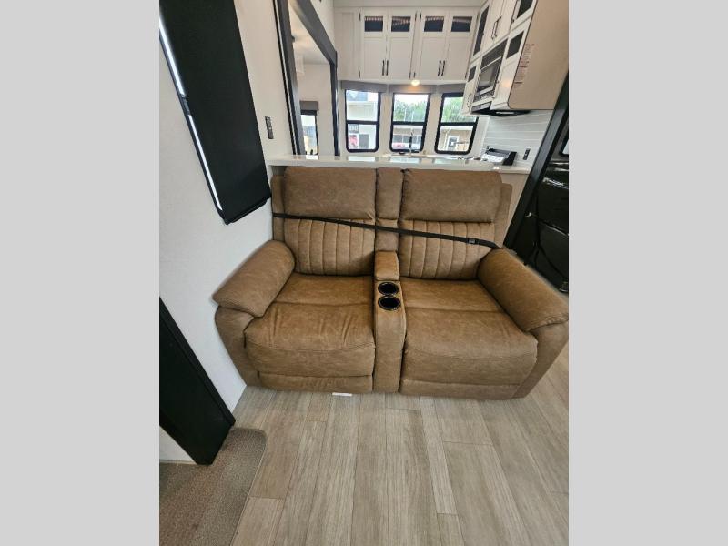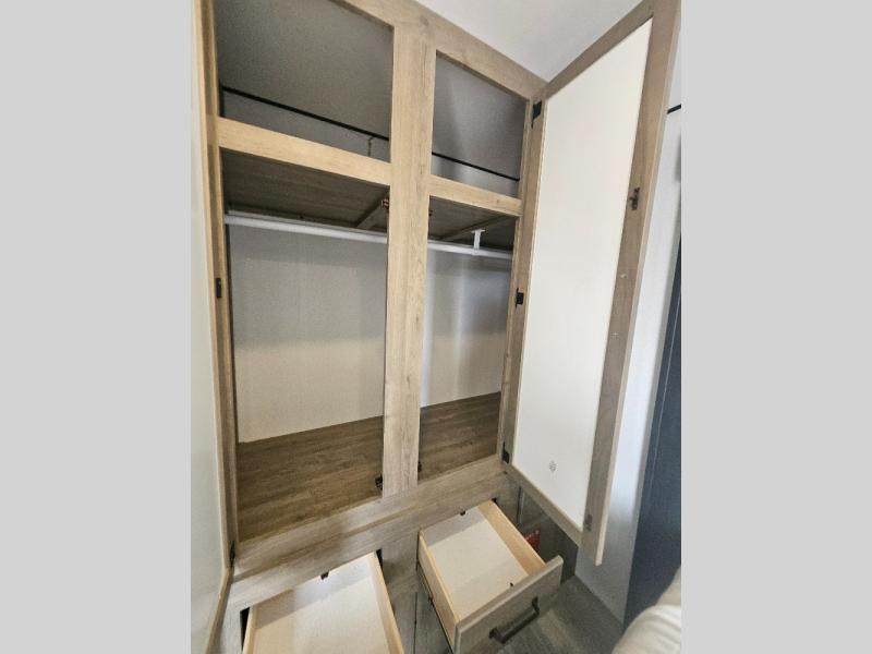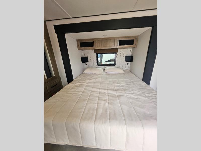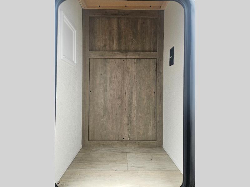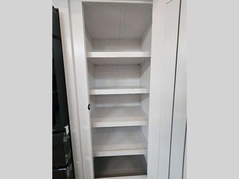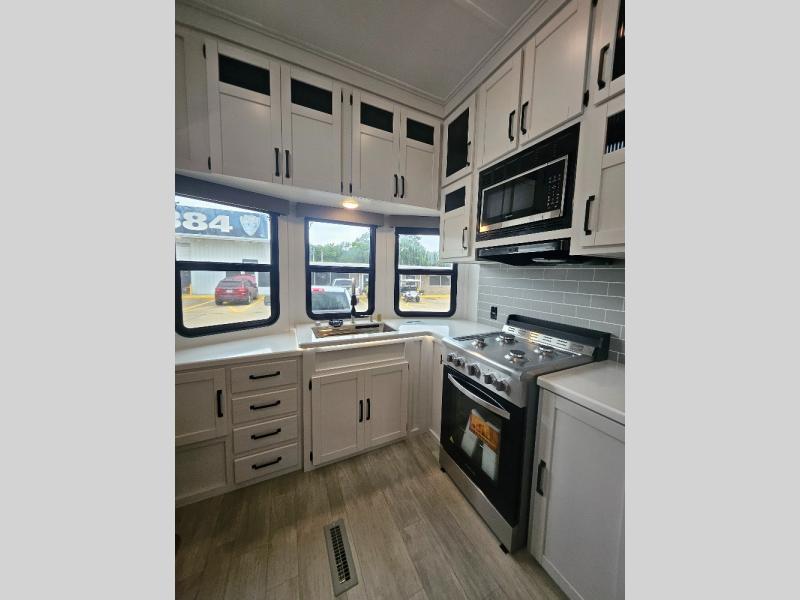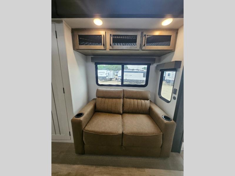 This is the perfect destination trailer for a larger group since it can sleep up to nine campers each night. The little ones will love the double loft areas with three bunk mats and storage space for their things, while you take the rear private bedroom. There is a king bed slide out here, along with a wardrobe/closet for your clothes, plus a second closet with the option to add washer and dryer prep. Everyone can meet in the middle living room to relax on the dual sofas or recliners across from the fireplace and entertainment center. Head to the front of the unit where you'll find the kitchen that includes ample counter space to prep meals, a residential style refrigerator and pantry for food storage, and a free-standing table to dine at. There is also a breakfast nook that overlooks the living area so you can visit with the cook and watch a movie at the same time!