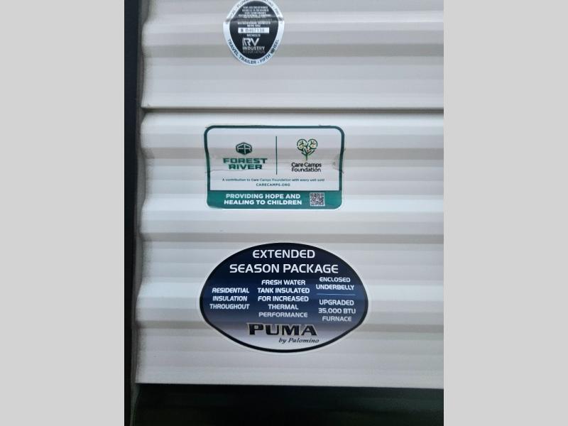 Each Puma Destination trailer by Palomino is designed to give you unforgettable getaways to the destination of your choice! The required Value Shopper Loft Package includes Congoleum designer linoleum, night roller shades, LED lighting, and a 24" stainless steel oven with a four burner stove so you can make meals just like you would at home. The tankless water heater is another feature you won't want to camp without, and there is WiFi prep, solar prep, plus optional washer and dryer prep for the option to further customize your trailer. An outside shower is included with the required Loft Package, along with two exterior speakers, solid surface countertops, four stabilizer jacks, and more!