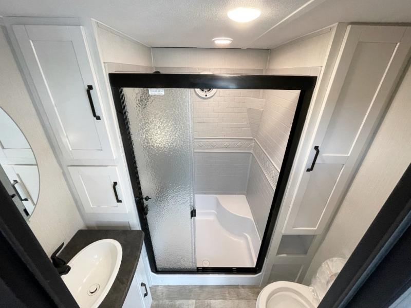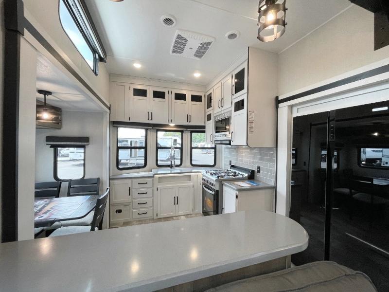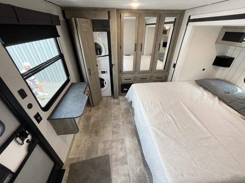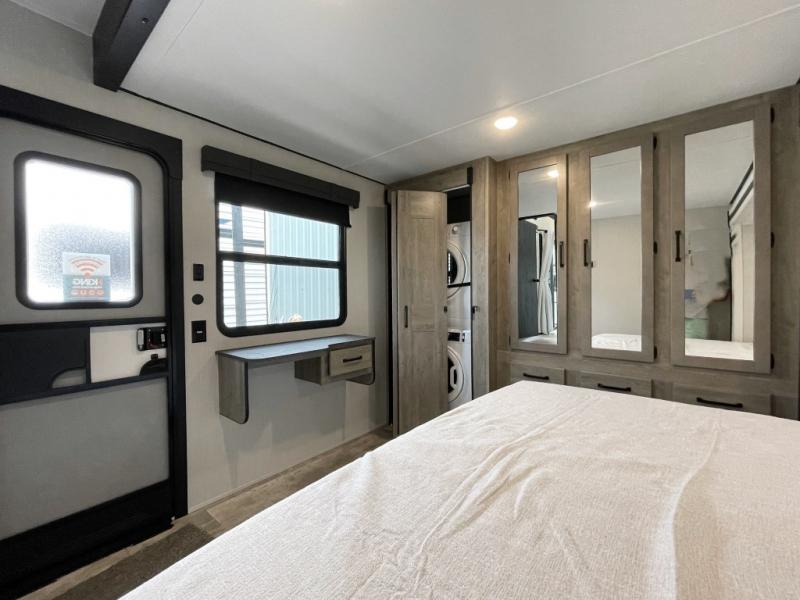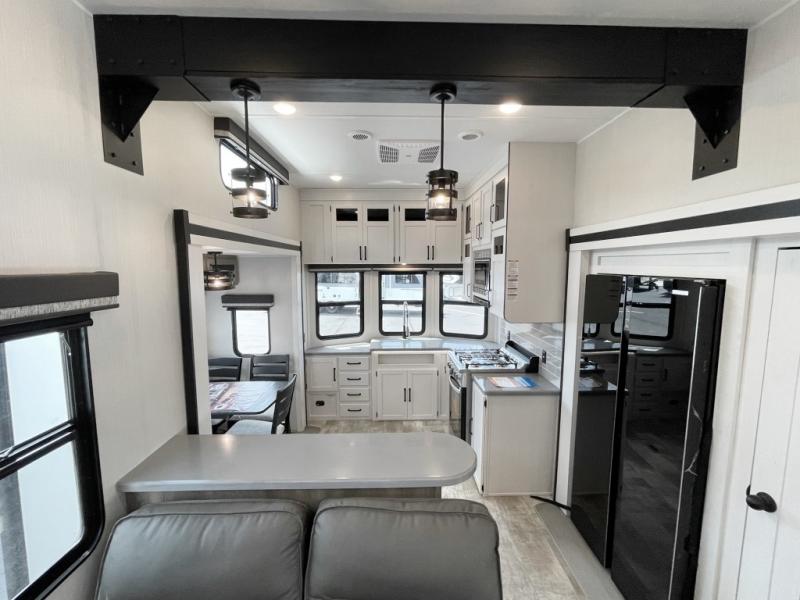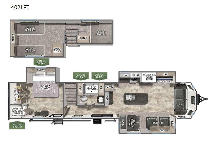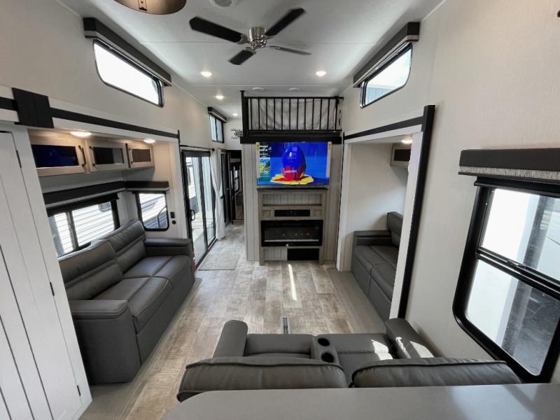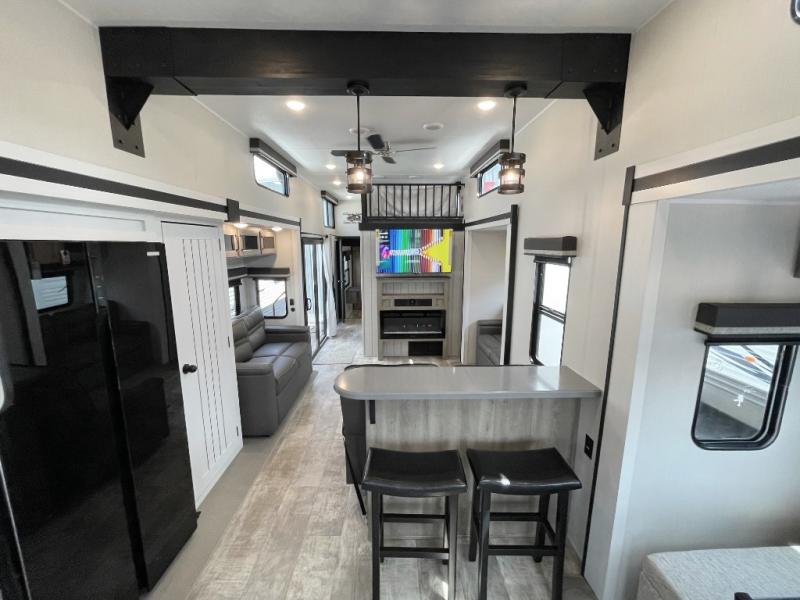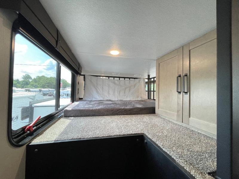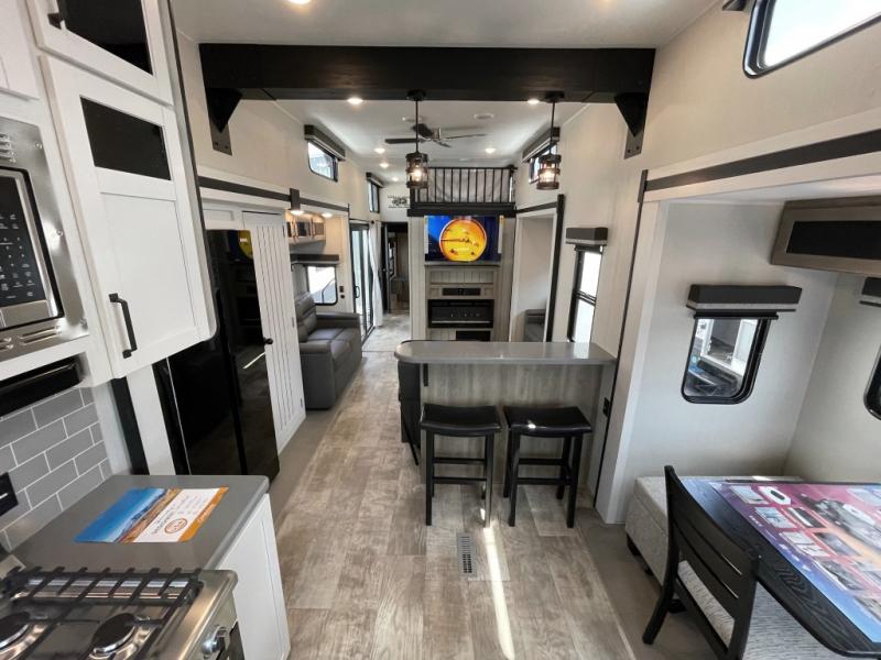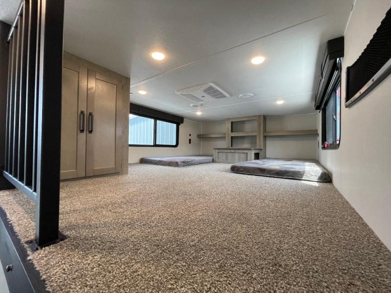 This is the perfect destination trailer for a larger group since it can sleep up to nine campers each night. The little ones will love the double loft areas with three bunk mats and storage space for their things, while you take the rear private bedroom. There is a king bed slide out here, along with a wardrobe/closet for your clothes, plus a second closet with the option to add washer and dryer prep. Everyone can meet in the middle living room to relax on the dual sofas or recliners across from the fireplace and entertainment center. Head to the front of the unit where you'll find the kitchen that includes ample counter space to prep meals, a residential style refrigerator and pantry for food storage, and a free-standing table to dine at. There is also a breakfast nook that overlooks the living area so you can visit with the cook and watch a movie at the same time!