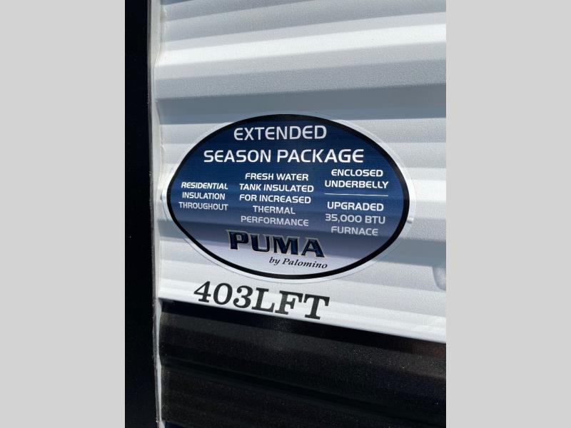Each Puma Destination trailer by Palomino is designed to give you unforgettable getaways to the destination of your choice! The required Value Shopper Loft Package includes Congoleum designer linoleum, night roller shades, LED lighting, and a 24" stainless steel oven with a four burner stove so you can make meals just like you would at home. The tankless water heater is another feature you won't want to camp without, and there is WiFi prep, solar prep, plus optional washer and dryer prep for the option to further customize your trailer. An outside shower is included with the required Loft Package, along with two exterior speakers, solid surface countertops, four stabilizer jacks, and more!