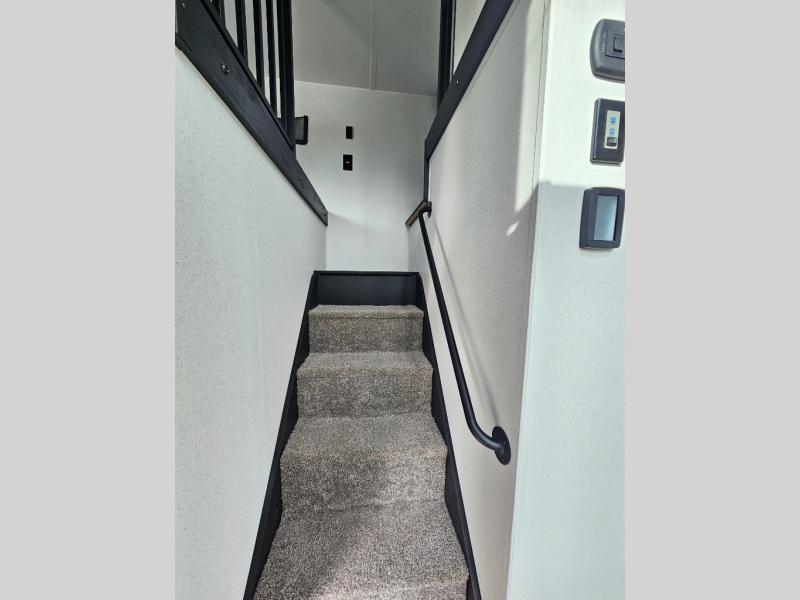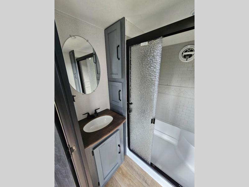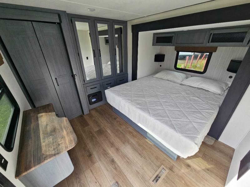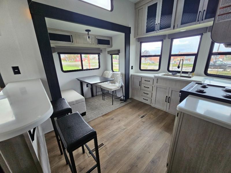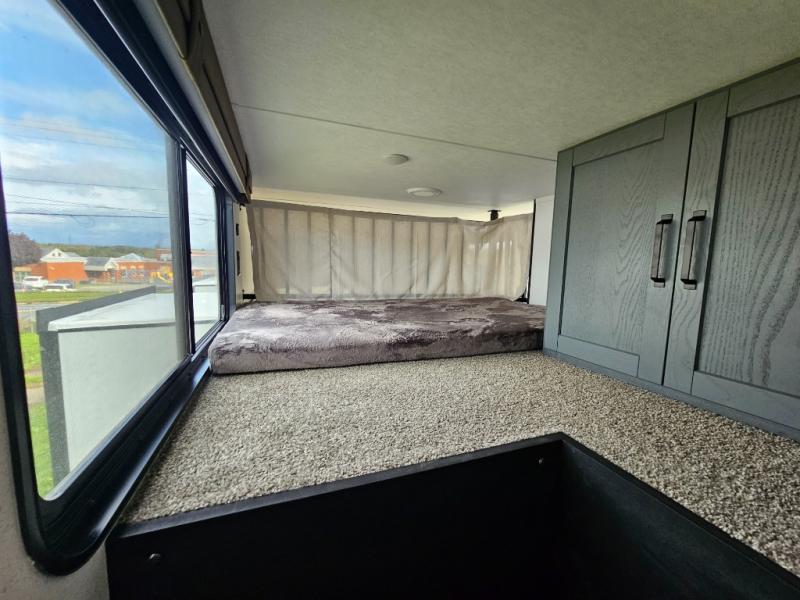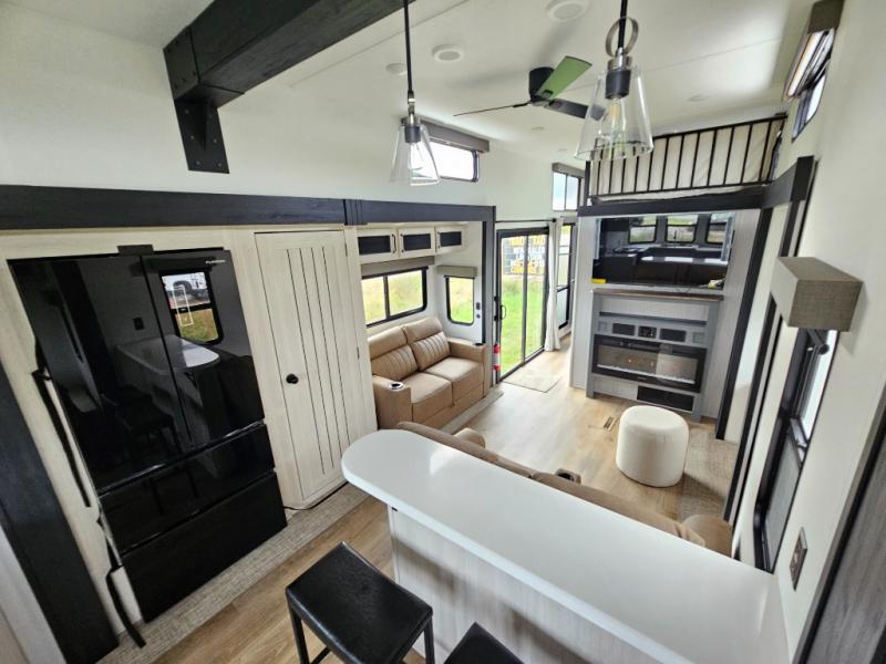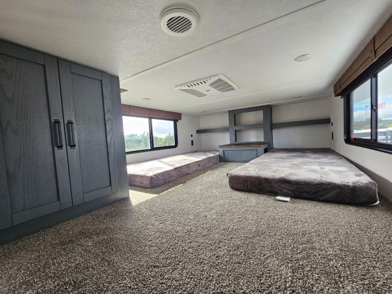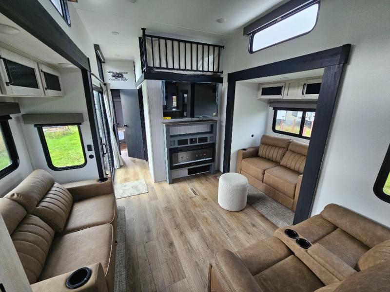 This is the perfect destination trailer for a larger group since it can sleep up to nine campers each night. The little ones will love the double loft areas with three bunk mats and storage space for their things, while you take the rear private bedroom. There is a king bed slide out here, along with a wardrobe/closet for your clothes, plus a second closet with the option to add washer and dryer prep. Everyone can meet in the middle living room to relax on the dual sofas or recliners across from the fireplace and entertainment center. Head to the front of the unit where you'll find the kitchen that includes ample counter space to prep meals, a residential style refrigerator and pantry for food storage, and a free-standing table to dine at. There is also a breakfast nook that overlooks the living area so you can visit with the cook and watch a movie at the same time!