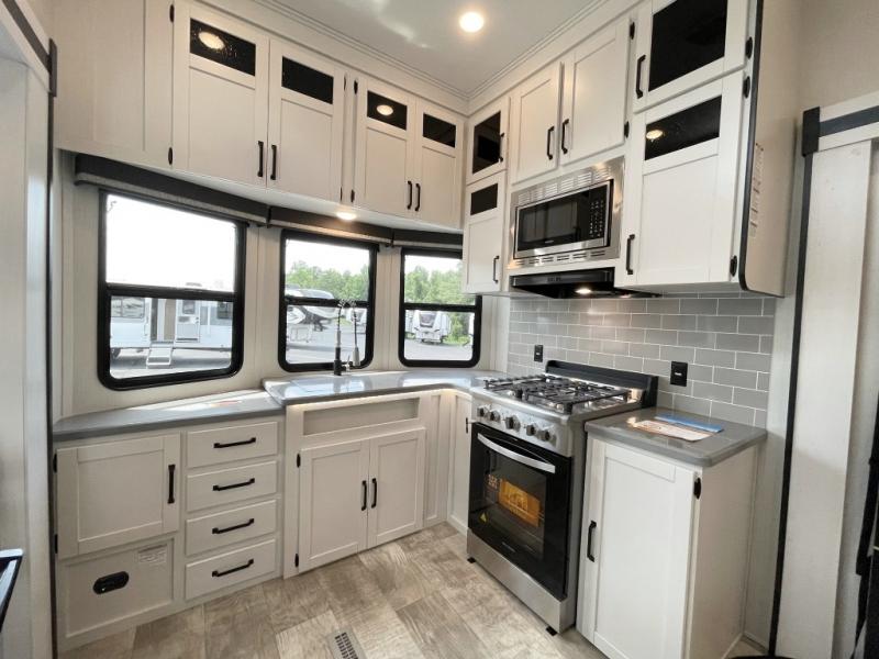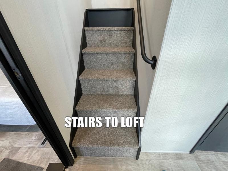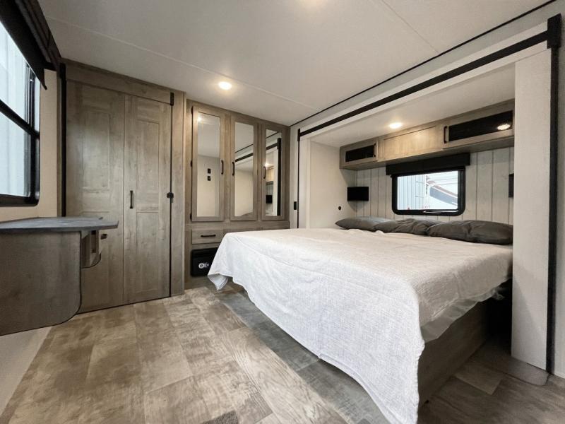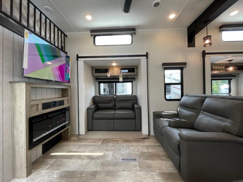 This is the perfect destination trailer for a larger group since it can sleep up to nine campers each night. The little ones will love the double loft areas with three bunk mats and storage space for their things, while you take the rear private bedroom. There is a king bed slide out here, along with a wardrobe/closet for your clothes, plus a second closet with the option to add washer and dryer prep. Everyone can meet in the middle living room to relax on the dual sofas or recliners across from the fireplace and entertainment center. Head to the front of the unit where you'll find the kitchen that includes ample counter space to prep meals, a residential style refrigerator and pantry for food storage, and a free-standing table to dine at. There is also a breakfast nook that overlooks the living area so you can visit with the cook and watch a movie at the same time!