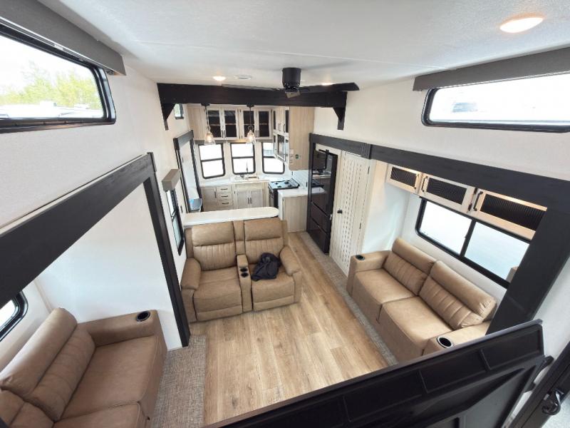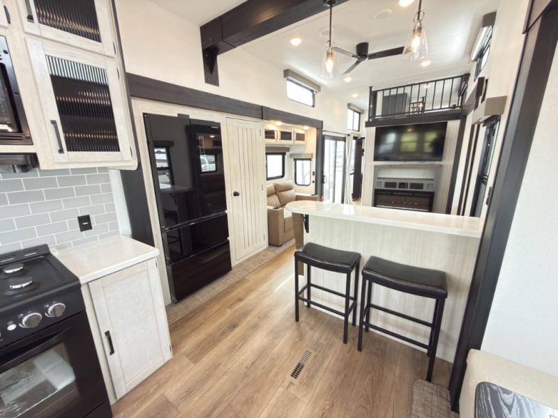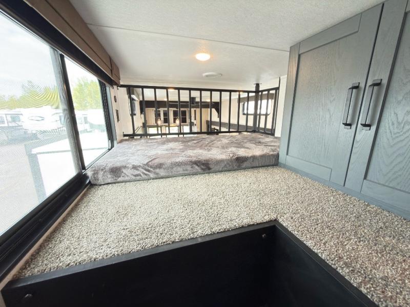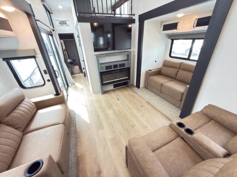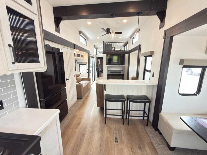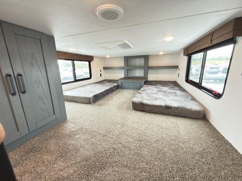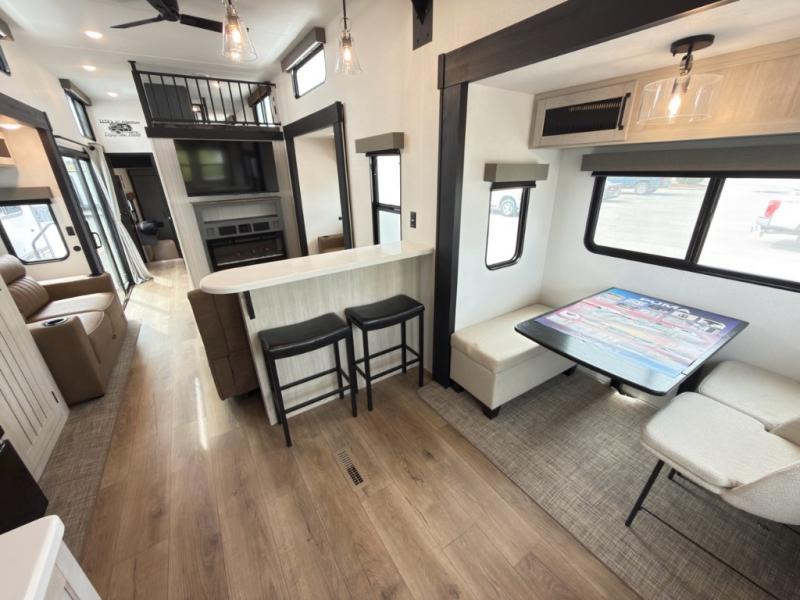 This is the perfect destination trailer for a larger group since it can sleep up to nine campers each night. The little ones will love the double loft areas with three bunk mats and storage space for their things, while you take the rear private bedroom. There is a king bed slide out here, along with a wardrobe/closet for your clothes, plus a second closet with the option to add washer and dryer prep. Everyone can meet in the middle living room to relax on the dual sofas or recliners across from the fireplace and entertainment center. Head to the front of the unit where you'll find the kitchen that includes ample counter space to prep meals, a residential style refrigerator and pantry for food storage, and a free-standing table to dine at. There is also a breakfast nook that overlooks the living area so you can visit with the cook and watch a movie at the same time!