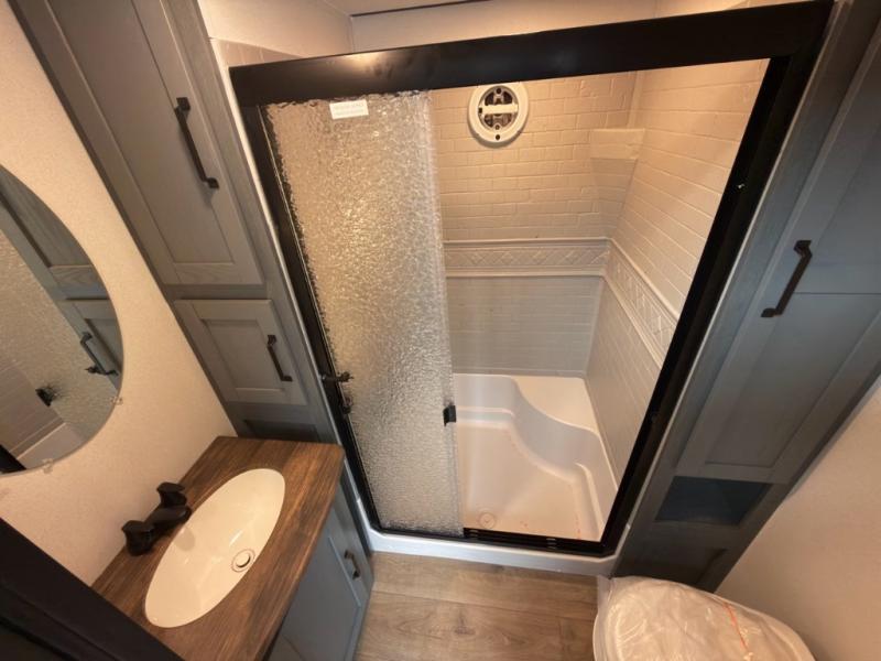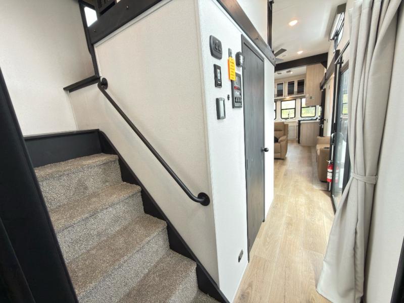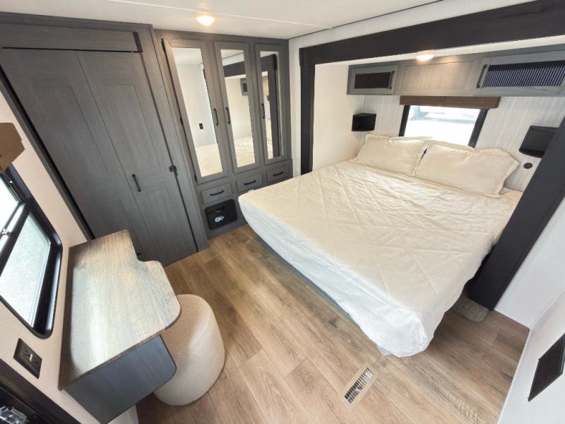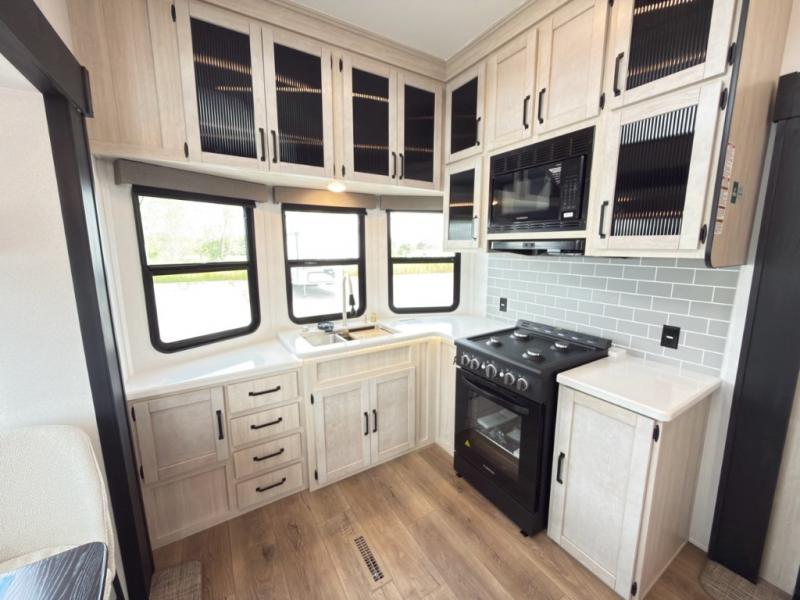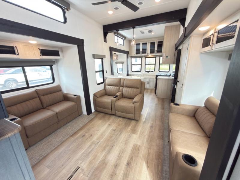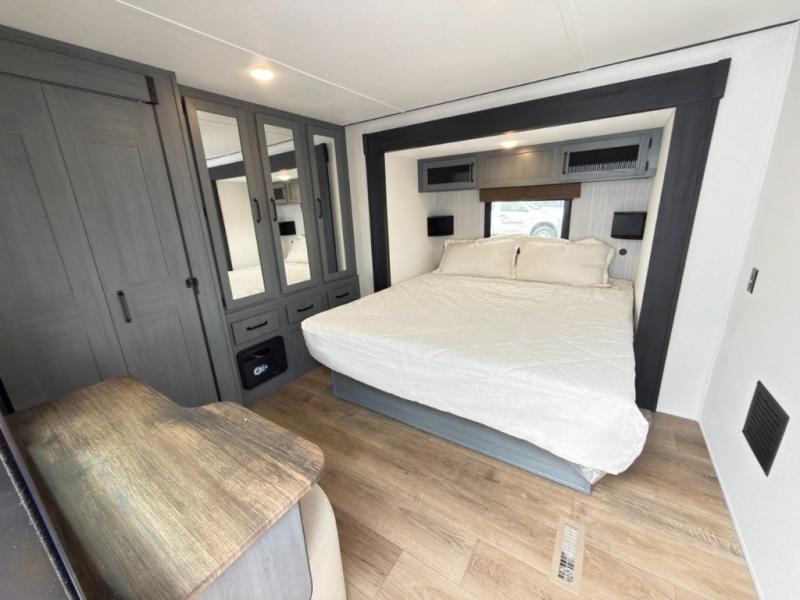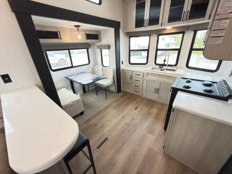This is the perfect destination trailer for a larger group since it can sleep up to nine campers each night. The little ones will love the double loft areas with three bunk mats and storage space for their things, while you take the rear private bedroom. There is a king bed slide out here, along with a wardrobe/closet for your clothes, plus a second closet with the option to add washer and dryer prep. Everyone can meet in the middle living room to relax on the dual sofas or recliners across from the fireplace and entertainment center. Head to the front of the unit where you'll find the kitchen that includes ample counter space to prep meals, a residential style refrigerator and pantry for food storage, and a free-standing table to dine at. There is also a breakfast nook that overlooks the living area so you can visit with the cook and watch a movie at the same time!