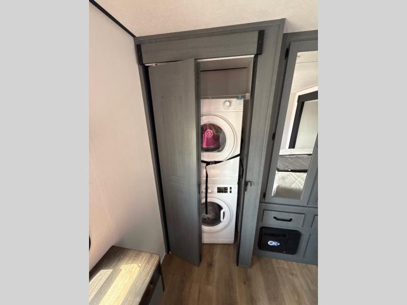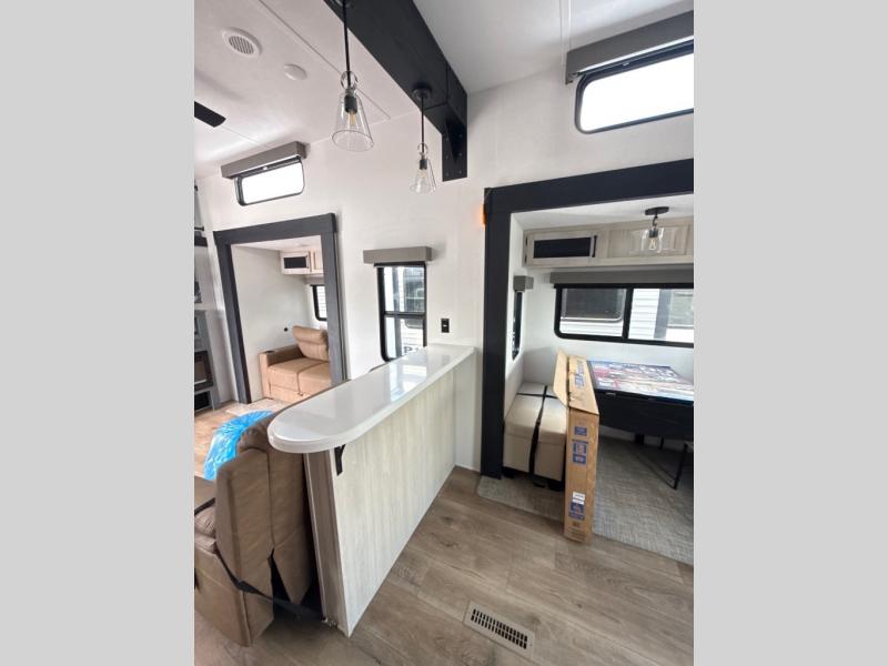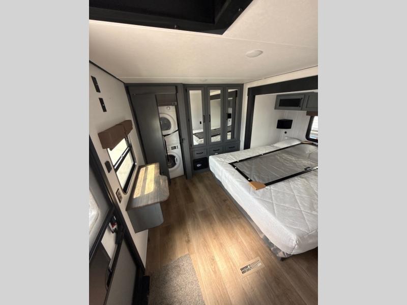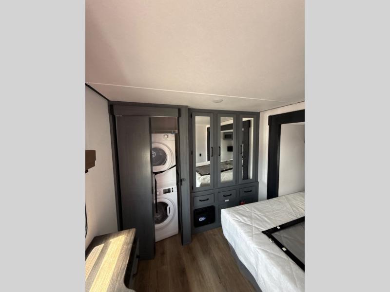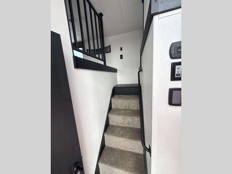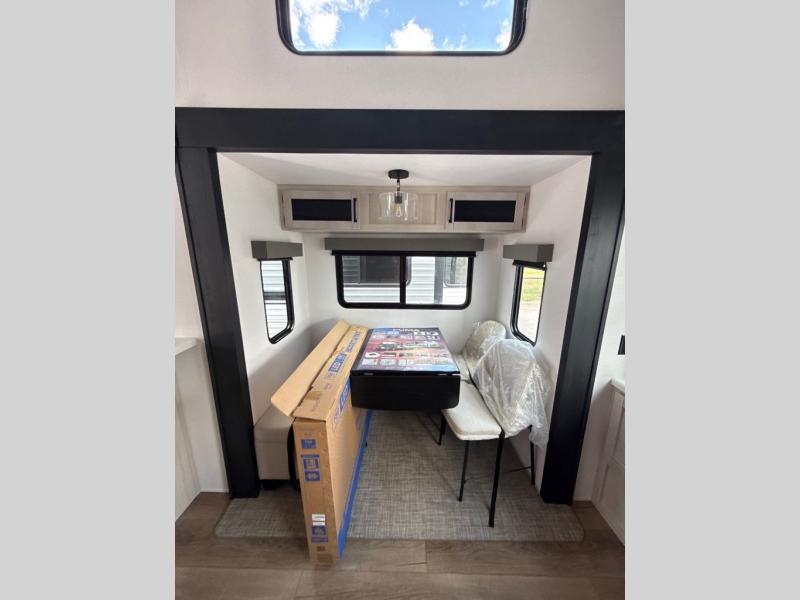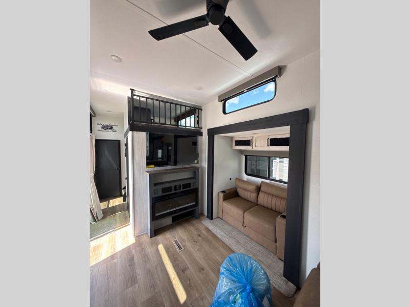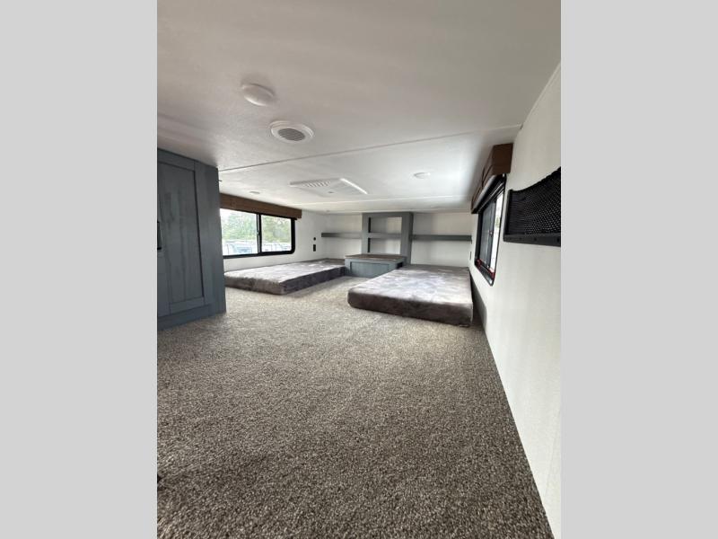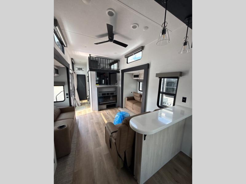 This is the perfect destination trailer for a larger group since it can sleep up to nine campers each night. The little ones will love the double loft areas with three bunk mats and storage space for their things, while you take the rear private bedroom. There is a king bed slide out here, along with a wardrobe/closet for your clothes, plus a second closet with the option to add washer and dryer prep. Everyone can meet in the middle living room to relax on the dual sofas or recliners across from the fireplace and entertainment center. Head to the front of the unit where you'll find the kitchen that includes ample counter space to prep meals, a residential style refrigerator and pantry for food storage, and a free-standing table to dine at. There is also a breakfast nook that overlooks the living area so you can visit with the cook and watch a movie at the same time!
